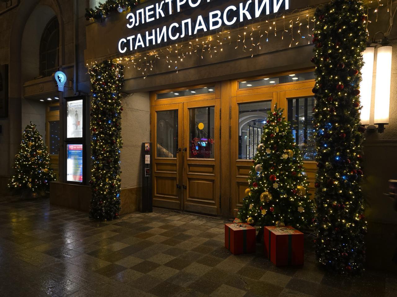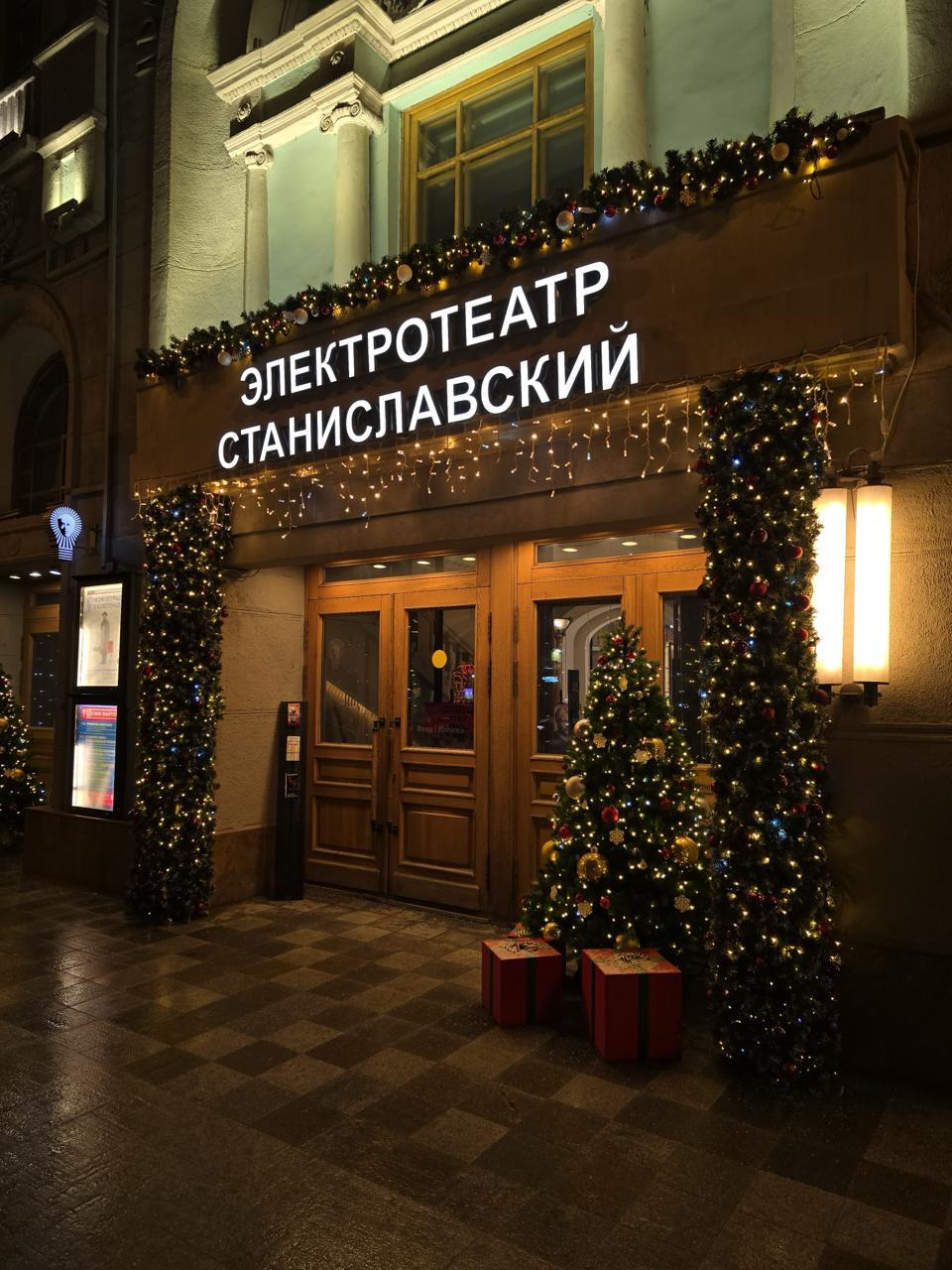 Электротеатр Станиславский в Москве к зимнему сезону получил праздничное оформление: фасад подчеркнула тёплая гирлянда-бахрома, колонны были покрыты елочными ветвями, украшены гирляндой-нитью и декорированы световыми акцентами. Входная группа дополнилась искусственными ёлками с шарами и подарочными коробками, создавая уютную атмосферу для гостей театра.