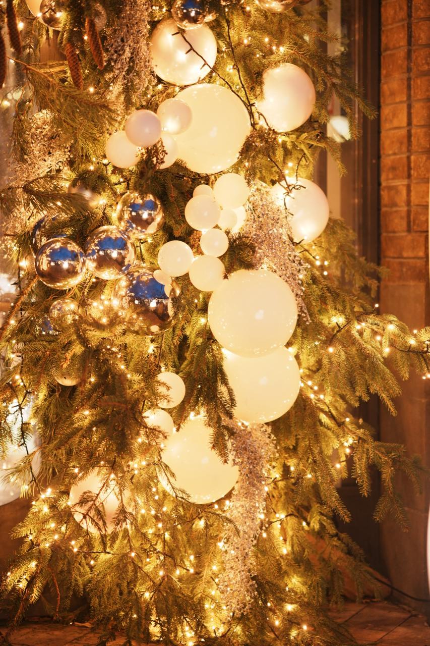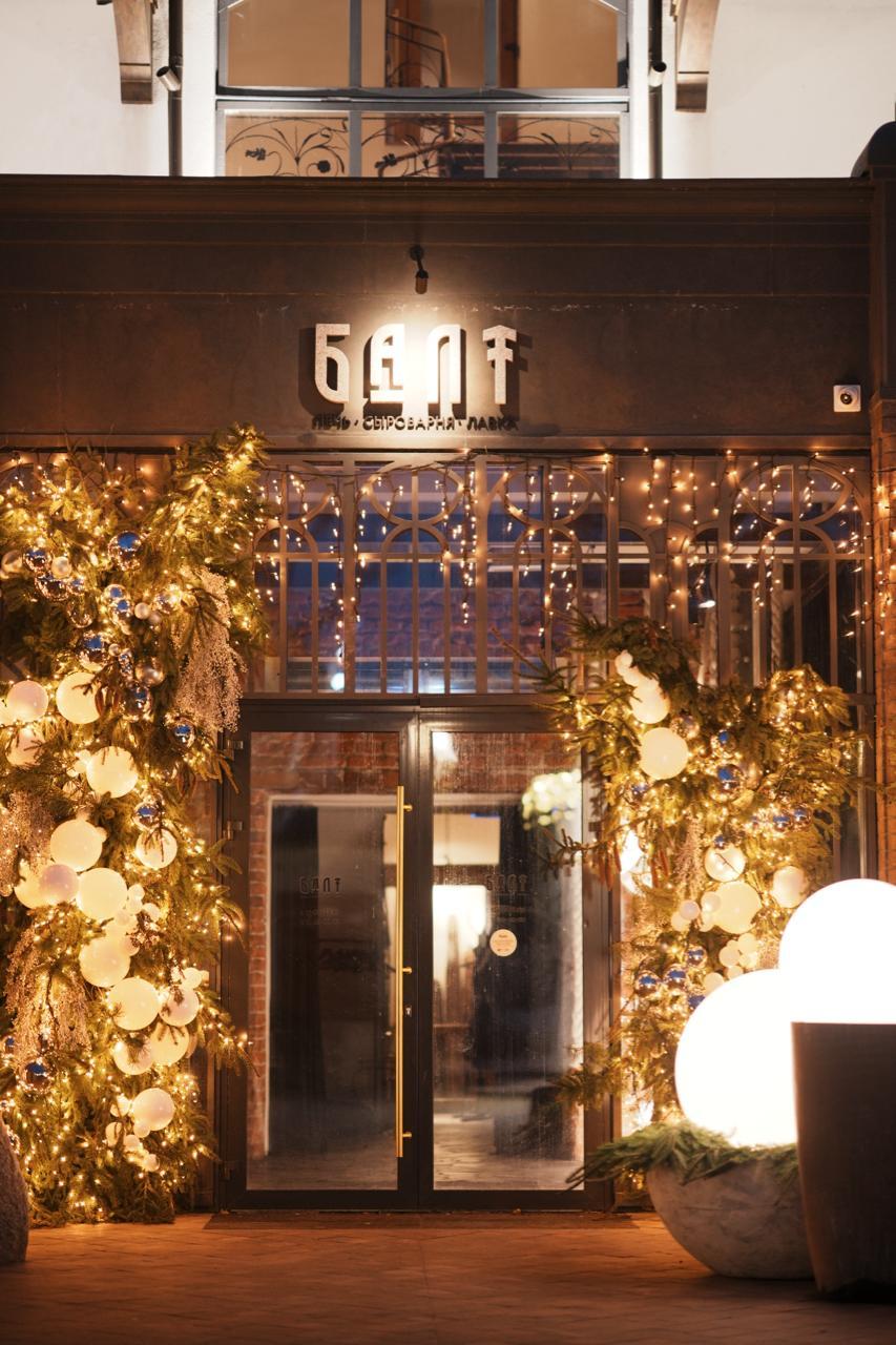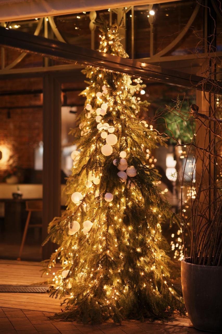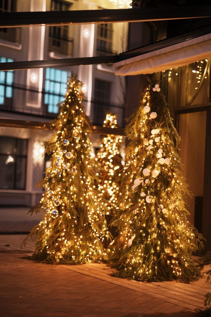 Для ресторана в праздничный сезон создана яркая и в то же время уютная атмосфера. Входная группа украшена гирляндой-бахромой тёплого свечения, а рядом установлены ели, декорированные гирляндой-нитью и крупными шарами. Свет мягко рассеивается по веткам, создавая ощущение праздника и тепла ещё на подходе к ресторану.