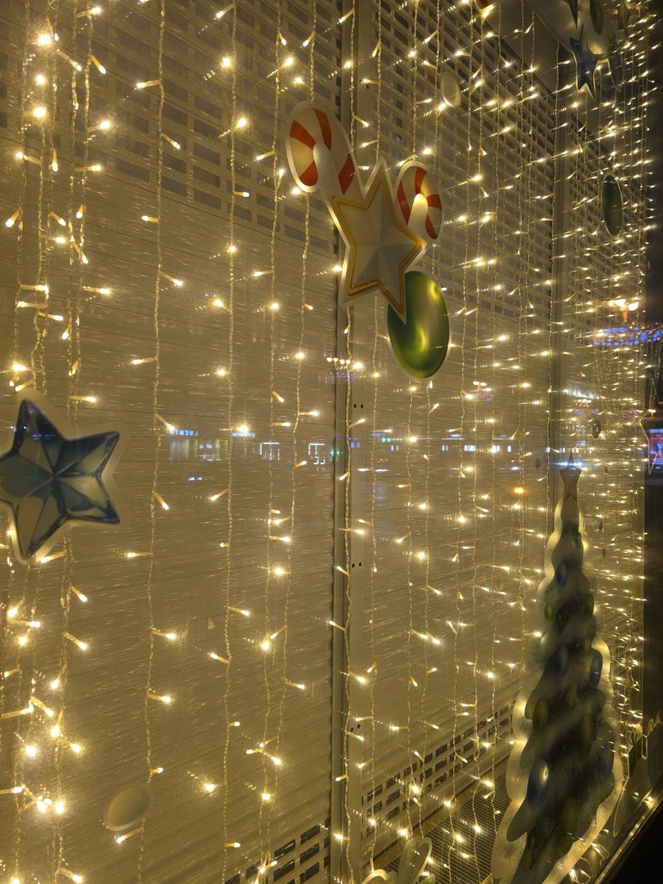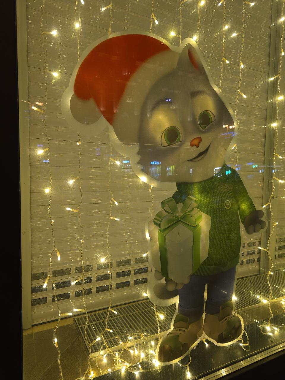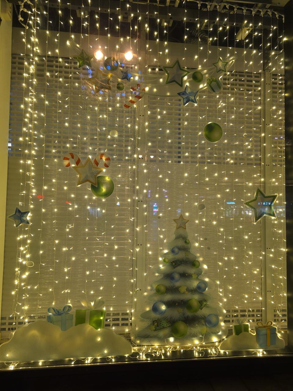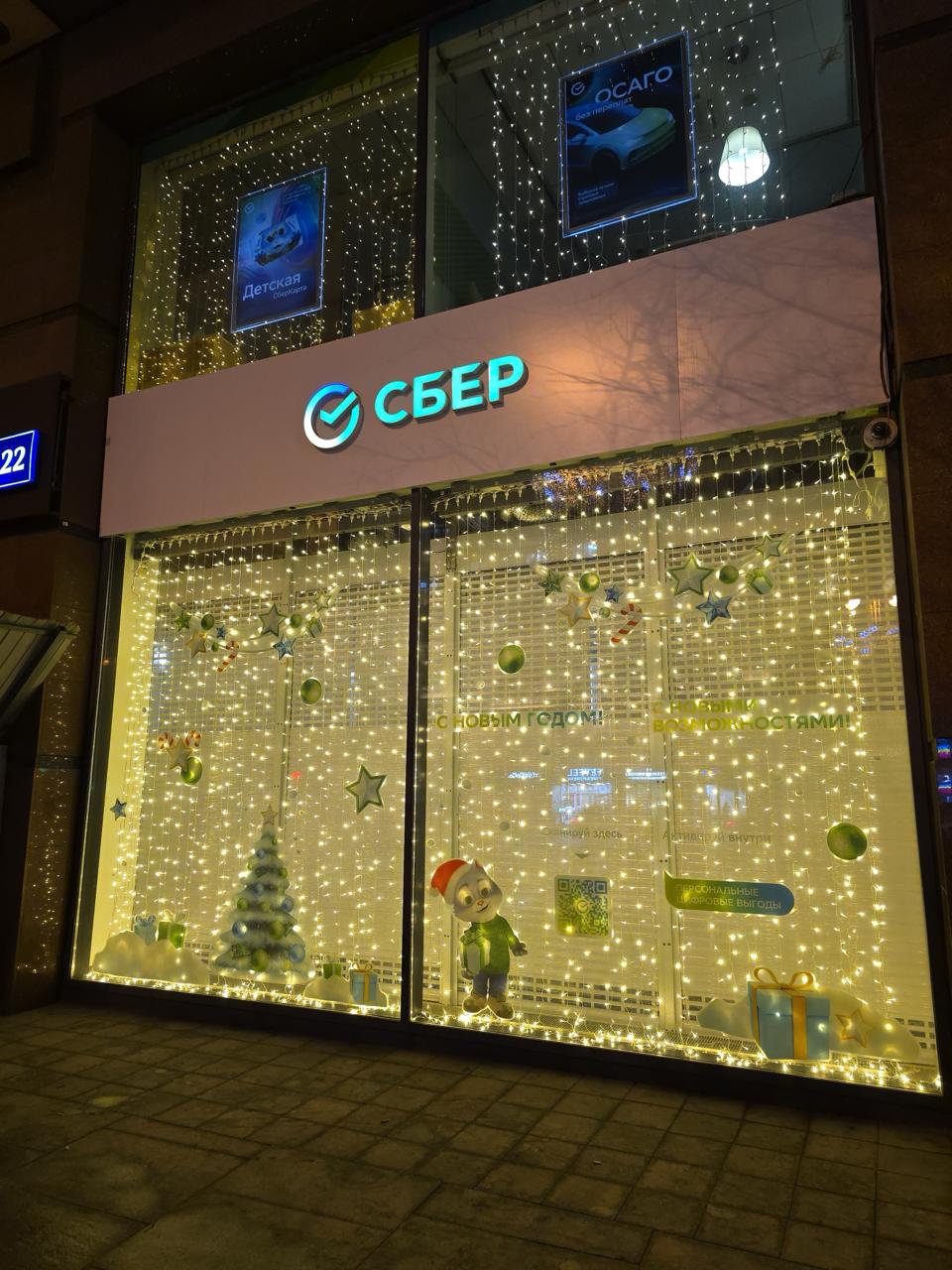 Фасад и витрины банка украшены гирляндами занавес с тёплым белым свечением. Свет мягко рассеивается по стеклу, создавая эффект золотого сияния. В оформлении использованы новогодние элементы — ёлка, подарки, звёзды и декоративные фигуры, благодаря чему пространство выглядит празднично, но при этом остаётся сдержанным и элегантным.