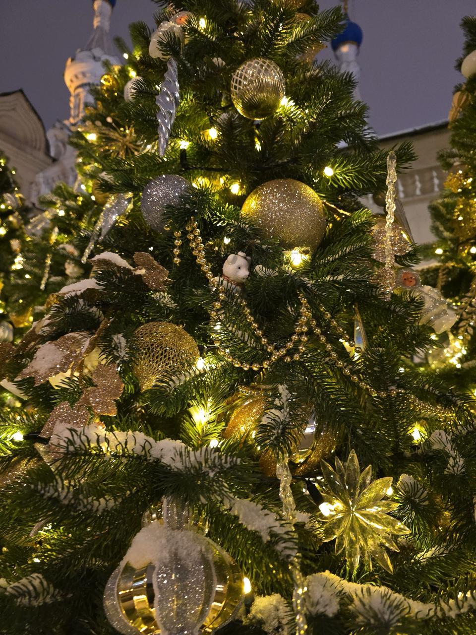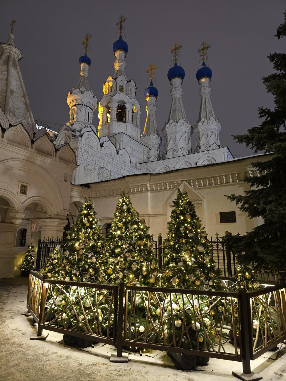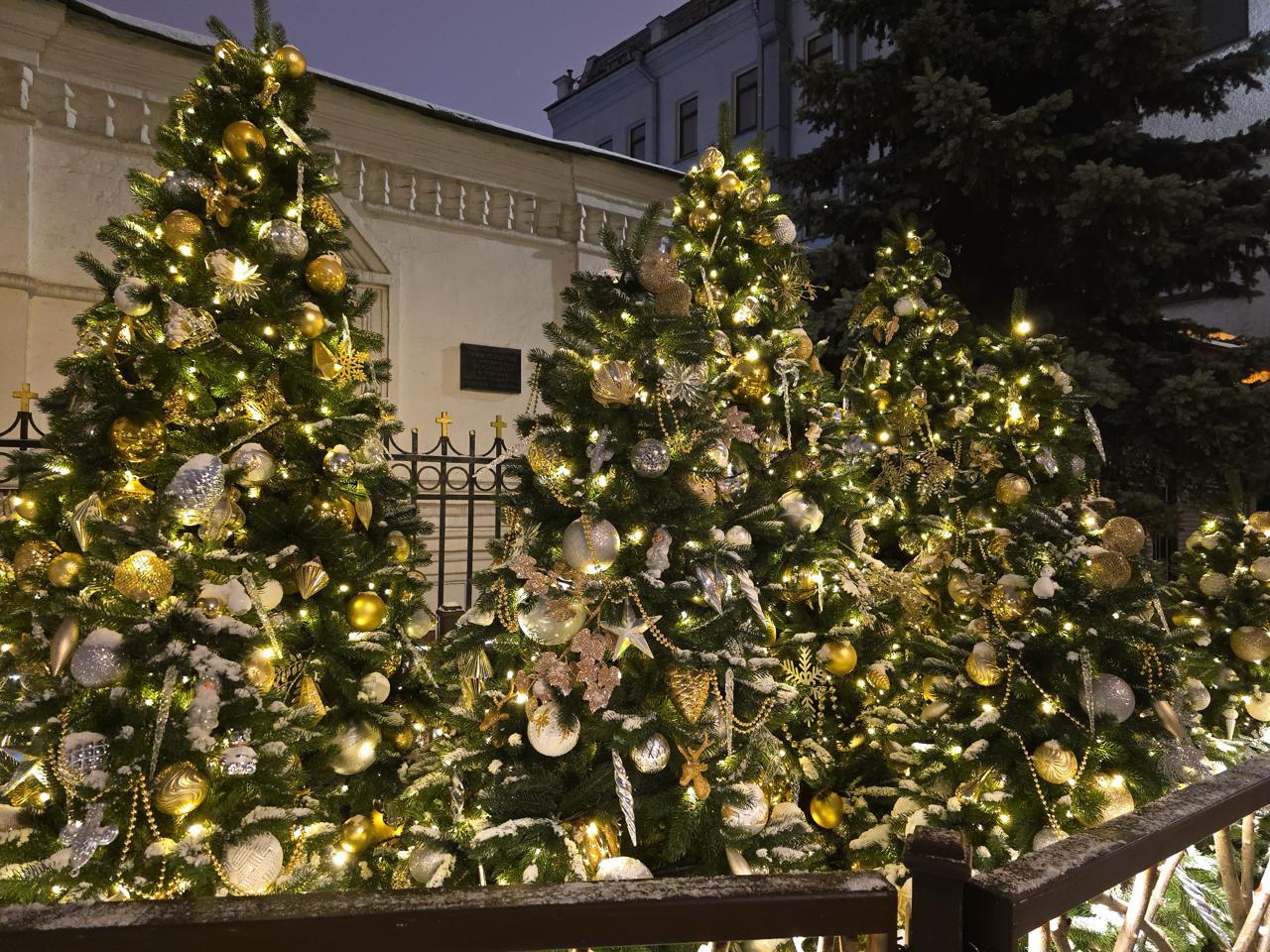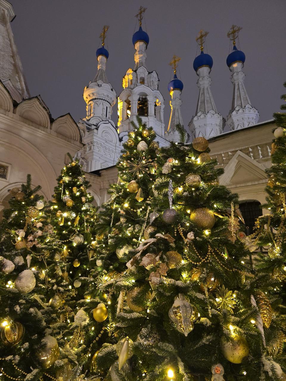 У входа в церковь в Москве установлены праздничные ели, украшенные гирляндой-нитью тёплого белого свечения и золотыми шарами. Подсветка гармонично сочетается с архитектурой здания, подчёркивая его торжественный облик. Атмосфера получилась праздничной и светлой, создающей ощущение уюта для прихожан и гостей.