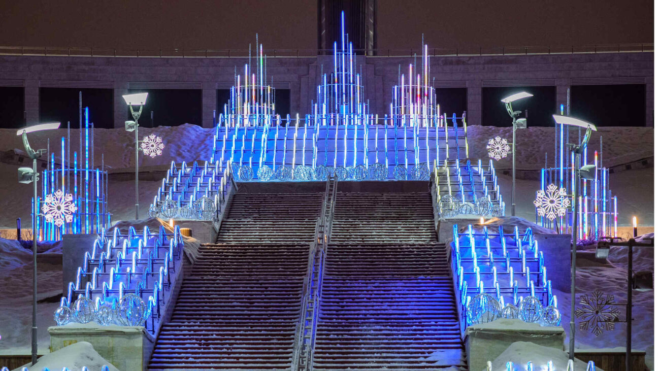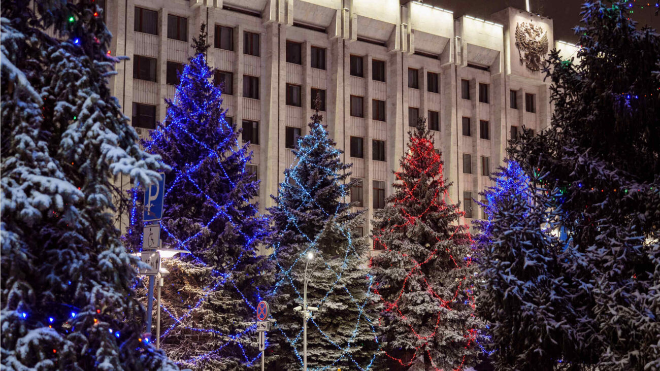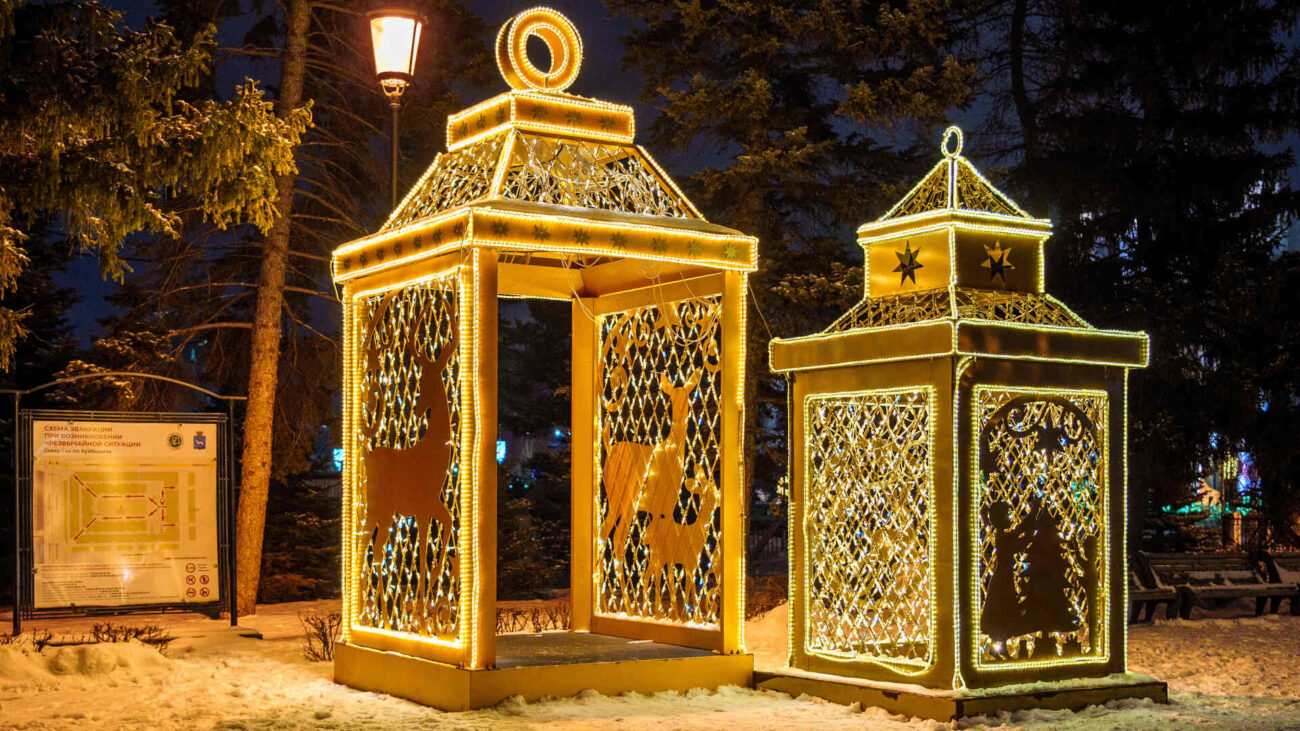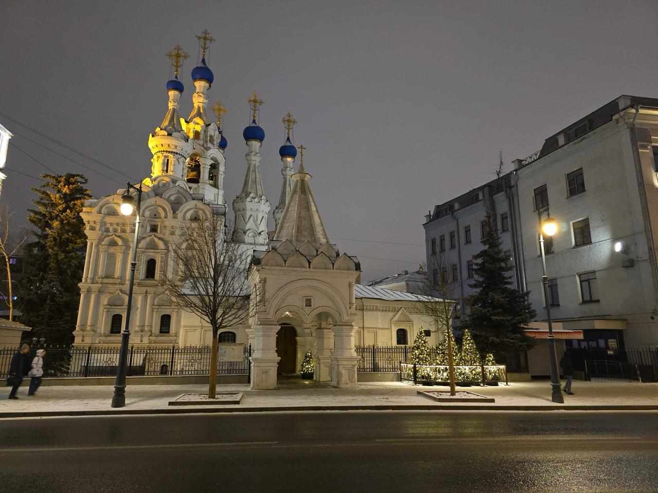 У входа в церковь в Москве установлены праздничные ели, украшенные гирляндой-нитью тёплого белого свечения и золотыми шарами. Подсветка гармонично сочетается с архитектурой здания, подчёркивая его торжественный облик. Атмосфера получилась праздничной и светлой, создающей ощущение уюта для прихожан и гостей.