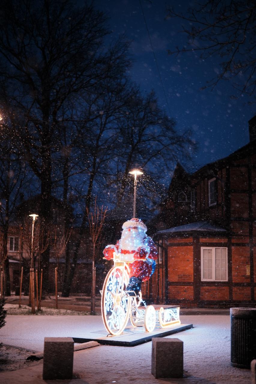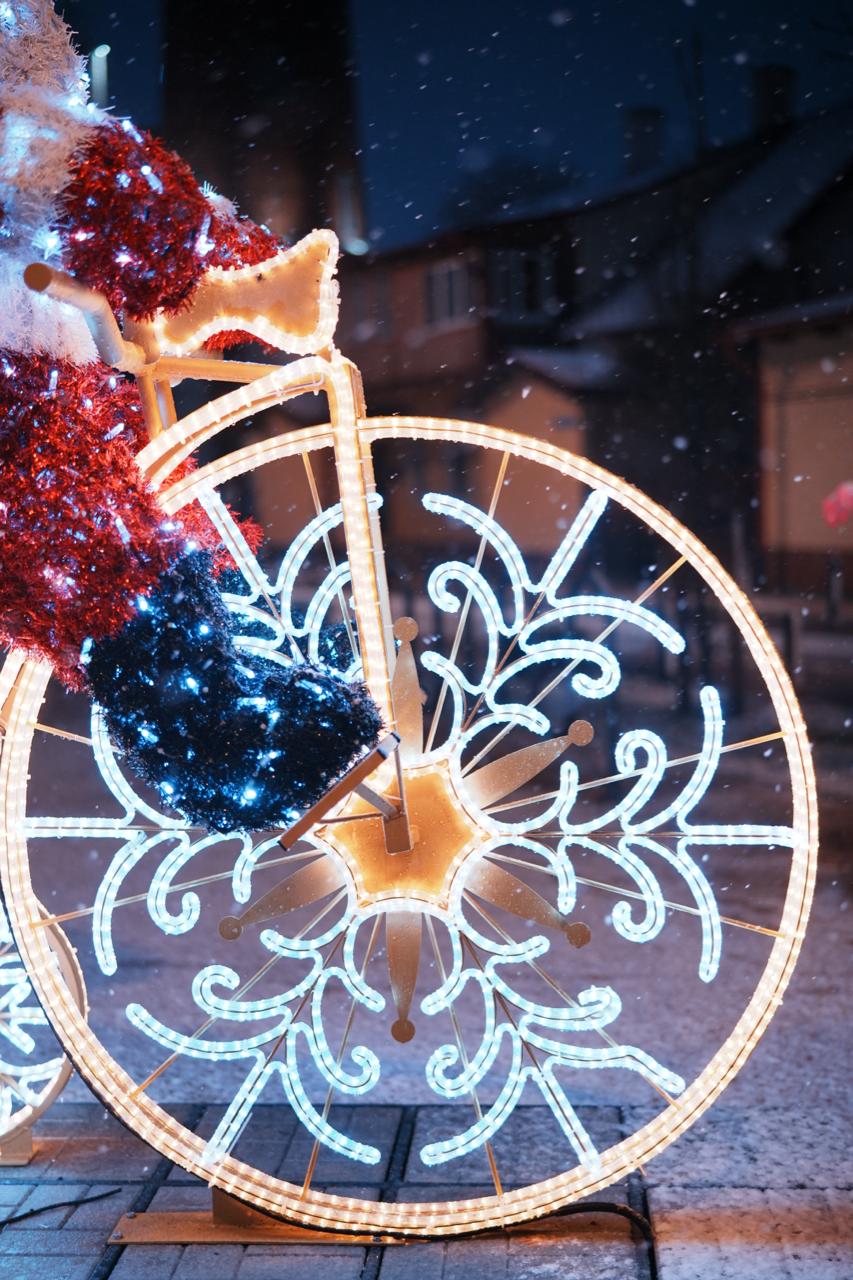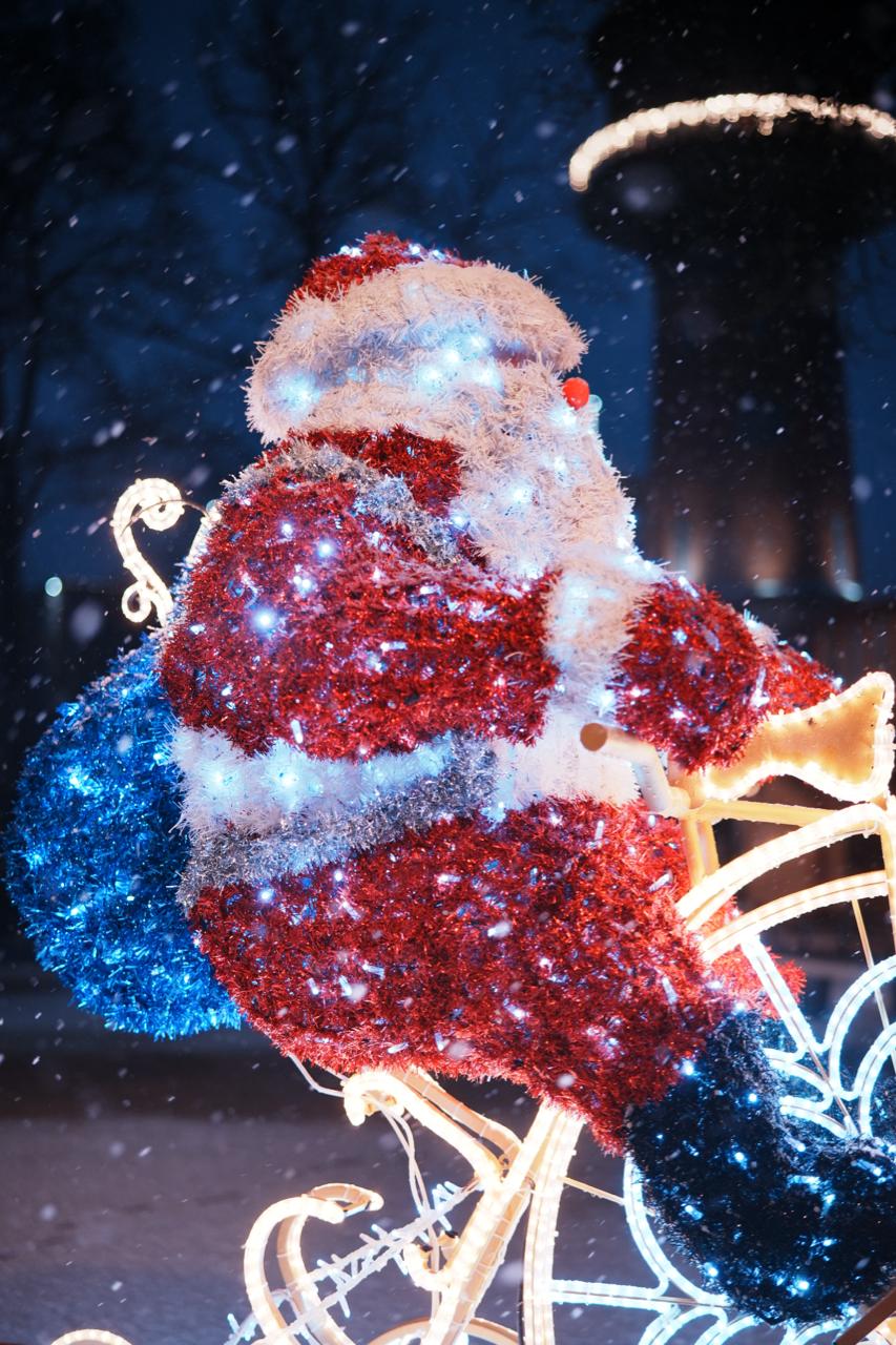 Фигура выполнена в натуральной цветовой палитре: красный костюм, белая отделка и голубой мешок с подарками. Каркас подсвечен светодиодами холодного свечения, колёса оформлены узорами в виде снежинок. Мишурные элементы придают фигуре фактуру и плотность, а свет мягко рассеивается по поверхности.
