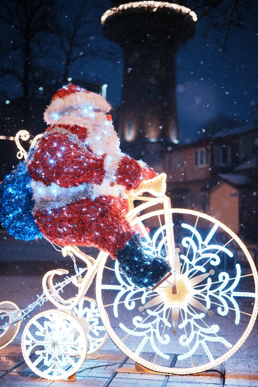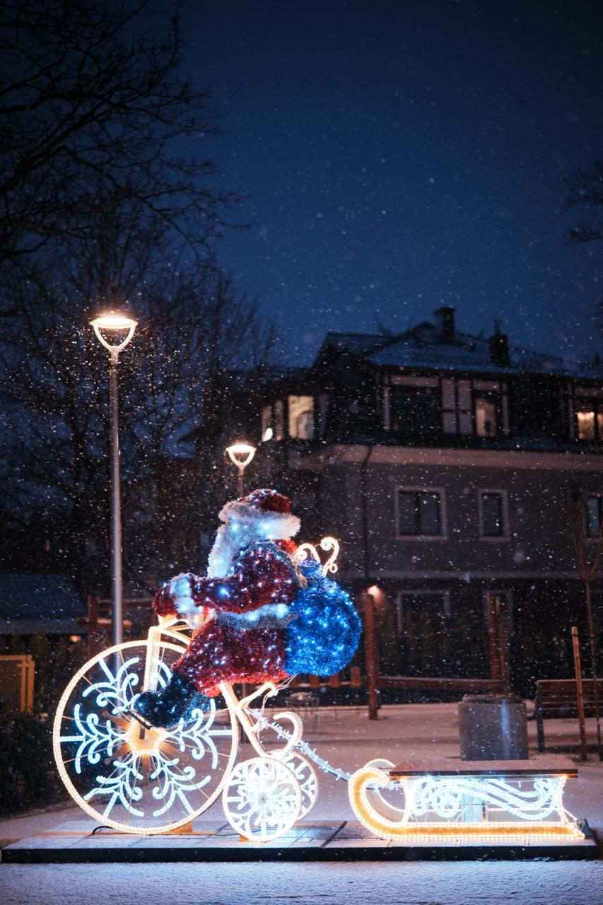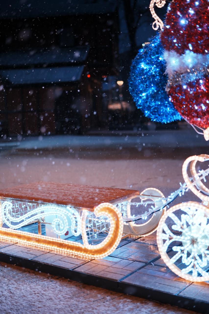 Фигура выполнена в натуральной цветовой палитре: красный костюм, белая отделка и голубой мешок с подарками. Каркас подсвечен светодиодами холодного свечения, колёса оформлены узорами в виде снежинок. Мишурные элементы придают фигуре фактуру и плотность, а свет мягко рассеивается по поверхности.