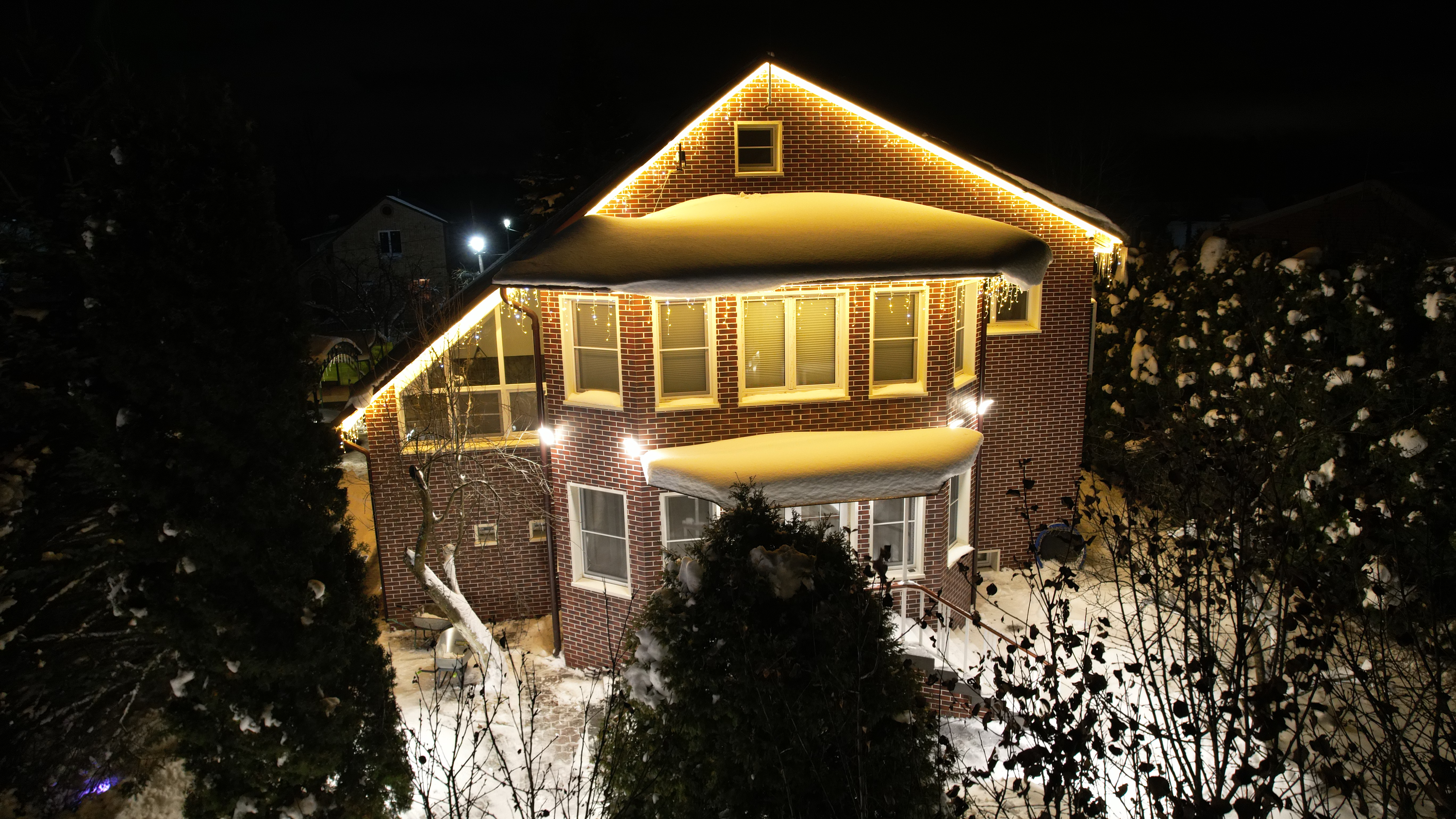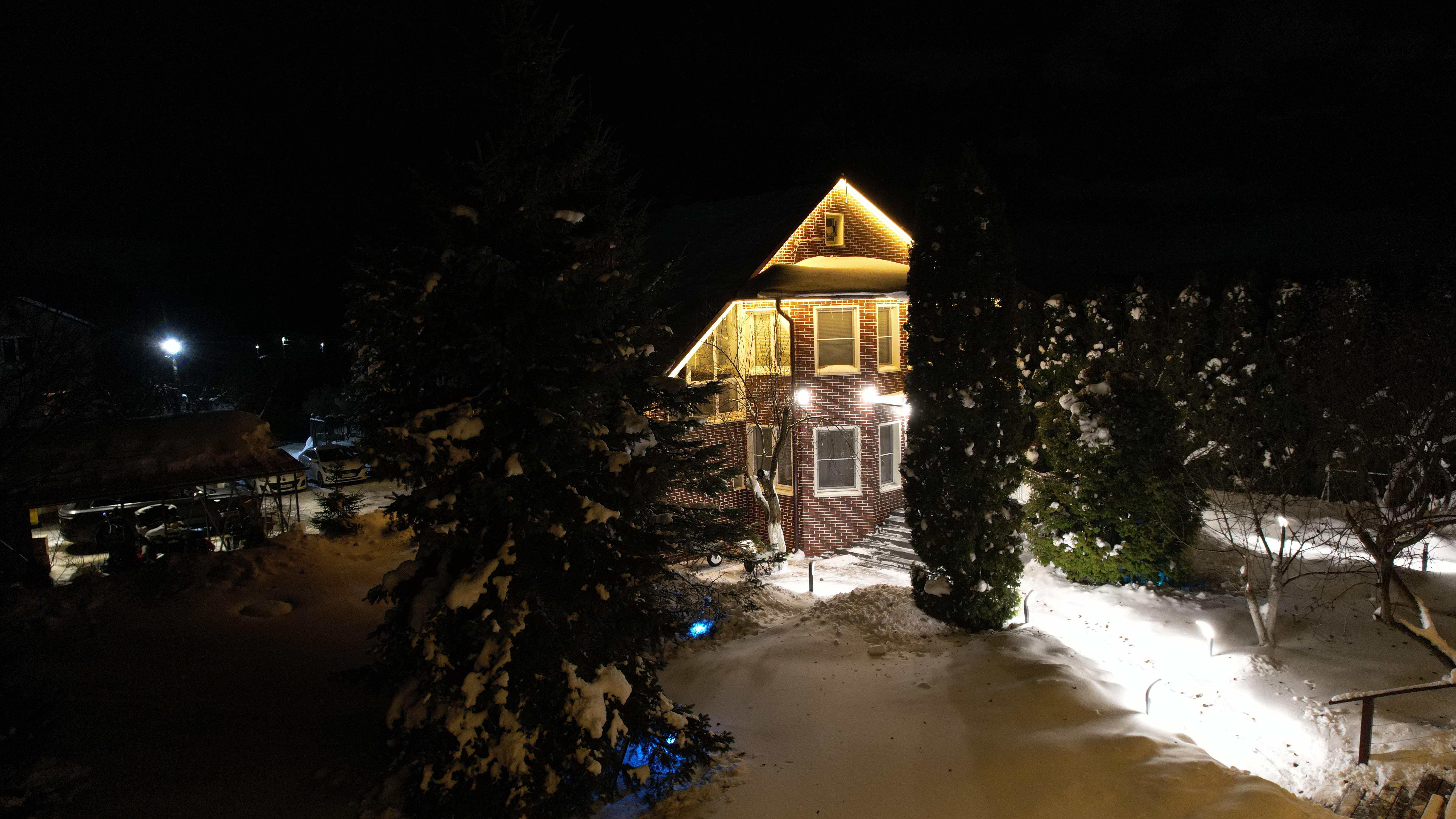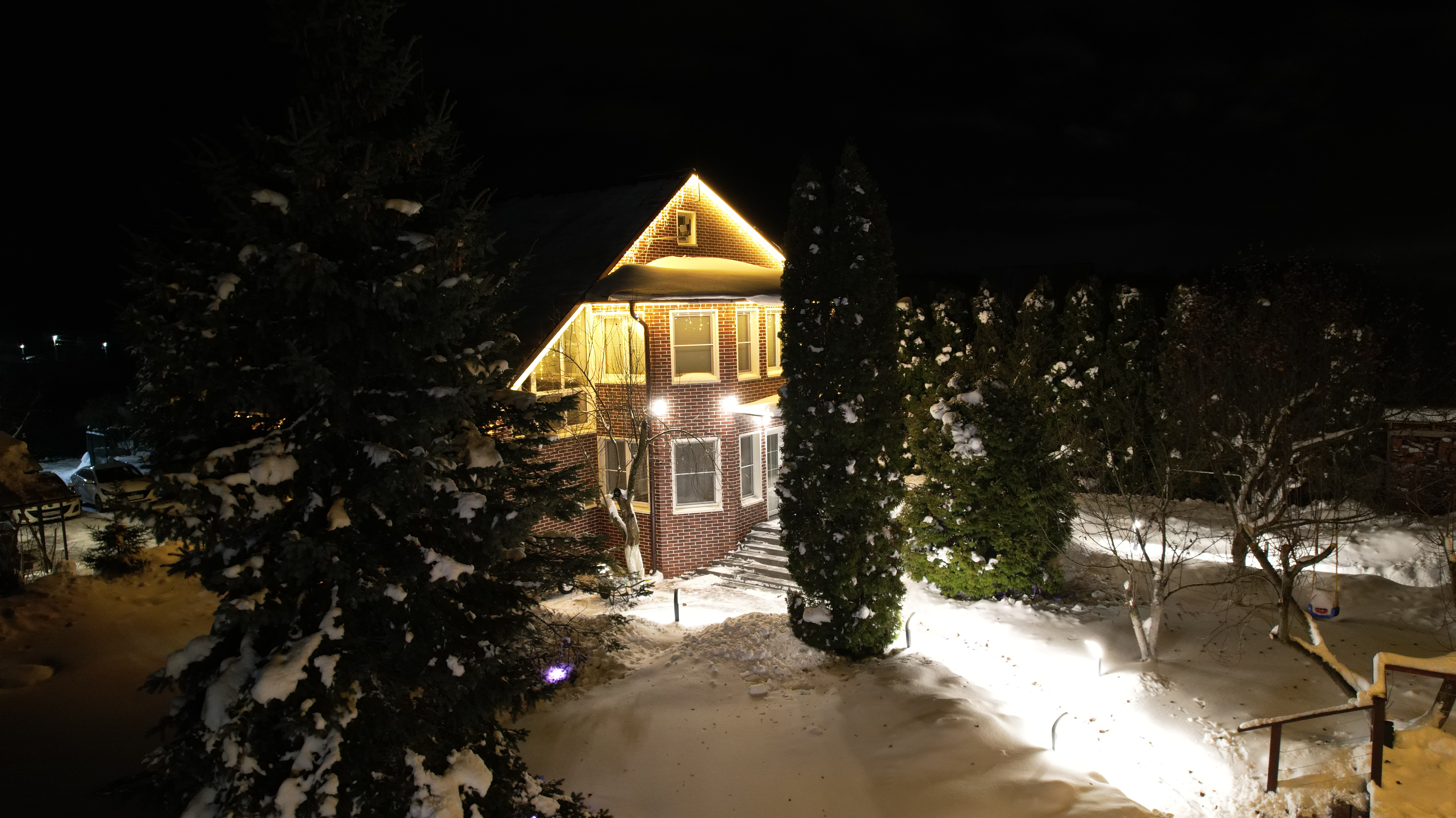 Основная задача — подчеркнуть архитектуру классического кирпичного дома, не перегружая светом. Решение — комбинированная подсветка, сочетающая контурное освещение и направленные прожекторы. Это позволило выделить форму кровли, акцентировать входную группу и придать зданию цельный вечерний облик.