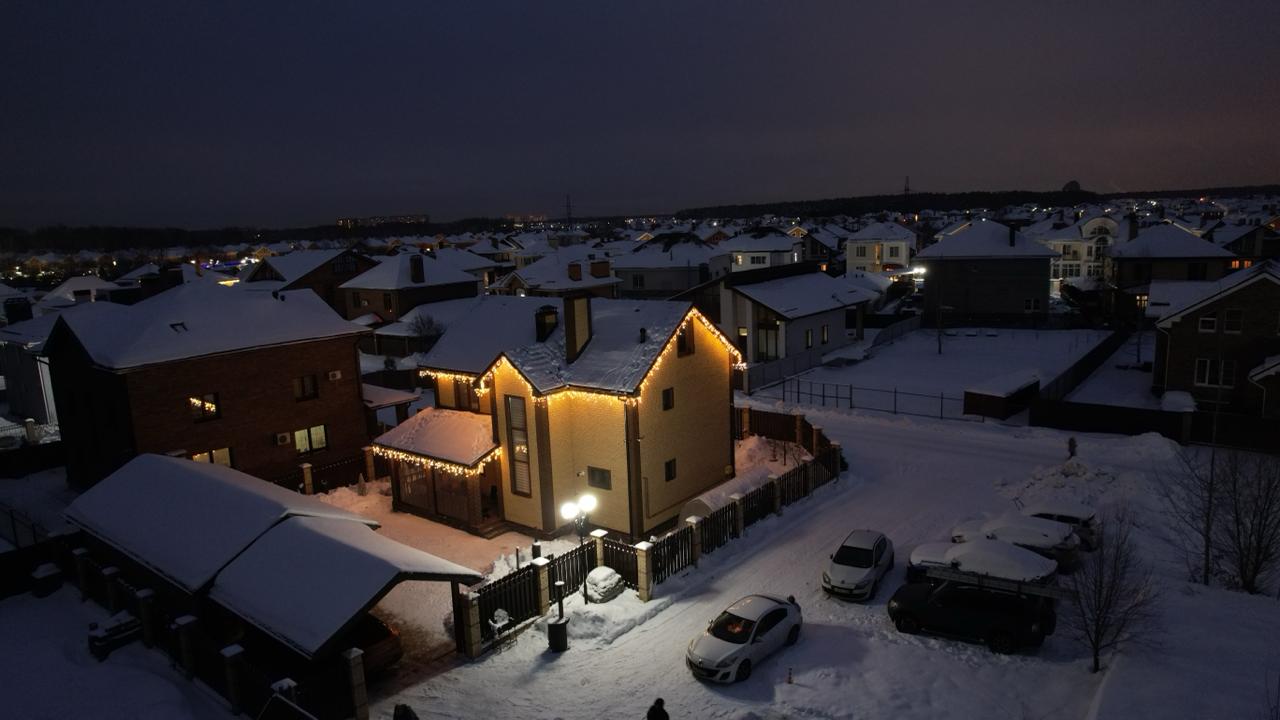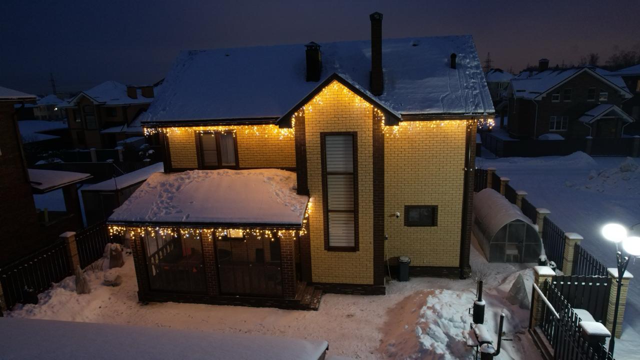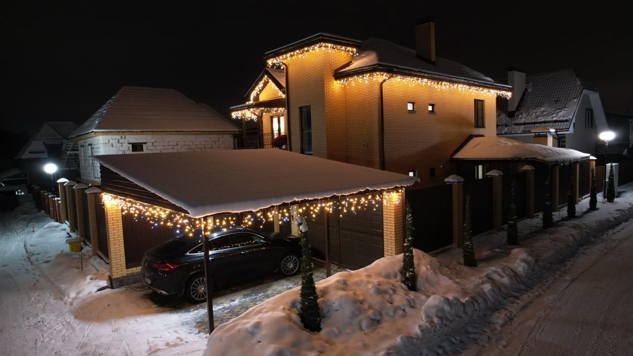 Загородный дом оформлен гирляндой бахрома тёплого свечения по всему периметру кровли — фасад, терраса, крыльцо и навес для машины. Свет мягко отражается от светлого кирпича и снега, создавая атмосферу уюта и праздника.