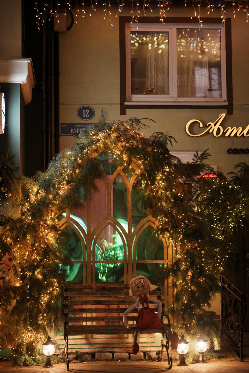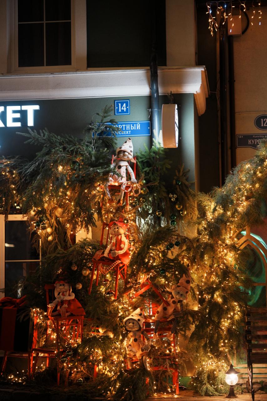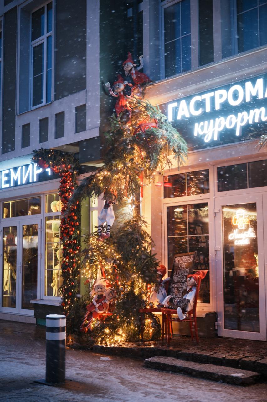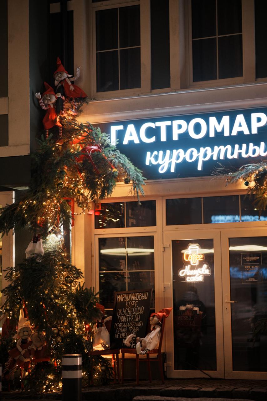 Фасад гастромаркета оформлен в тёплых праздничных тонах: гирлянды с мягким свечением, живые еловые ветви и неоновые акценты создают атмосферу зимнего уюта. В оформлении использованы мягкие игрушки, подарочные коробки и декоративные элементы, которые добавляют сценичности и делают пространство фотогеничным.