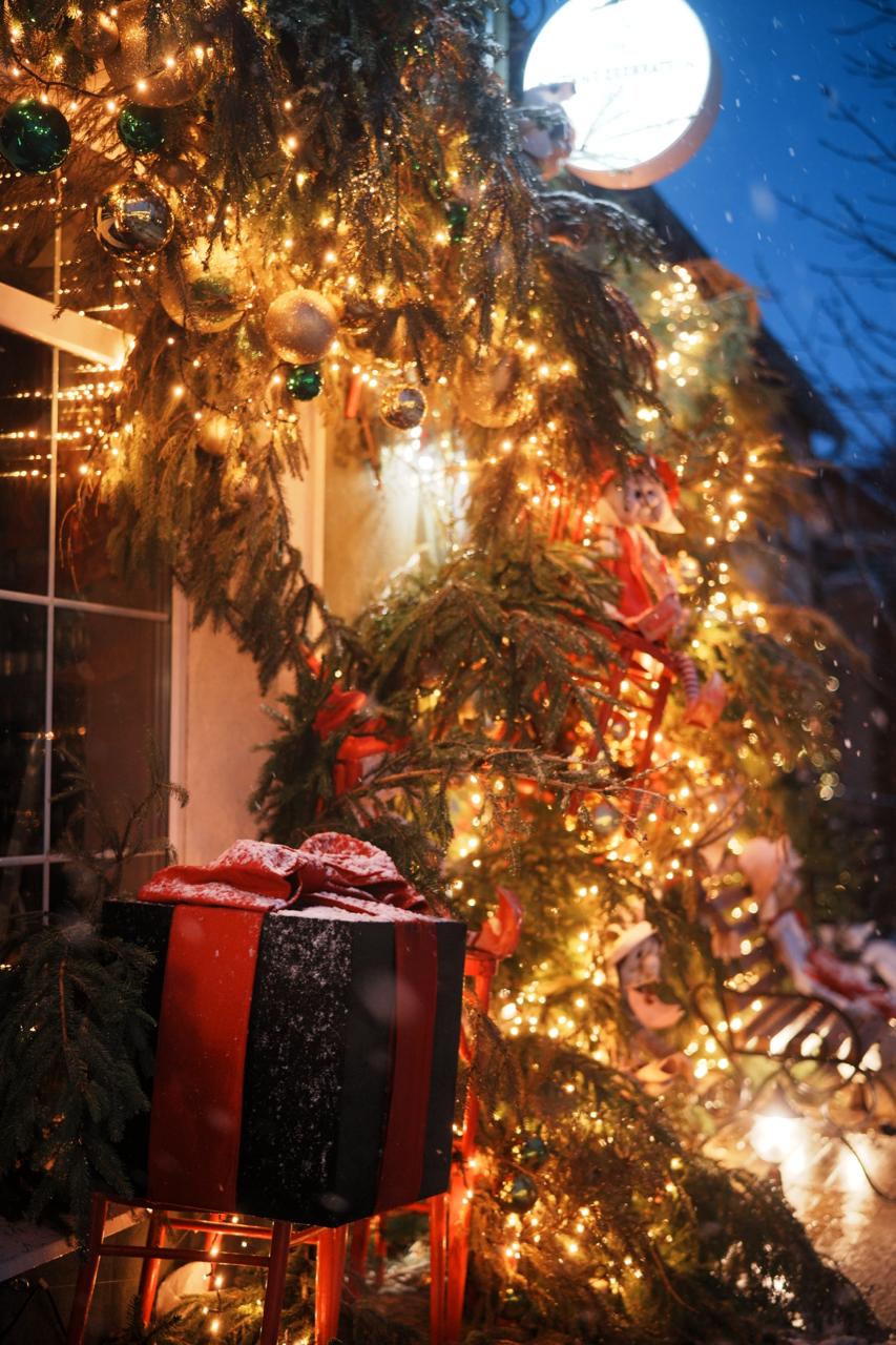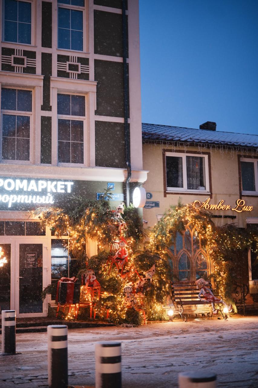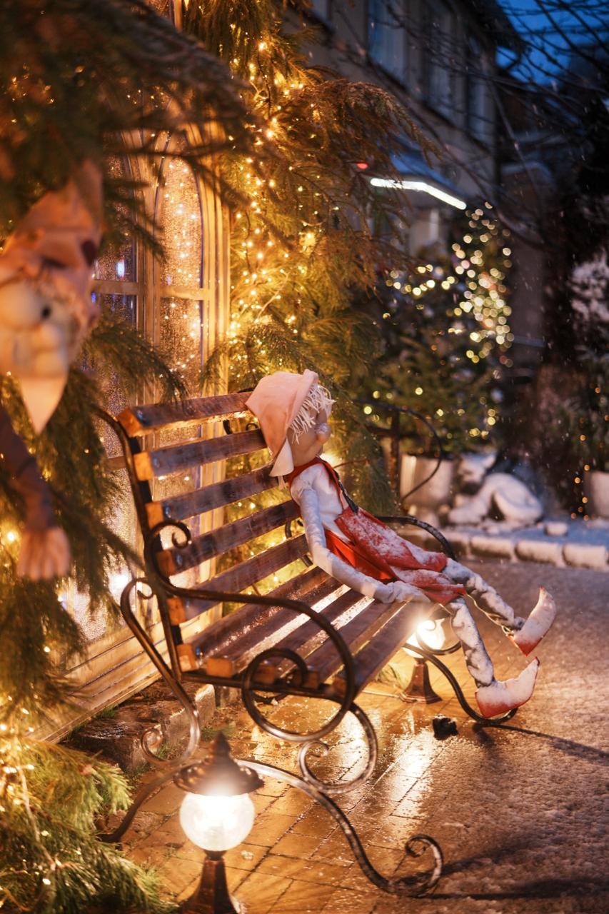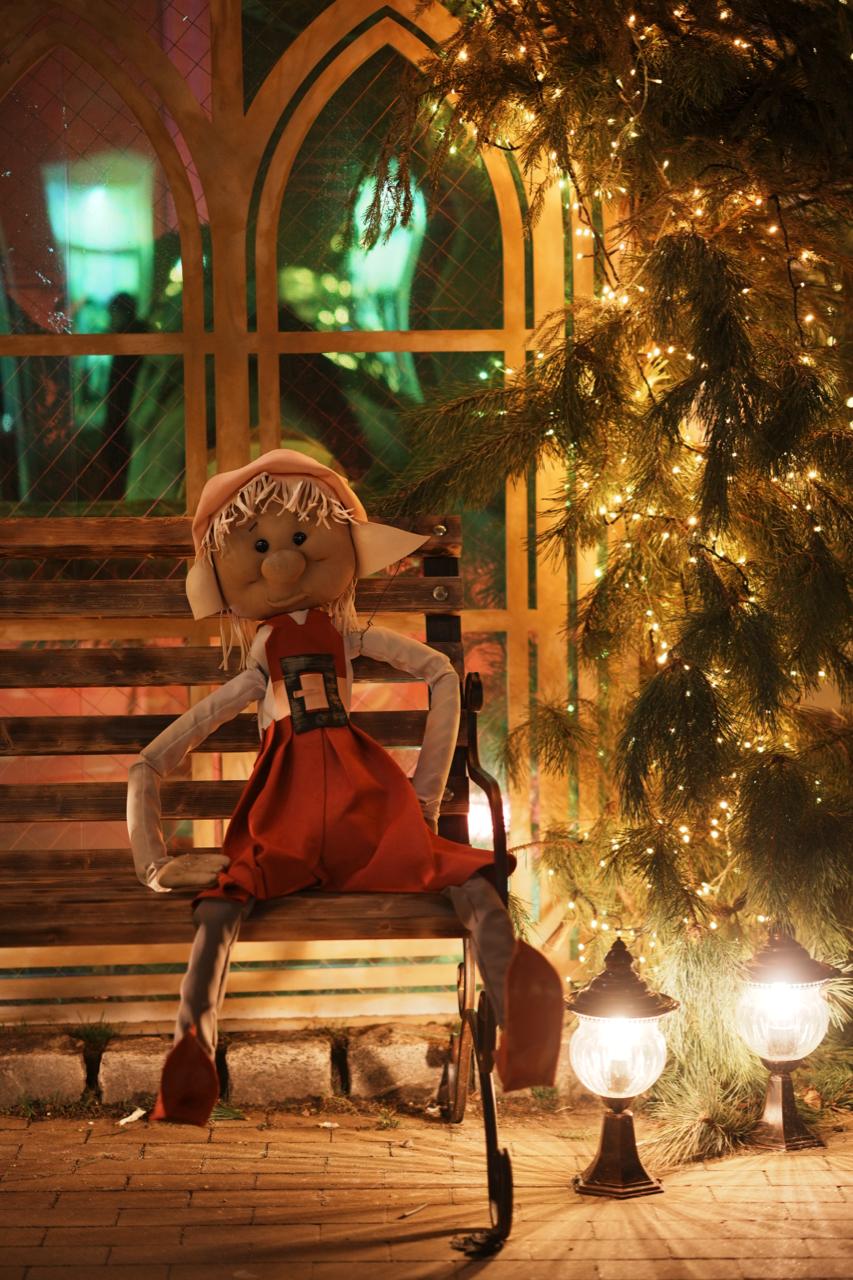 Фасад гастромаркета оформлен в тёплых праздничных тонах: гирлянды с мягким свечением, живые еловые ветви и неоновые акценты создают атмосферу зимнего уюта. В оформлении использованы мягкие игрушки, подарочные коробки и декоративные элементы, которые добавляют сценичности и делают пространство фотогеничным.