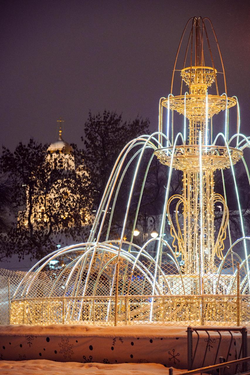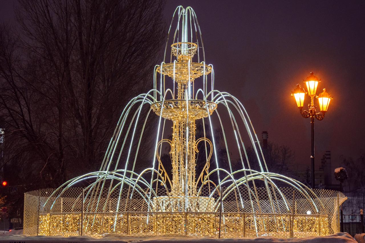 В центре города установлен декоративный световой фонтан. Конструкция выполнена из металлического каркаса с гирляндами холодного и тёплого свечения, создающими эффект струящейся воды. Композиция стала центральным элементом праздничного оформления площади.