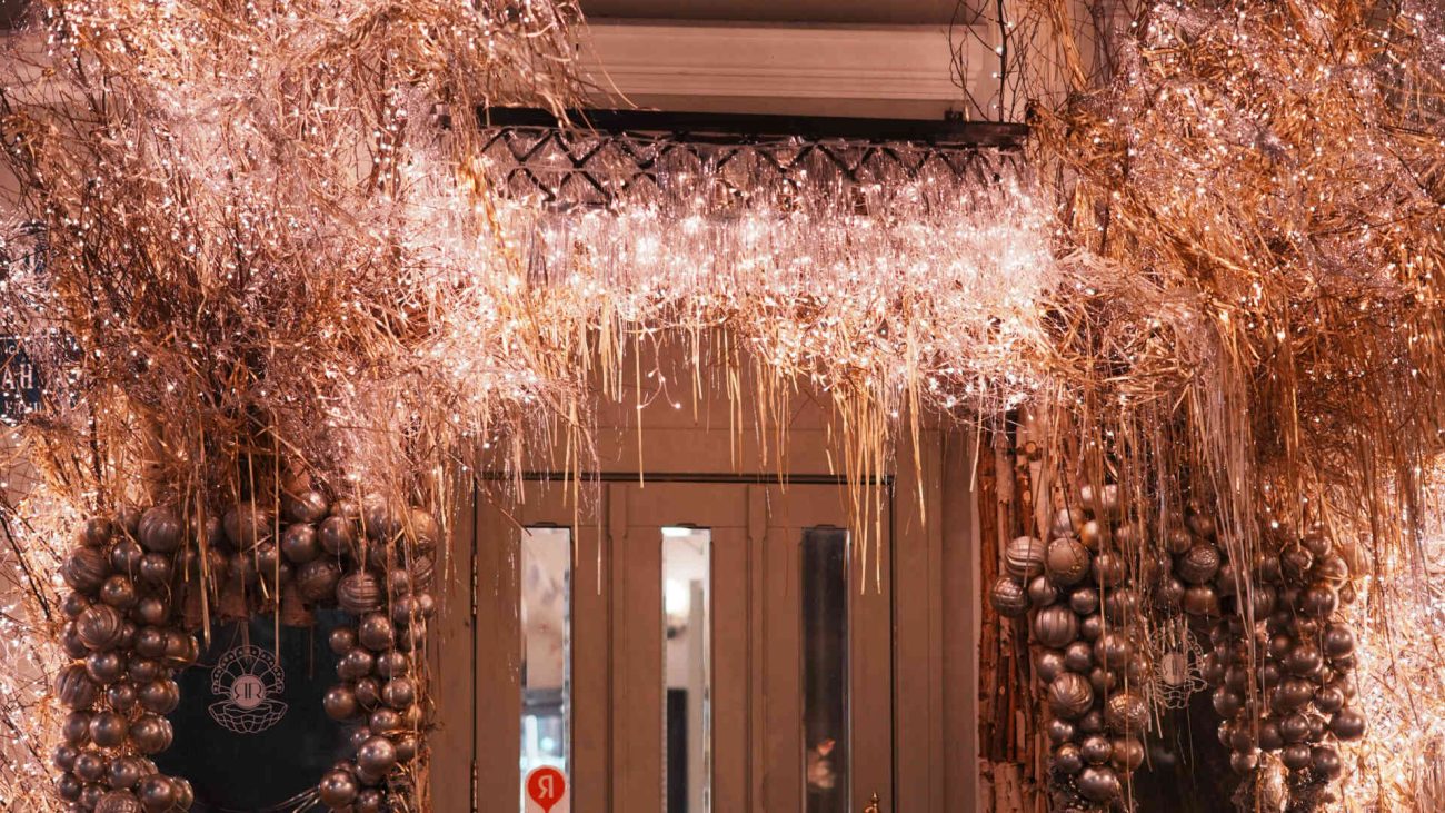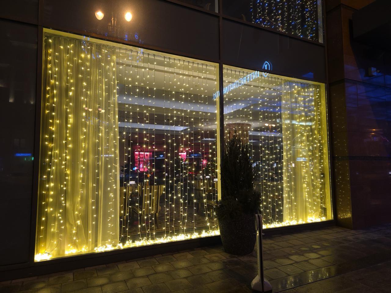 Большие окна гостиницы украшены гирляндой-бахромой тёплого белого оттенка. Свет ложится мягкими вертикальными линиями, подчёркивая масштаб фасада и создавая эффект сияющего панно.