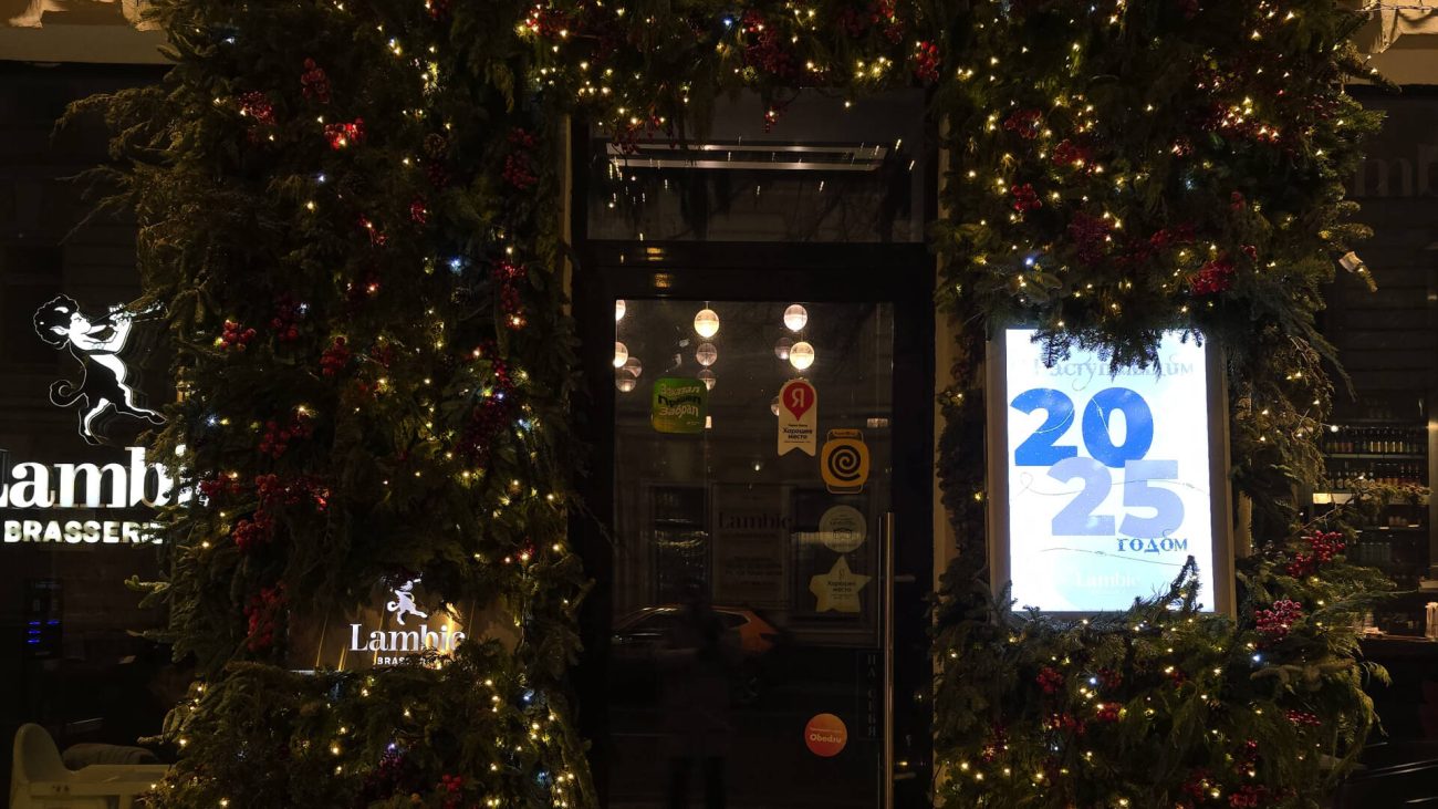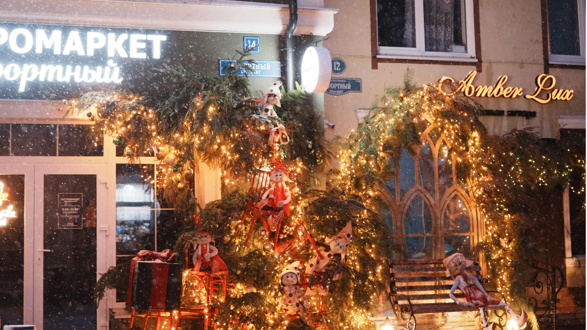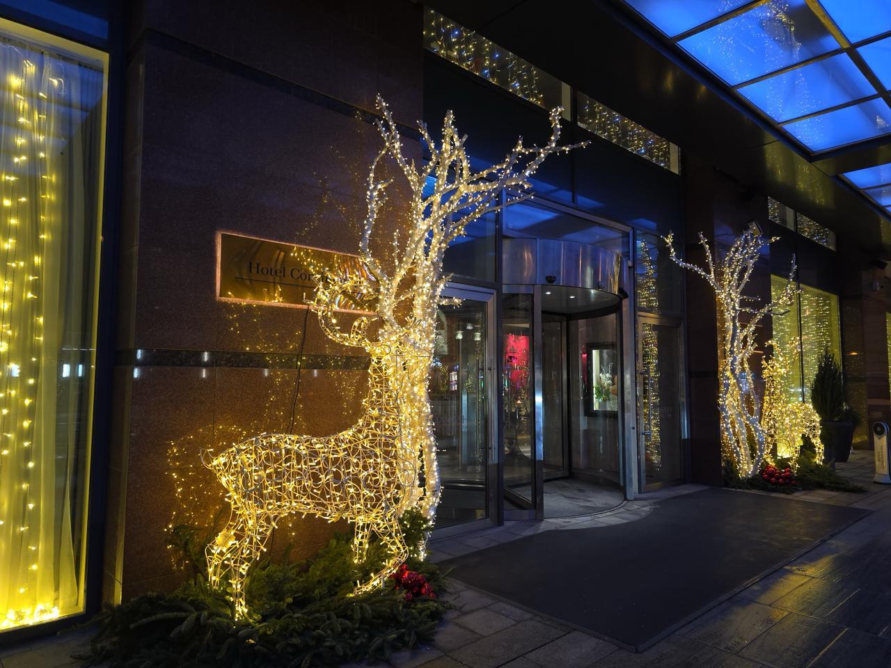 Главный вход гостиницы оформлен световыми фигурами оленей и деревьев. Их яркое, но элегантное свечение сразу привлекает внимание и задаёт атмосферу праздника для всех прибывающих гостей.