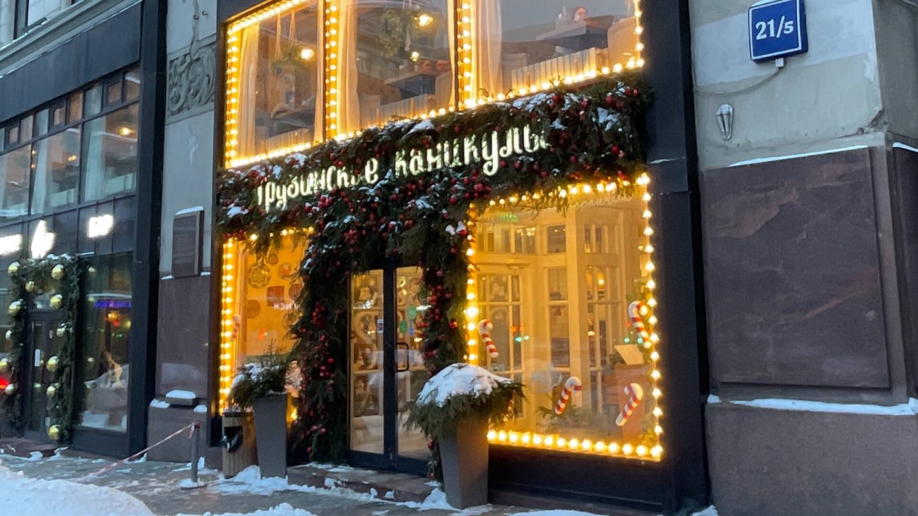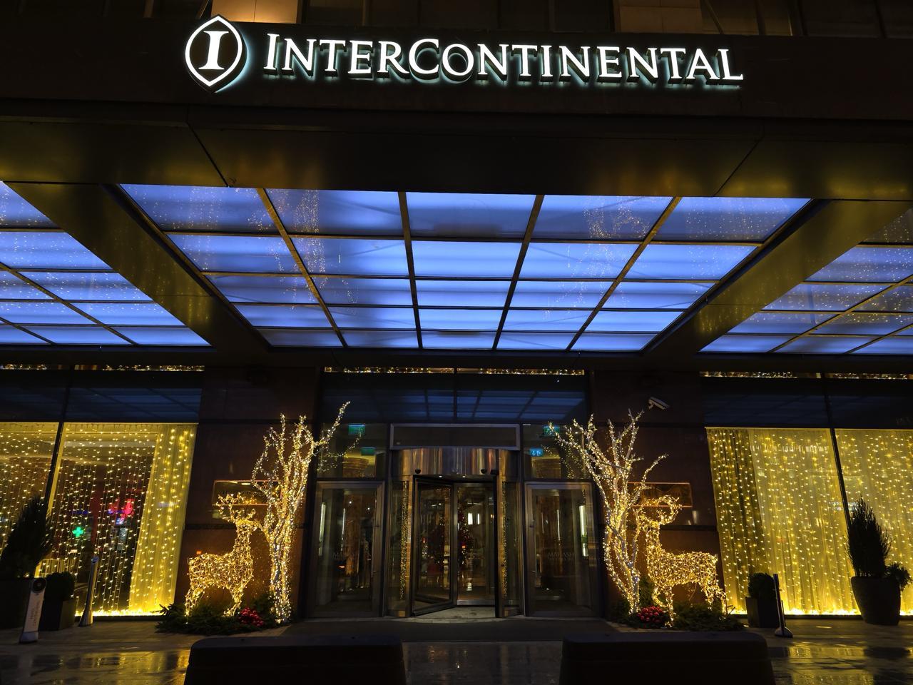 Фасад гостиницы Intercontinental в Москве к зимнему сезону украшен световыми фигурами оленей и деревьев у входной группы. Большие окна дополнены гирляндой-бахромой тёплого оттенка, создающей мягкое сияние. Такое решение подчёркивает престиж отеля и формирует праздничную атмосферу для гостей и прохожих.