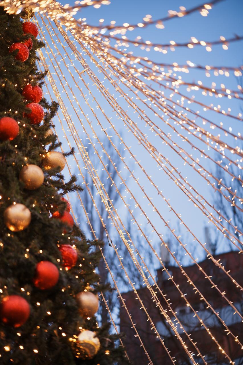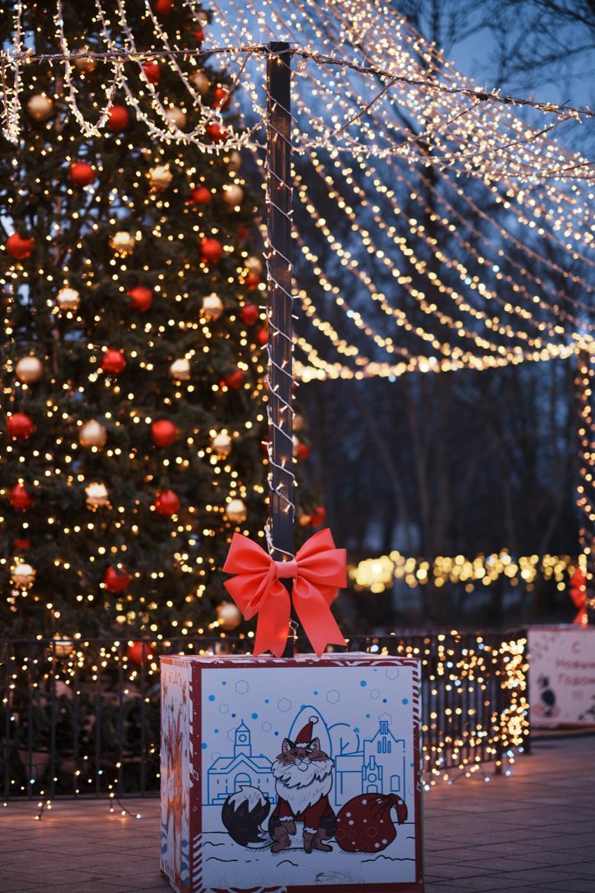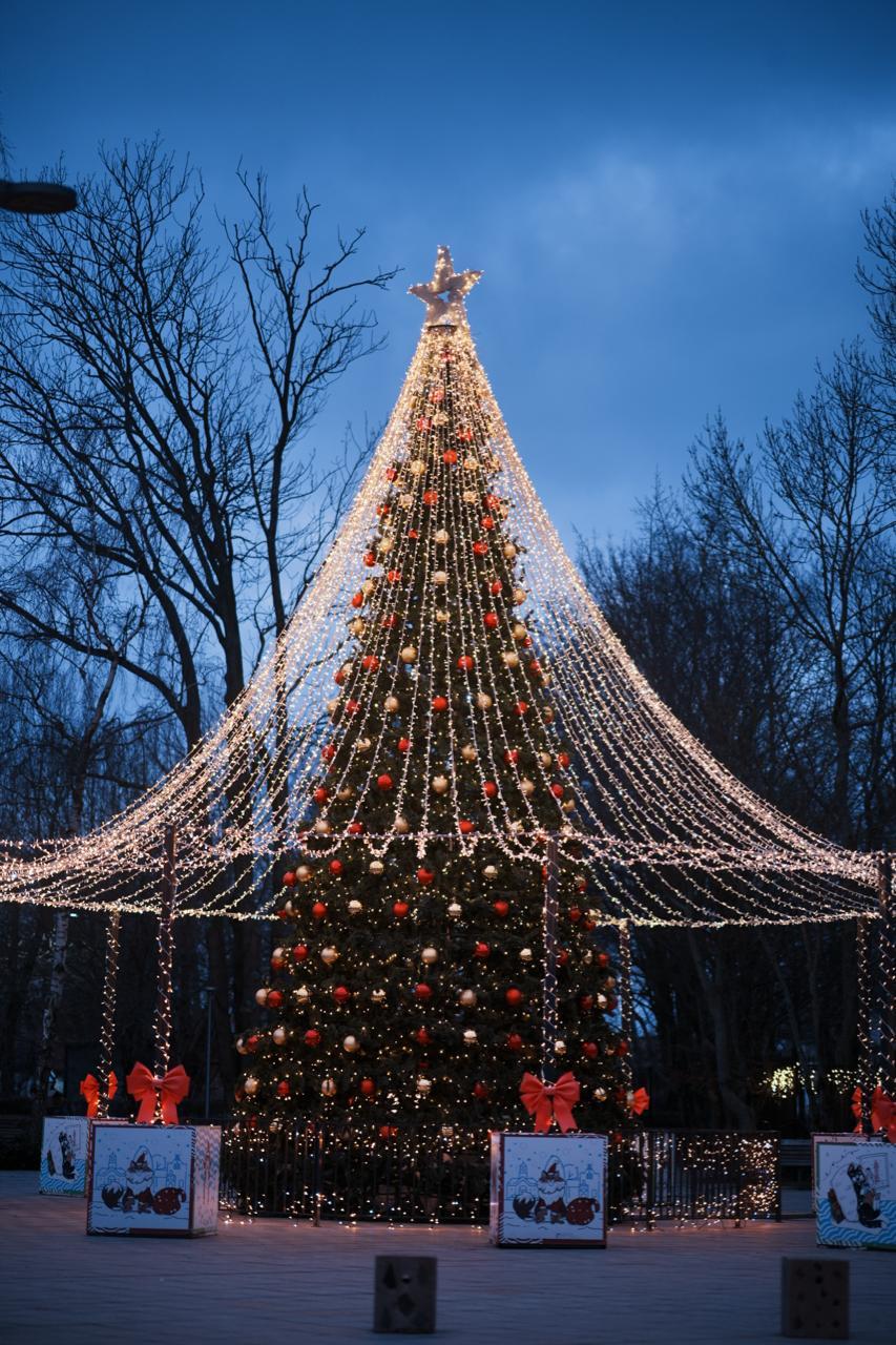 На центральной площади города установили праздничную ёлку, украшенную шарами и гирляндами. Вокруг неё создан купол из гирлянды «Звёздное небо», спускающейся к основанию и формирующей световой шатёр. Конструкция подчёркивает масштаб ёлки и создаёт атмосферу зимней сказки для жителей и туристов.