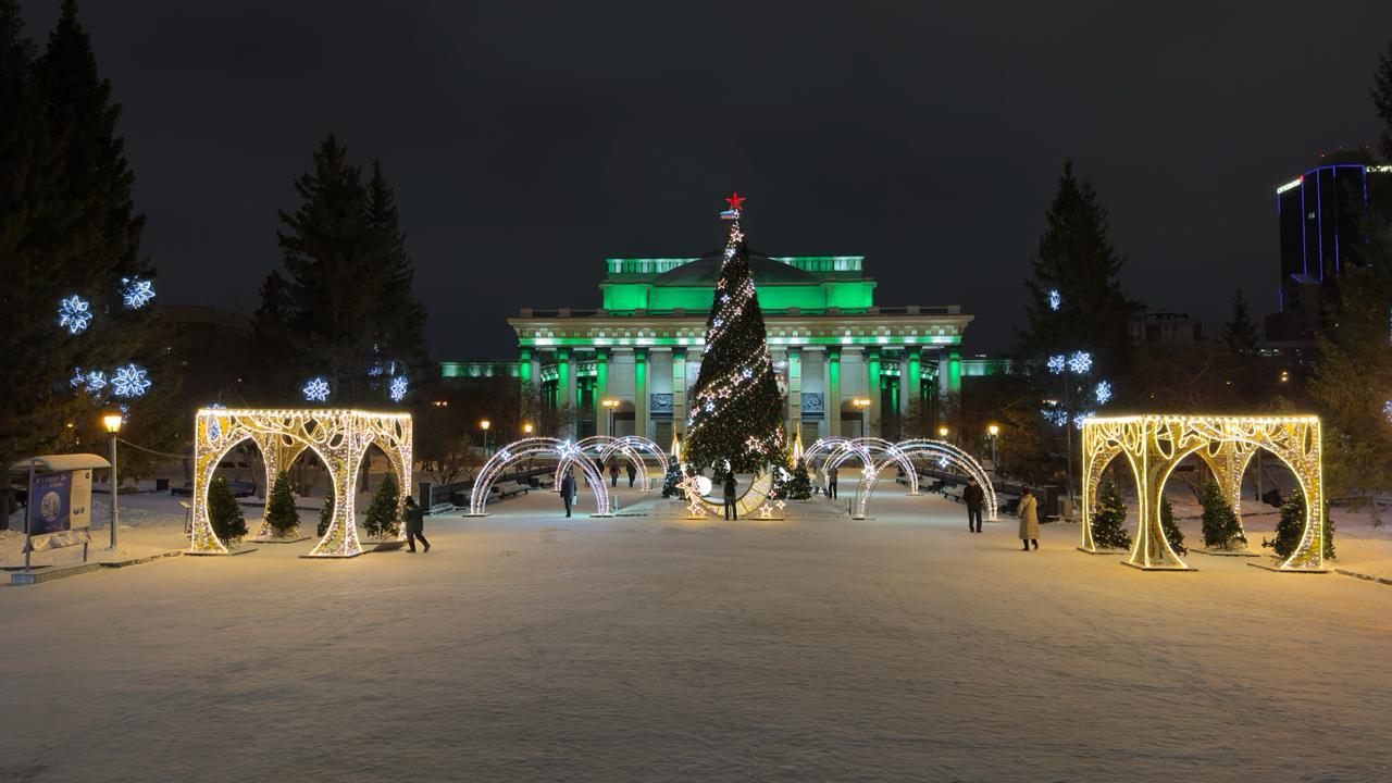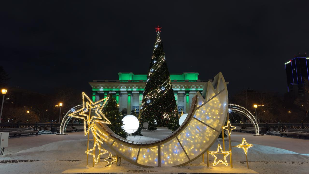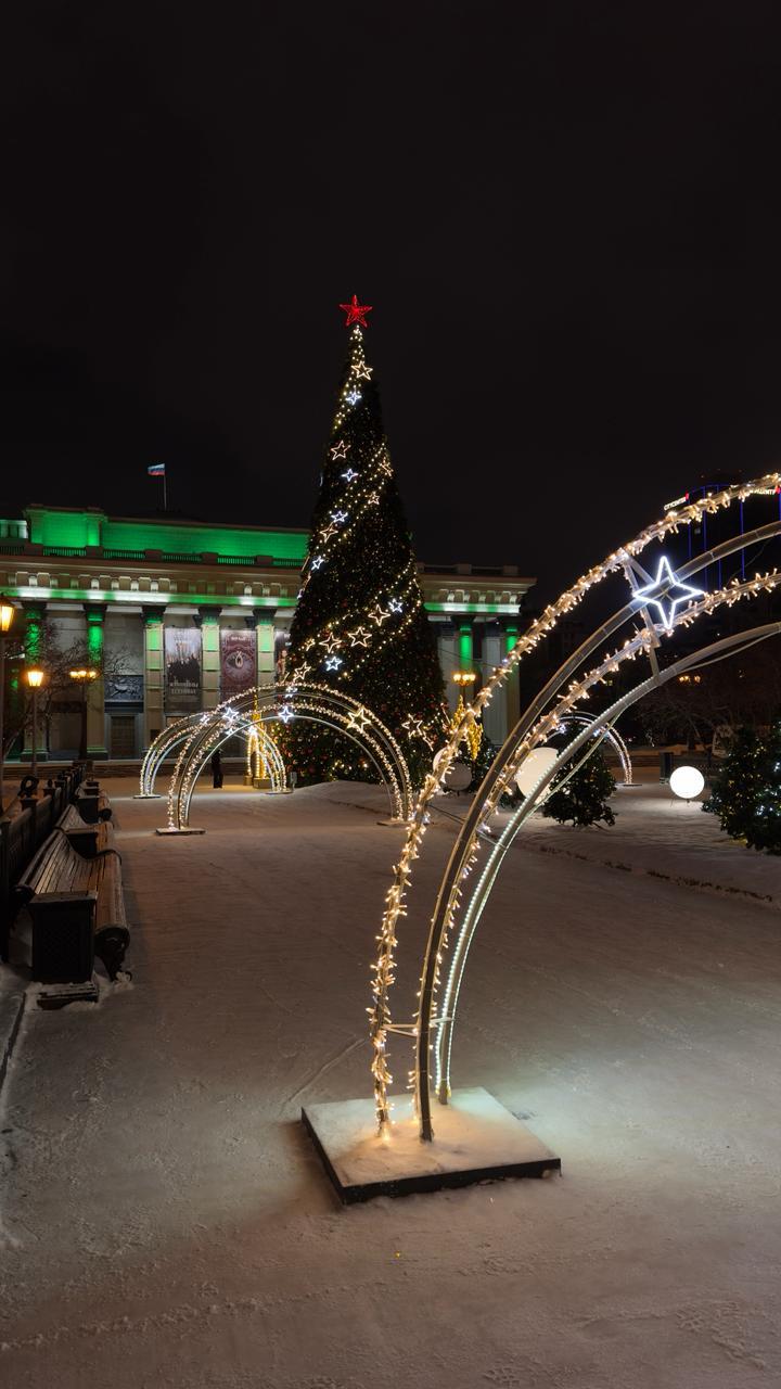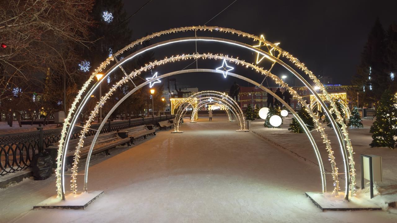 Вдоль аллеи установлены арки с подсветкой в комбинированных тёплых и холодных оттенках. По периметру — фигуры-беседки, декоративные композиции и снежинки. Центральную часть украшает высокая ель, оформленная гирляндой и звёздным декором.
