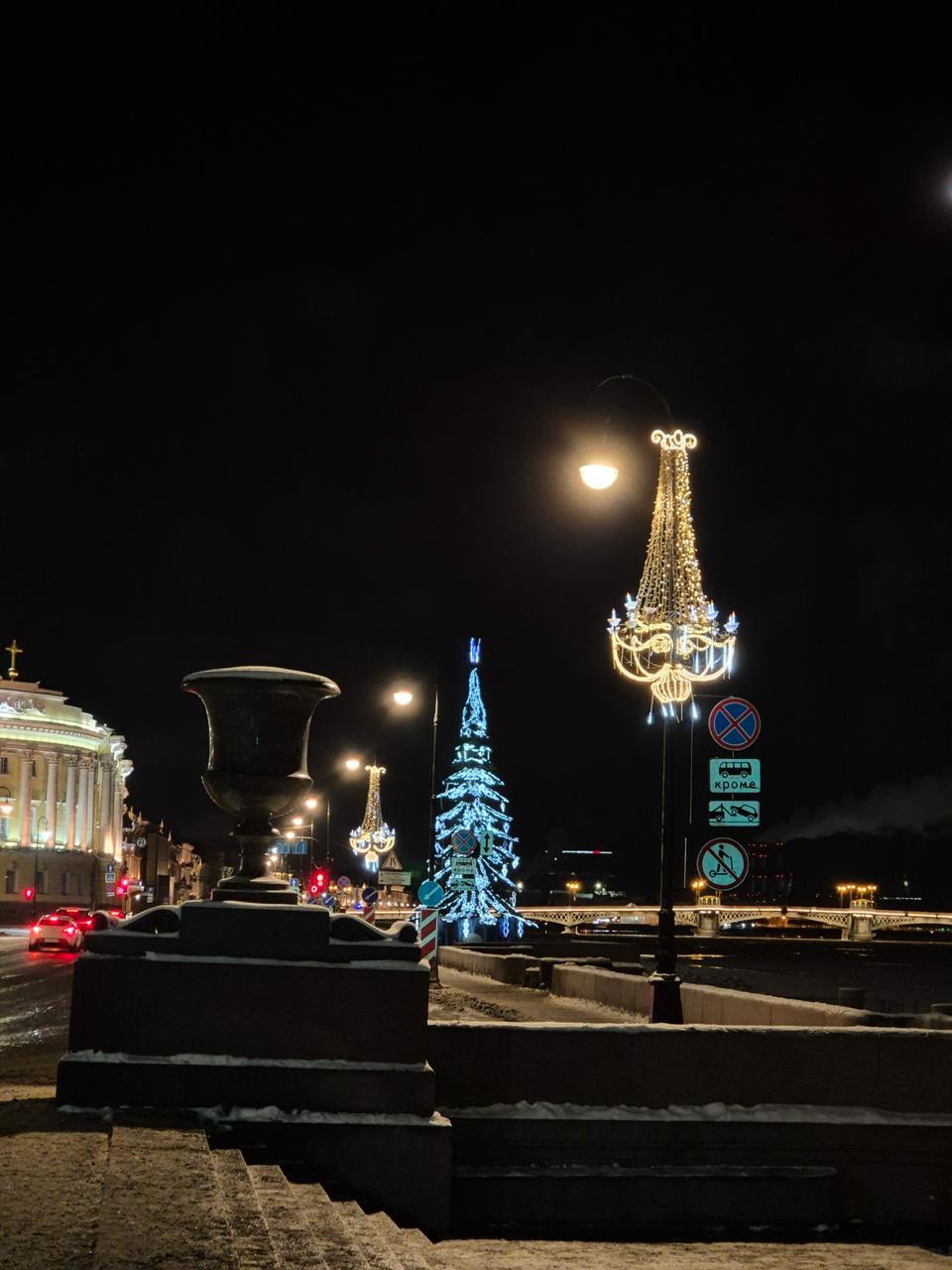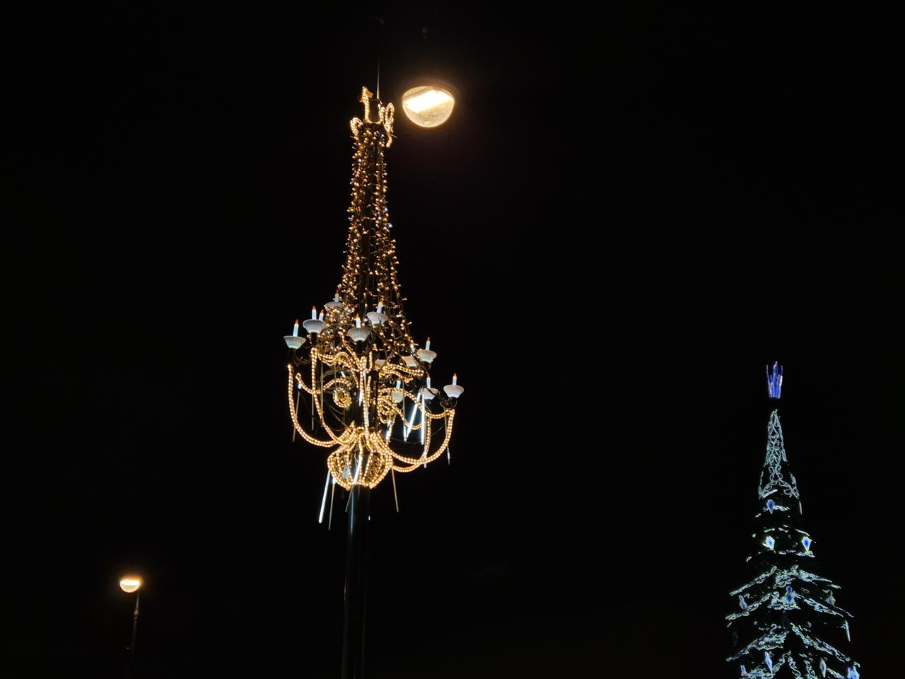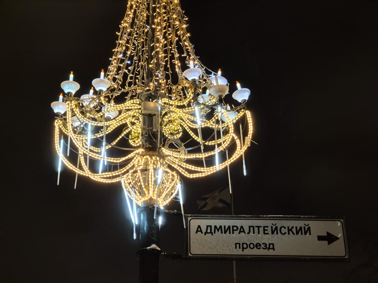 Вдоль улицы установлены световые консоли в форме люстр, выполненные в классическом стиле. Они закреплены на опорах уличного освещения и подключены к существующей электрической сети. Для монтажа использовались металлические каркасы и светодиодные нити тёплого свечения, которые создают эффект настоящего хрусталя. Центральная часть люстры оформлена световыми подвесами, добавляющими глубину и объём конструкции.