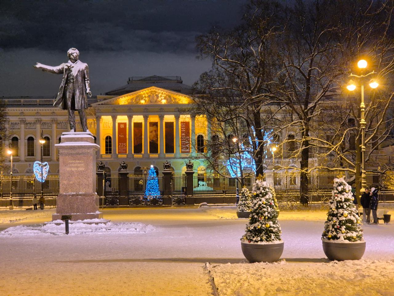 Гирлянды холодного и тёплого белого оттенков образуют мягкое сияние, не нарушая архитектурную гармонию исторического центра. Подсветка подчёркивает линии и детали фигур, создавая эффект лёгкости и движения.
