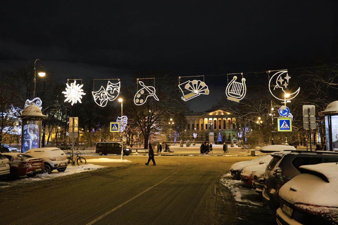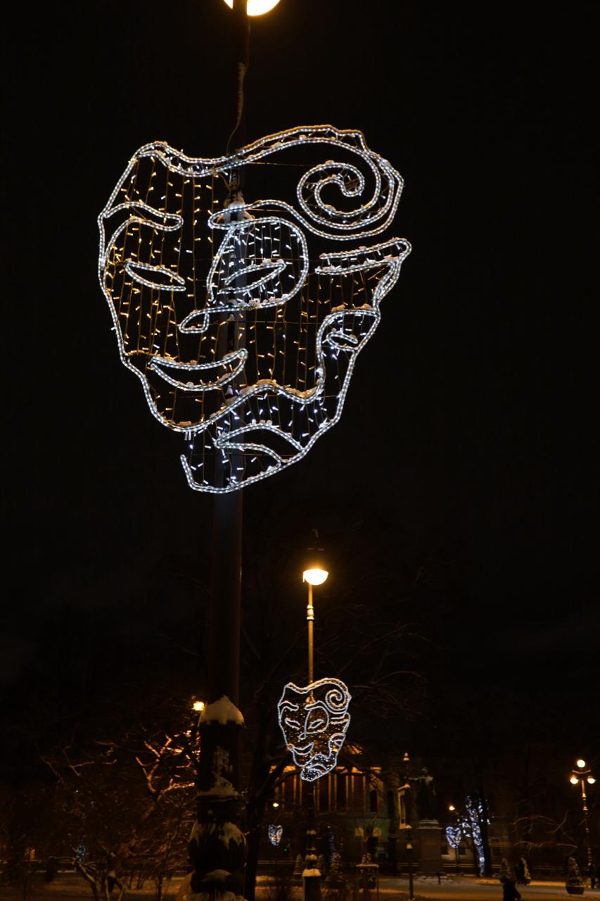Вечером улица превращается в сцену под открытым небом. Световые элементы органично вписываются в пространство, продолжая тему искусства, театра и классики. Иллюминация видна издалека и формирует праздничное настроение у жителей и туристов.