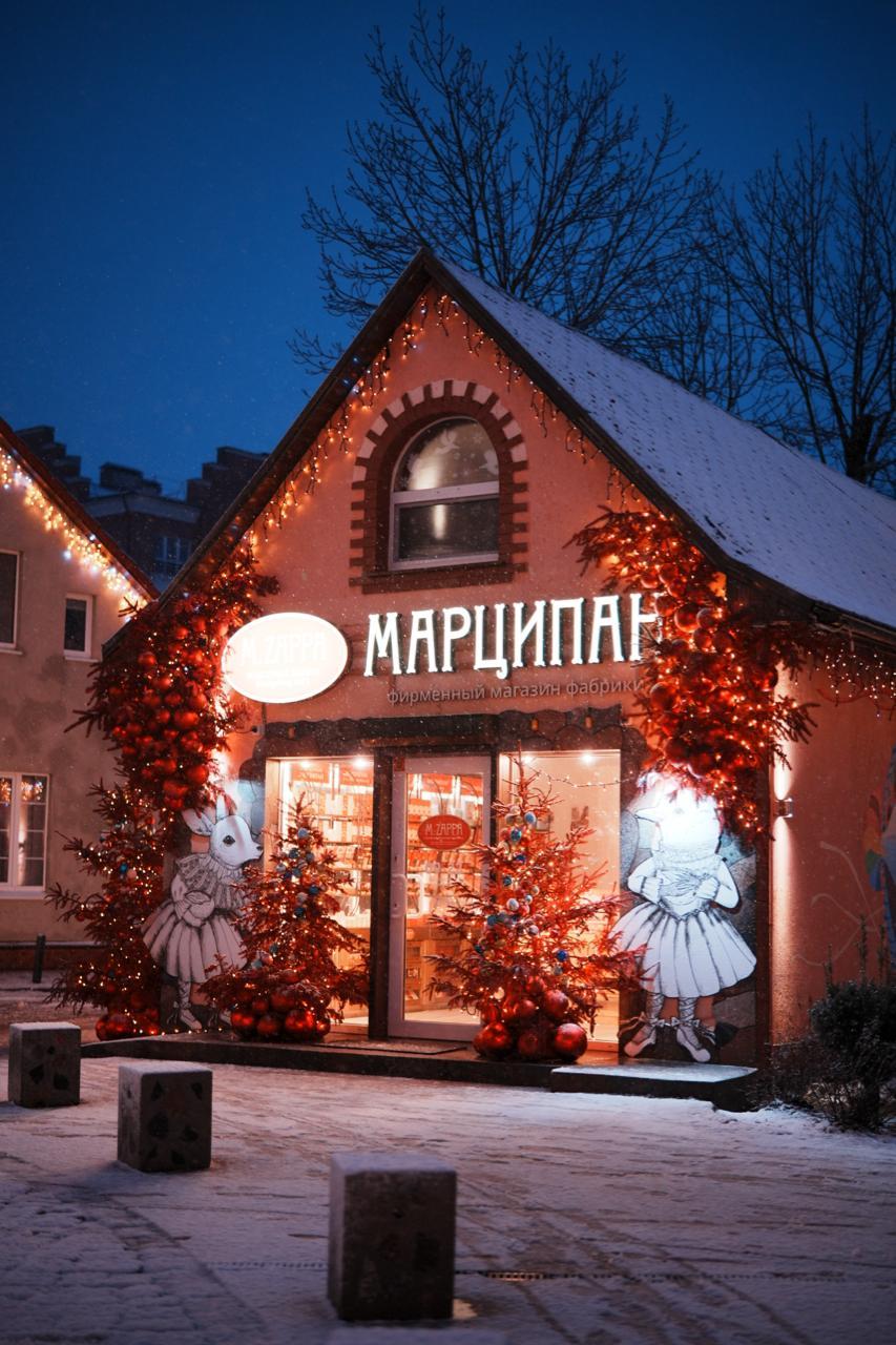 Фасад магазина «Марципан» оформлен в тёплой праздничной гамме. По контуру здания установлена гирлянда-бахрома с мягким золотистым свечением, а вход украшен елями с гирляндой-нитью. Красно-золотые и синие шары создают яркий контраст и подчёркивают атмосферу праздника.