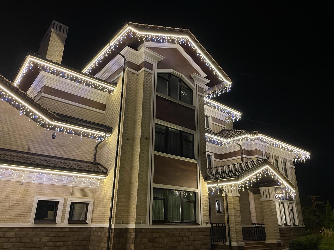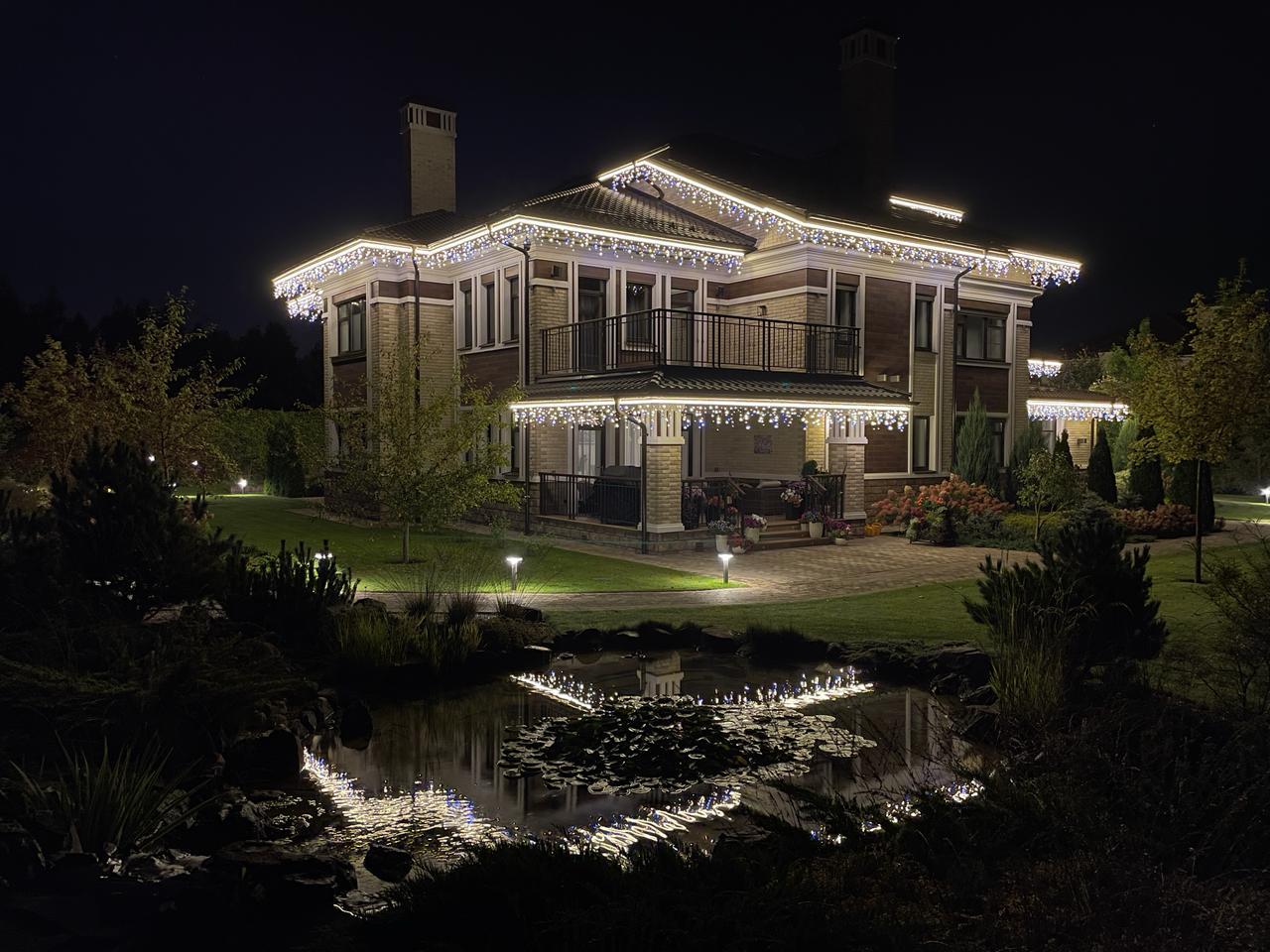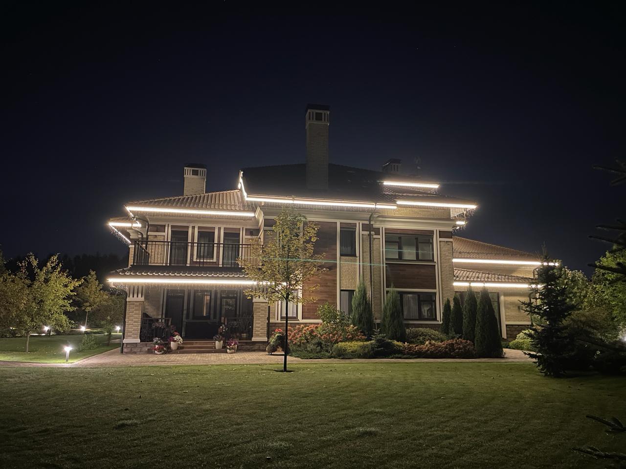 Фасад имел несколько уровней: верхний контур, средний, навесы и входные группы. Электромонтаж был выполнен скрытно — без видимых проводов и кабелей. Для сложных участков использовались промышленные альпинисты, монтаж вёлся с верёвок, чтобы не повредить кровлю и отделку.