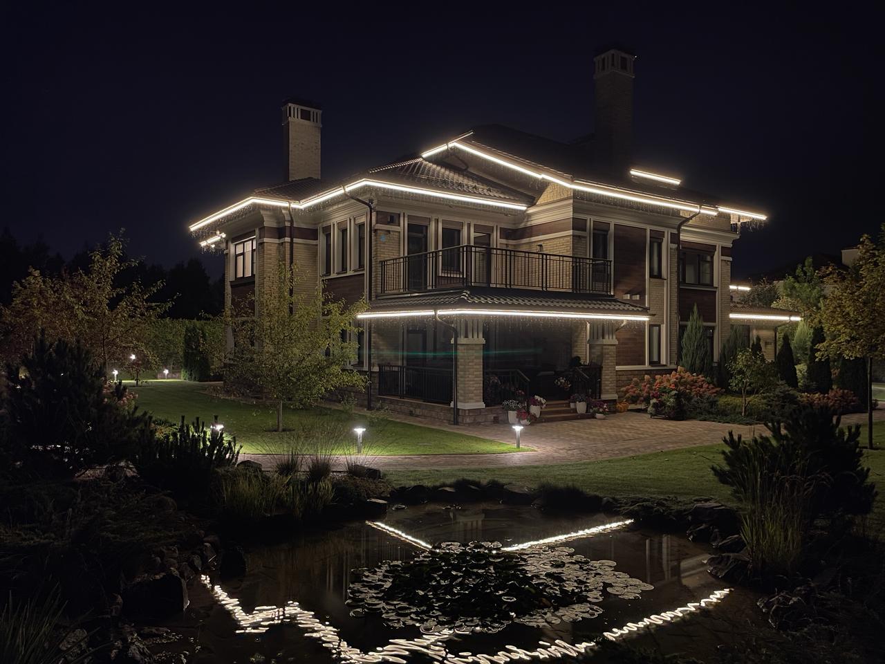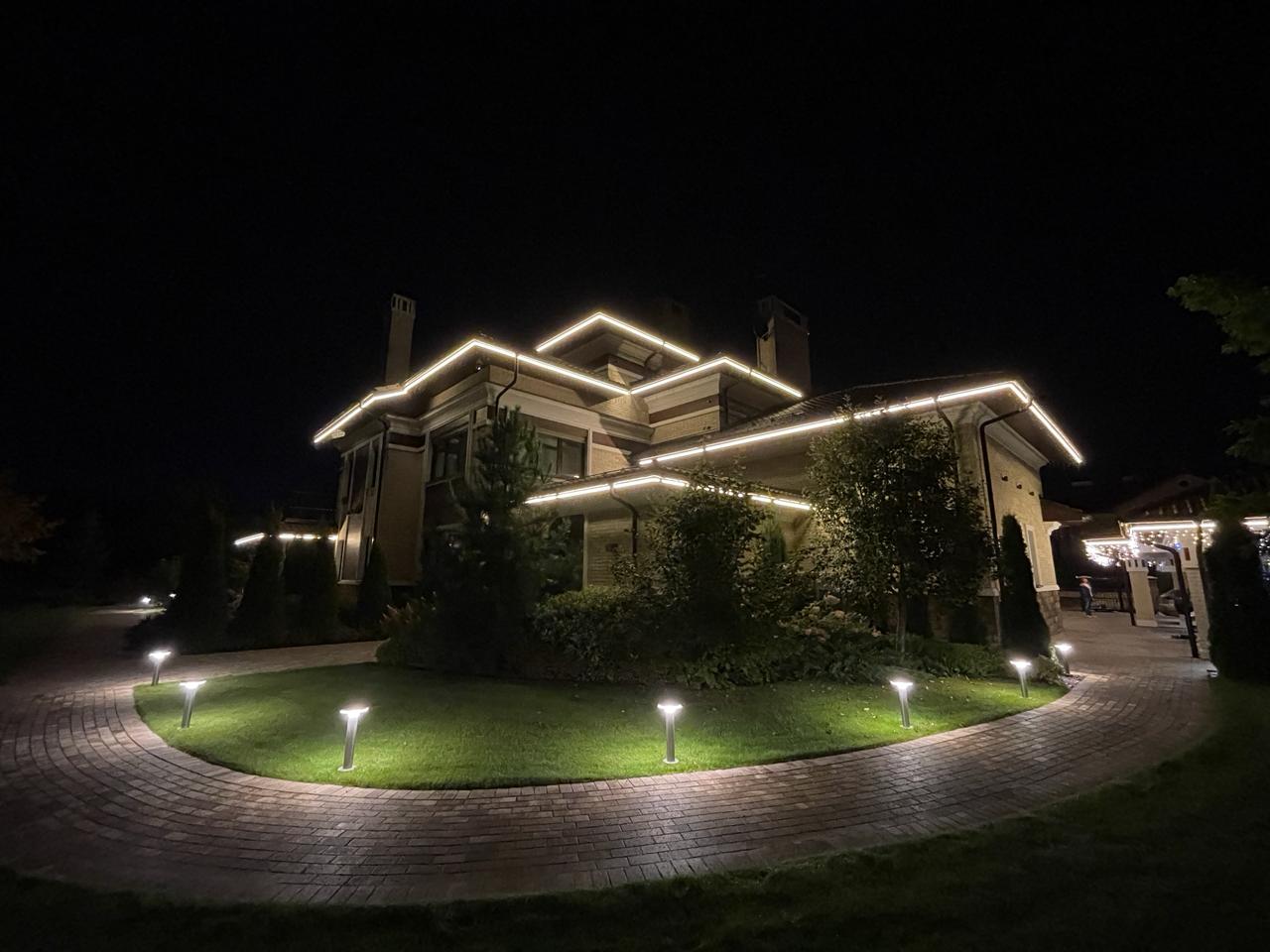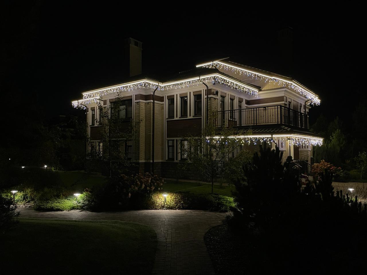 Фасад имел несколько уровней: верхний контур, средний, навесы и входные группы. Электромонтаж был выполнен скрытно — без видимых проводов и кабелей. Для сложных участков использовались промышленные альпинисты, монтаж вёлся с верёвок, чтобы не повредить кровлю и отделку.