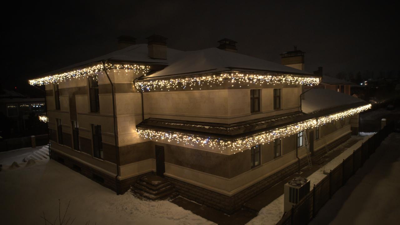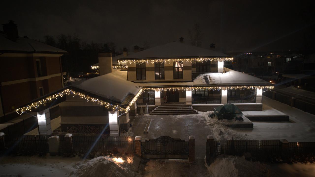 Фасад дома и гараж засияли мягким, равномерным светом, подчёркивающим архитектуру здания. Подсветка не ослепляет, а создаёт эффект тёплого свечения. Управление с телефона делает эксплуатацию простой и комфортной, а внешний вид дома — праздничным и современным.