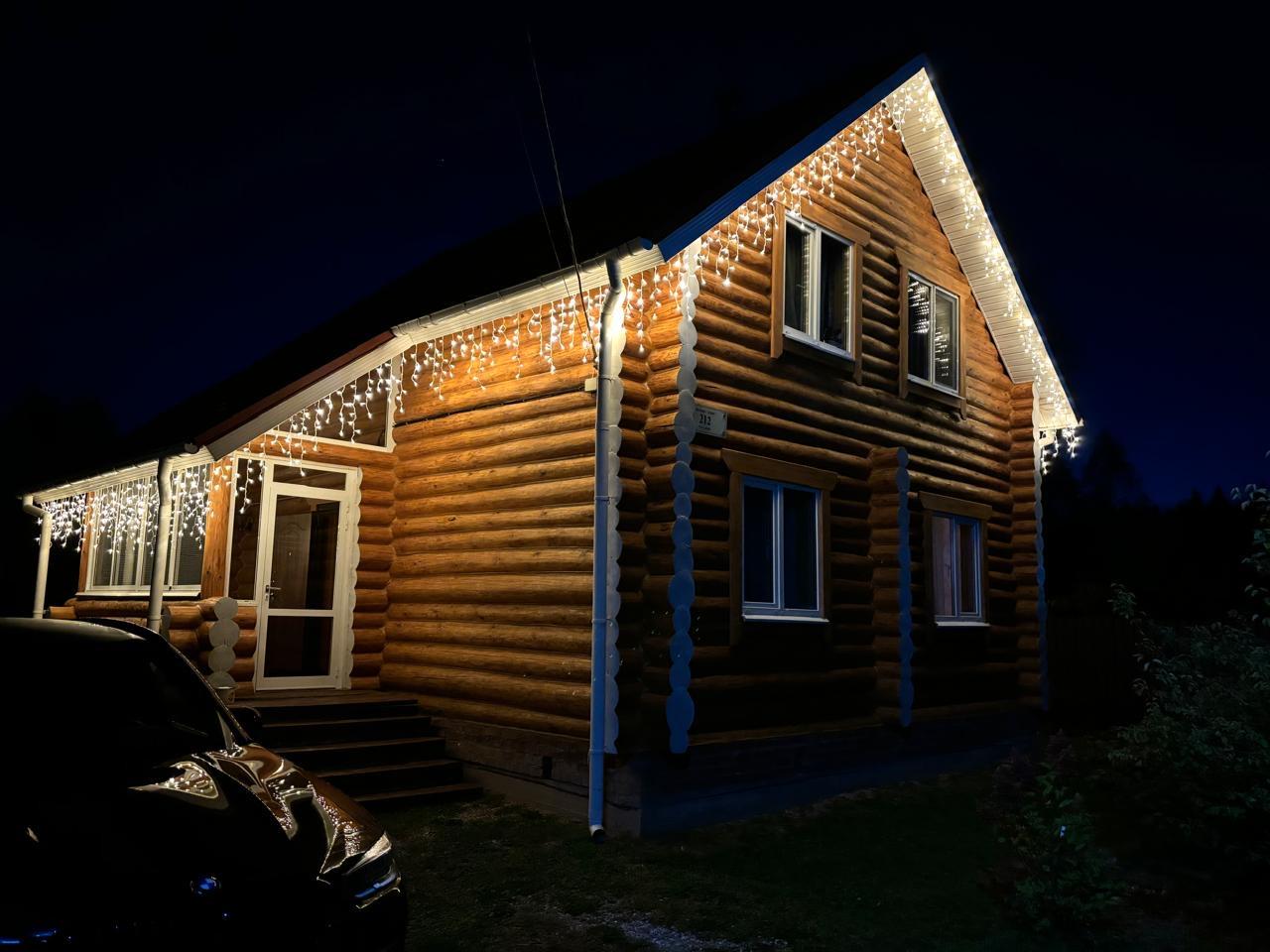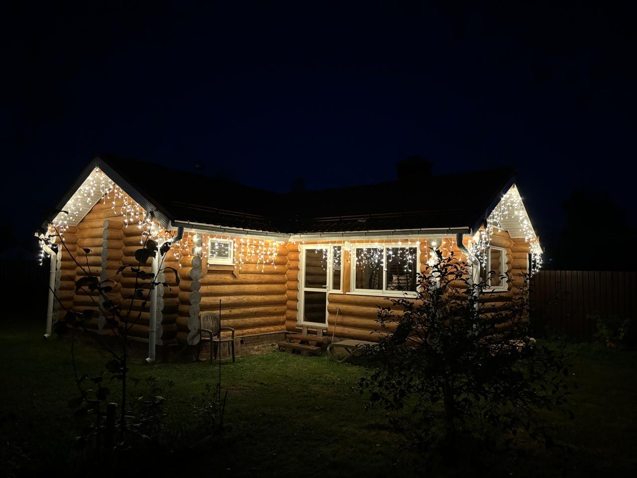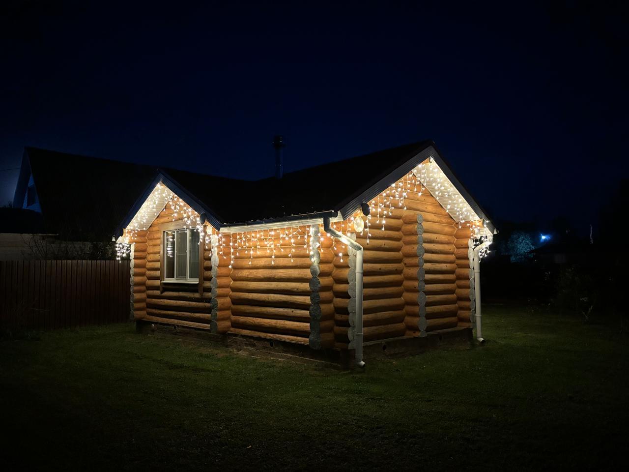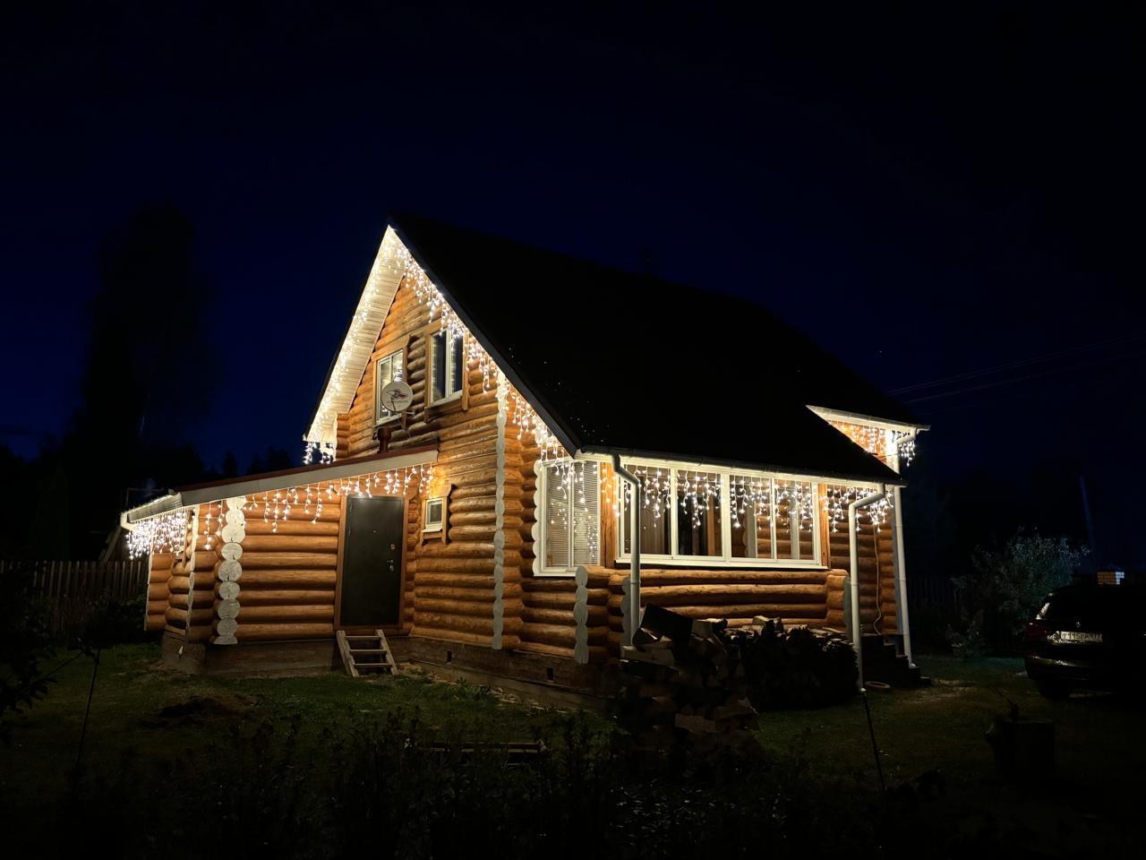 В Наро-Фоминске мы оформили деревянный дом и баню гирляндой-бахромой в тёплом оттенке. Свет мягко подчёркивает архитектуру сруба и создаёт атмосферу уюта. Простое решение, которое полностью меняет облик дома в вечернее время.