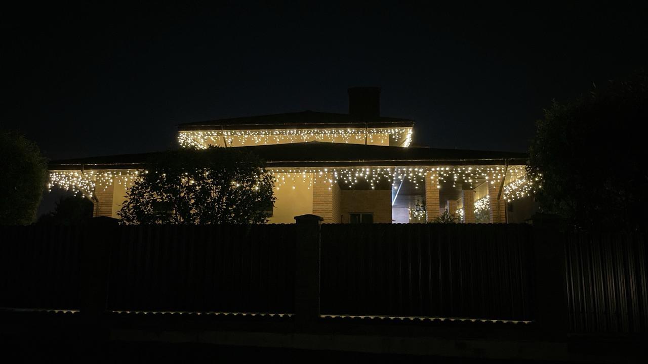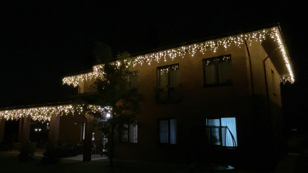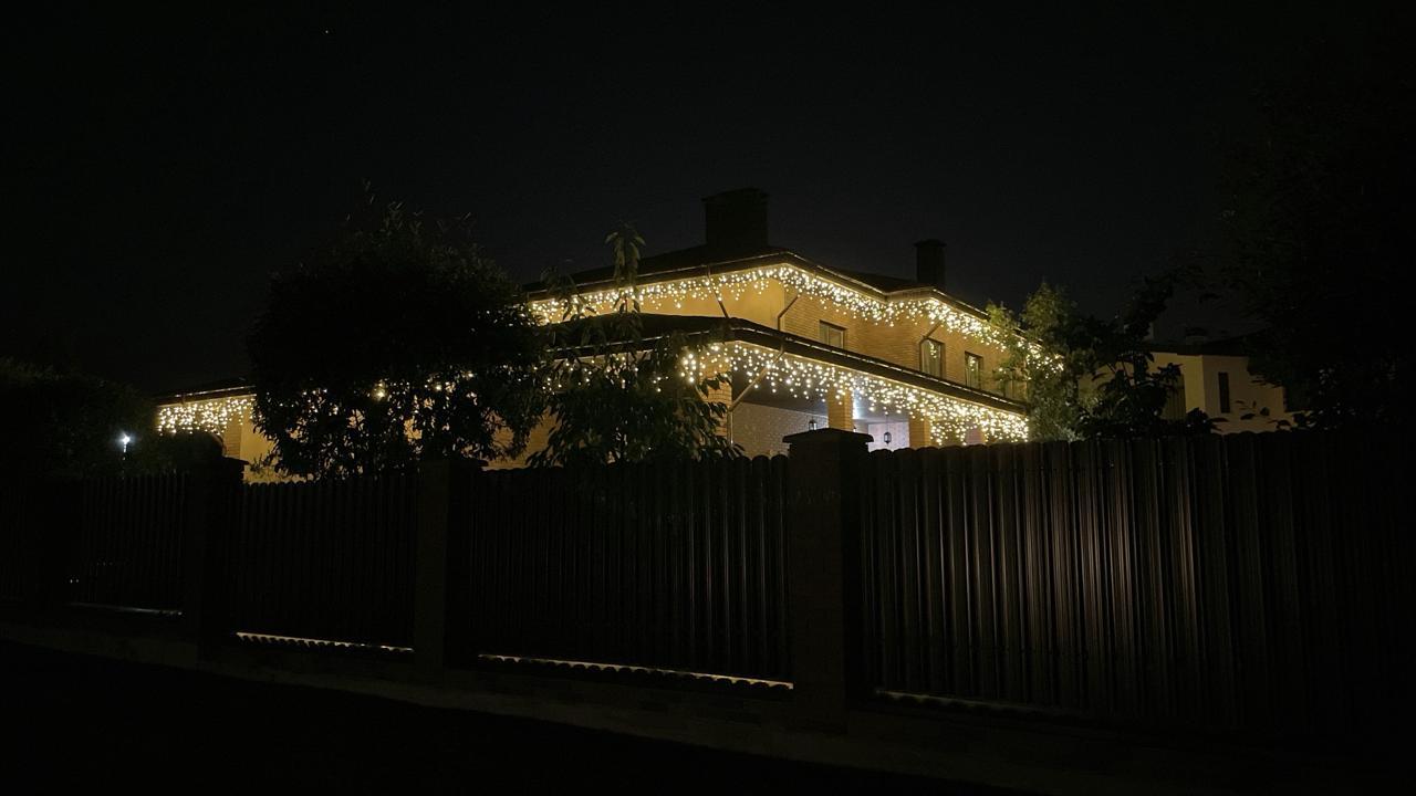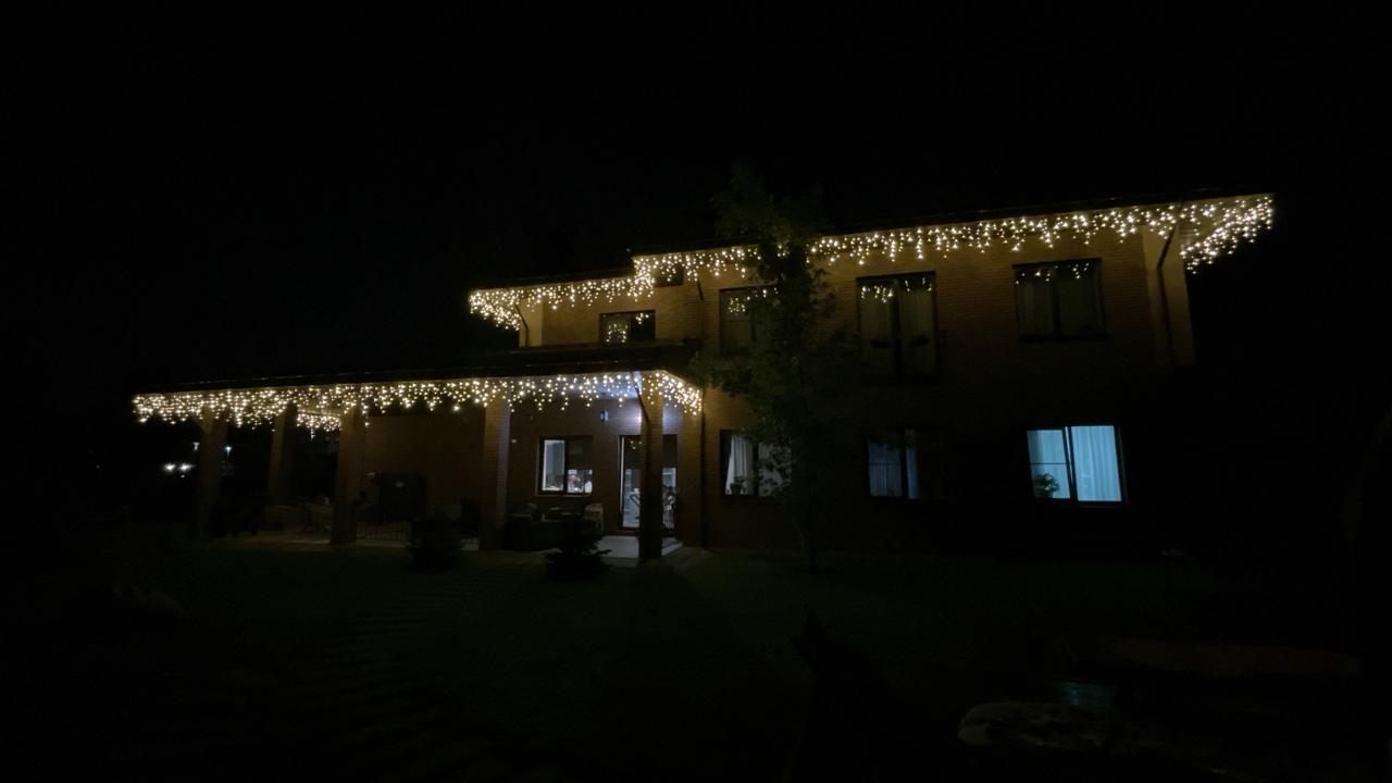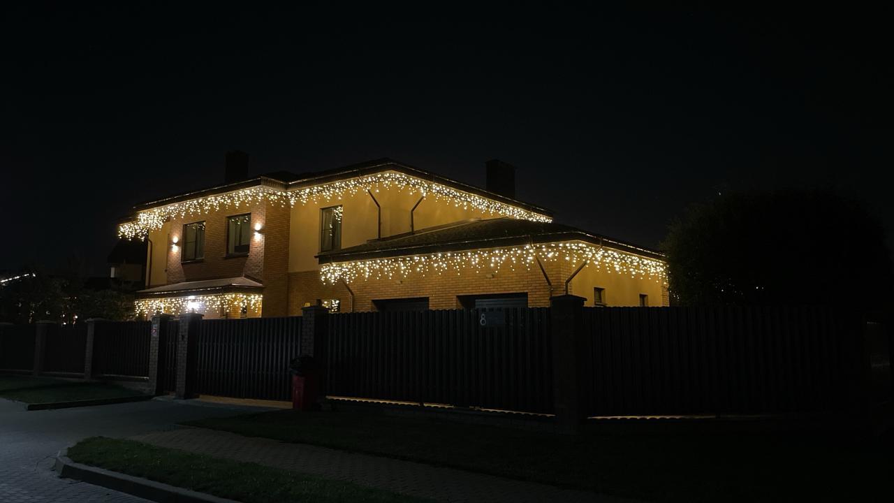 По всему контуру фасада установлена гирлянда «бахрома» с тёплым белым свечением. Такой оттенок даёт мягкий и уютный свет, который подчёркивает кирпичную кладку и создаёт ощущение тепла. Дополнительно подсветили два крыльца, что сделало световой рисунок логичным и завершённым.