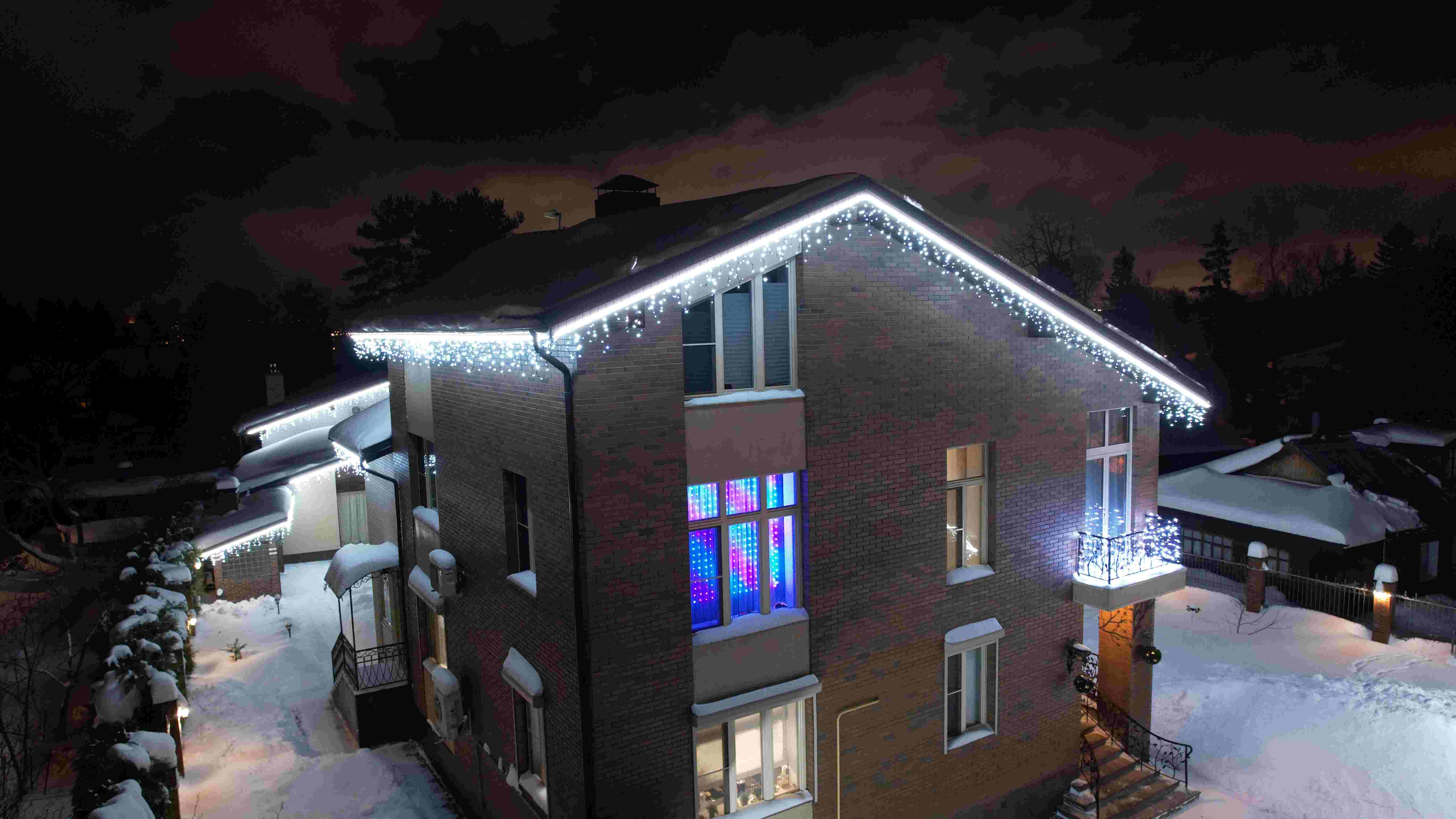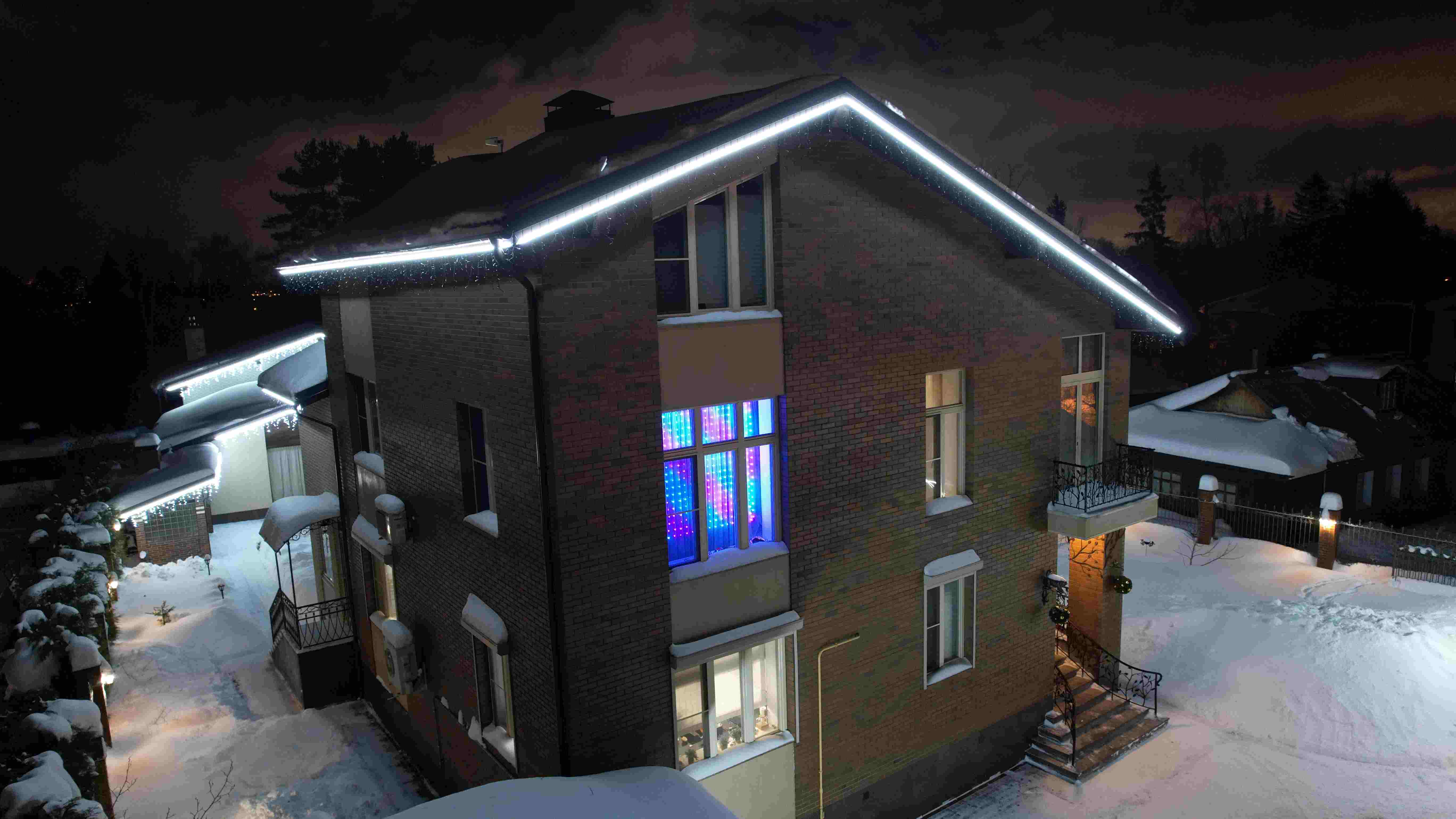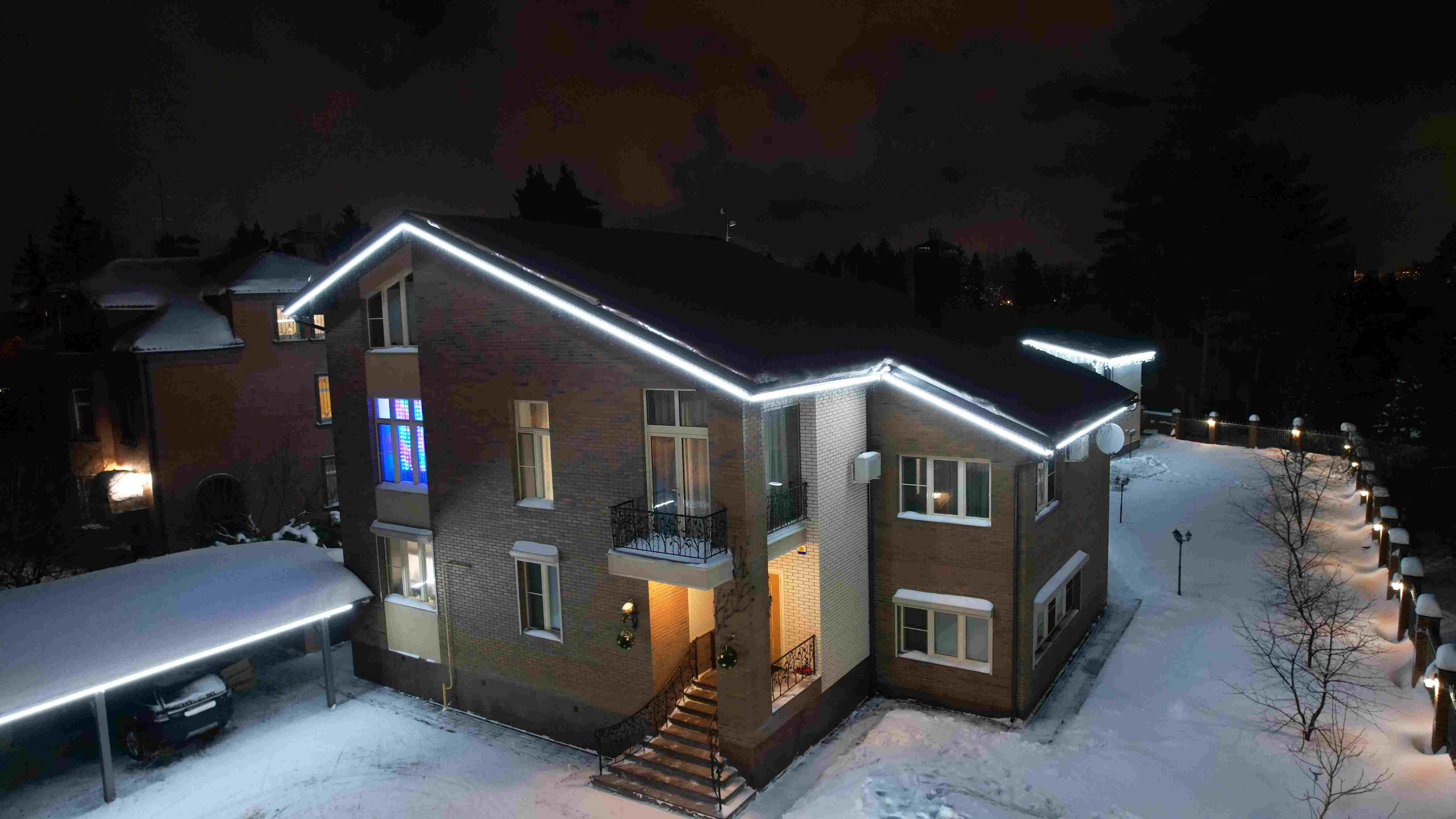 Перед началом монтажа была подготовлена визуализация в двух цветовых вариантах — тёплый и холодный оттенки, а также дополнительный вариант с гирляндой «бахрома». Визуализации показывали фасад с разных ракурсов, что позволило сравнить варианты. Первоначально клиент склонялся к тёплому свету, но в итоге выбрал холодный оттенок с бахромой, так как он лучше подчёркивал геометрию фасада и создавал нужную атмосферу.
