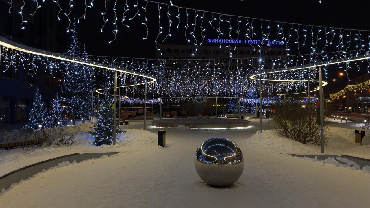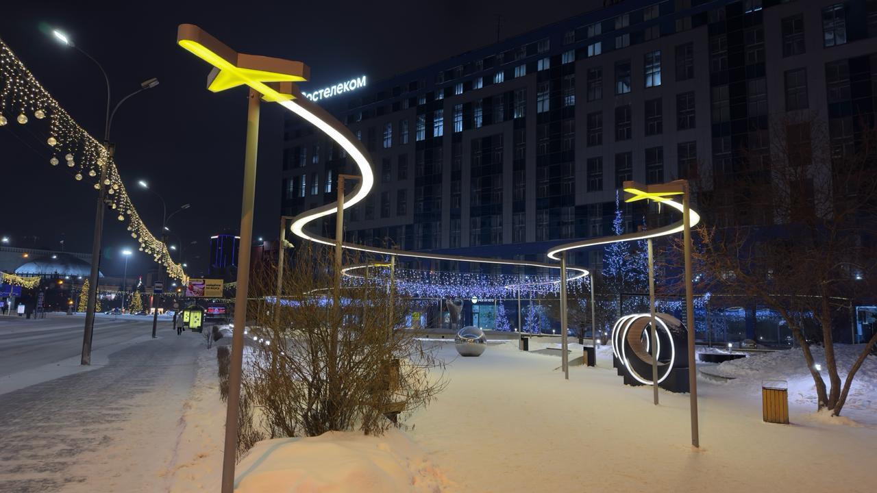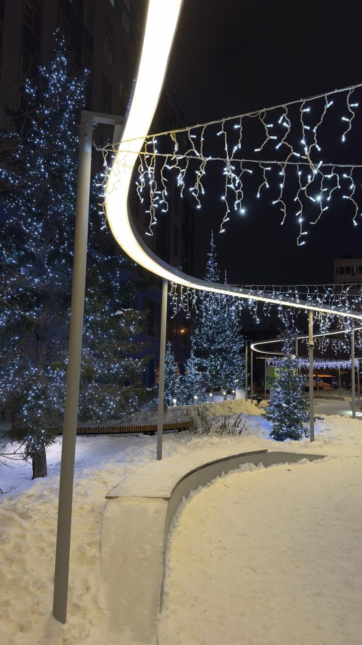 Идея проекта — соединить архитектуру современного города с атмосферой праздника. Плавные линии света символизируют движение и энергию, подчёркивая динамику пространства. Световое оформление объединяет пешеходную зону, фасад и парковую часть, делая территорию целостной и узнаваемой.