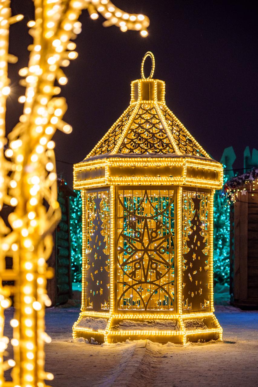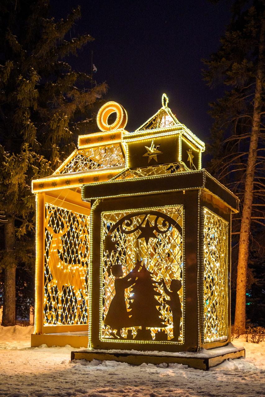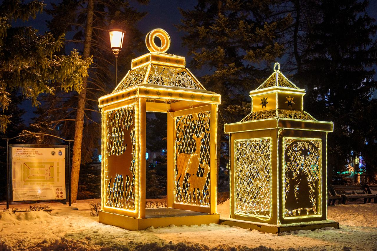 В центре города установлены крупные световые фигуры в форме фонарей. Конструкции выполнены из металлического каркаса и украшены светодиодными гирляндами тёплого оттенка. Вечером фонари создают уютное свечение и становятся ярким акцентом зимнего оформления города.