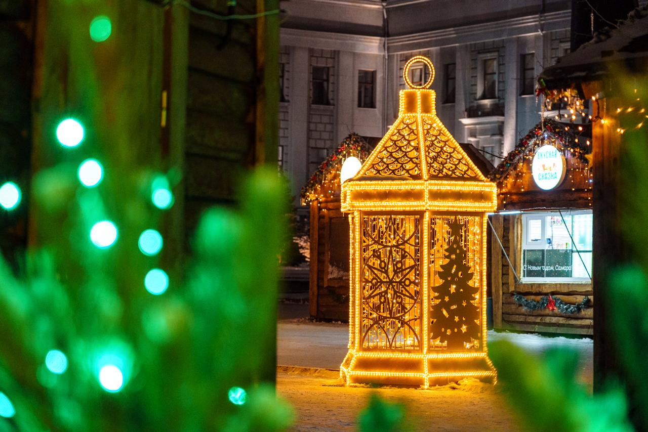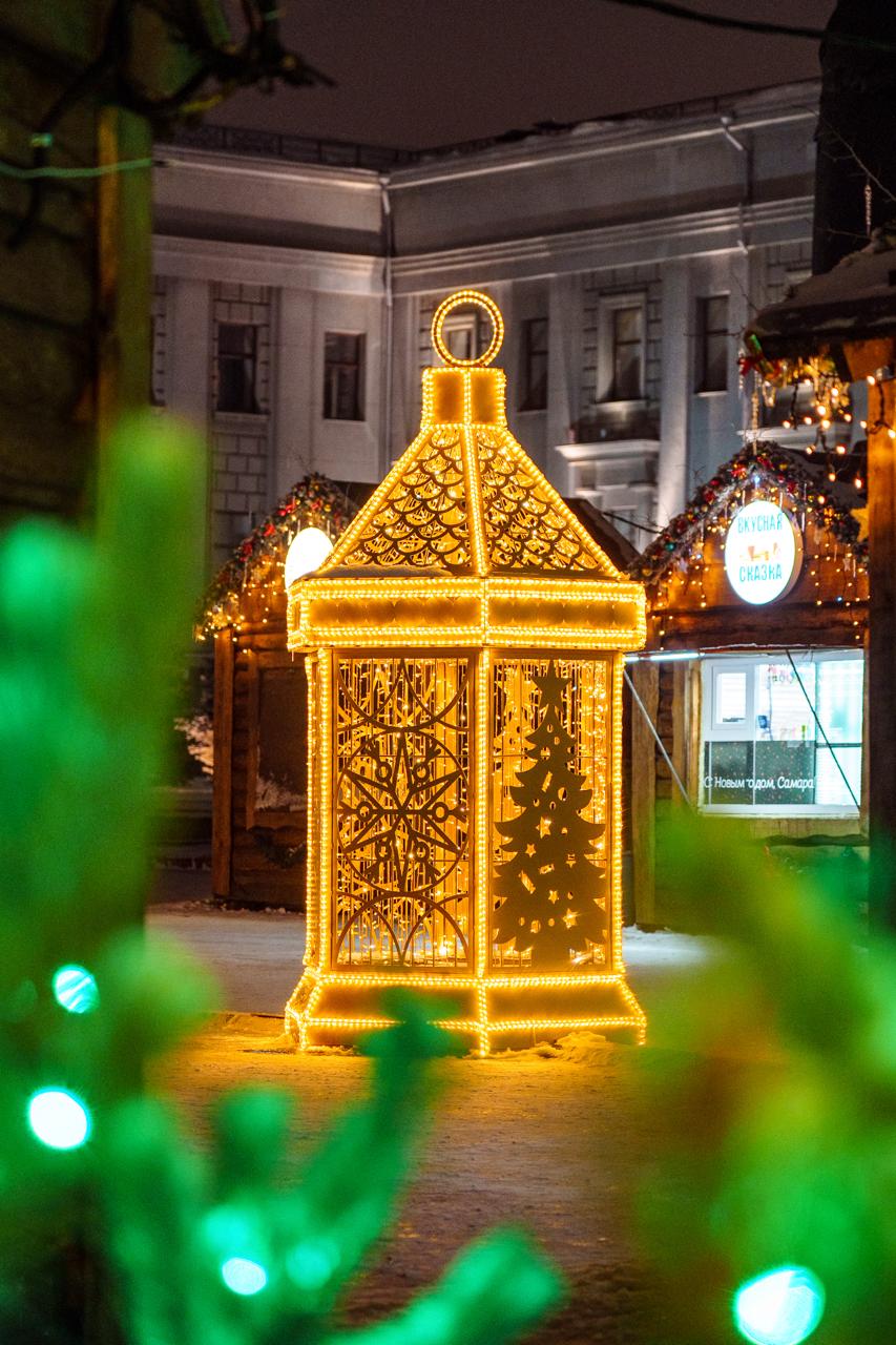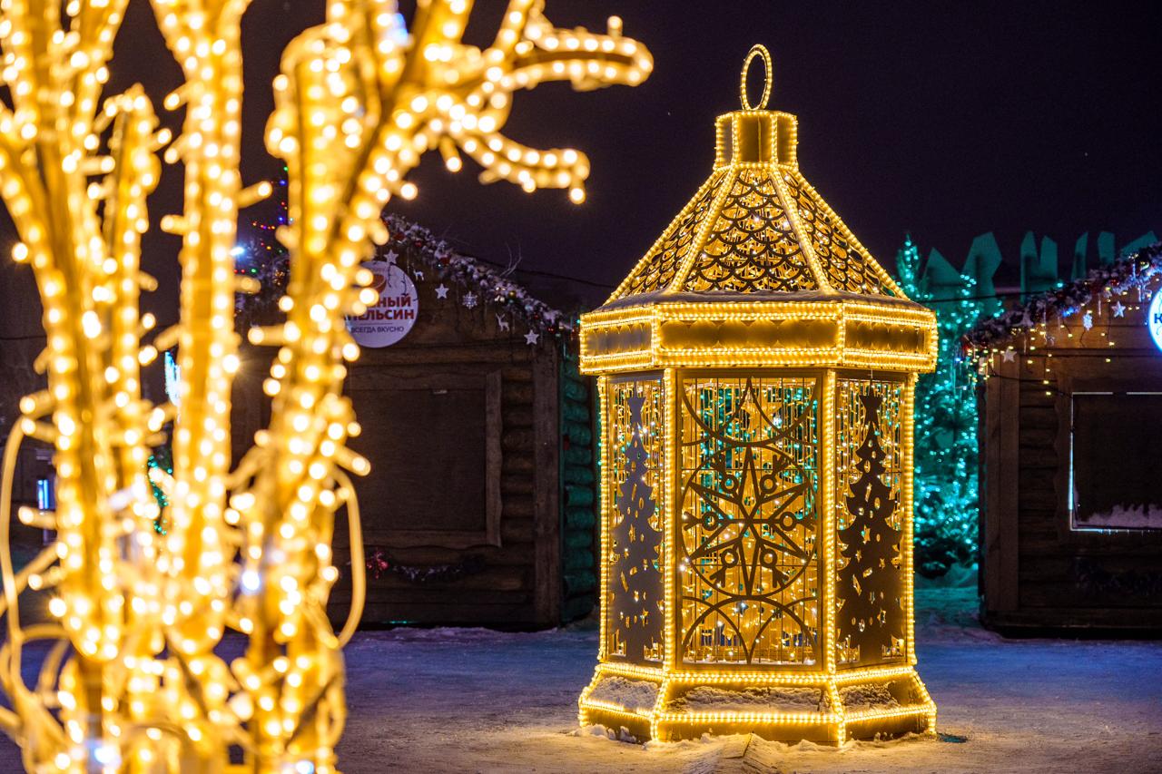 В центре города установлены крупные световые фигуры в форме фонарей. Конструкции выполнены из металлического каркаса и украшены светодиодными гирляндами тёплого оттенка. Вечером фонари создают уютное свечение и становятся ярким акцентом зимнего оформления города.