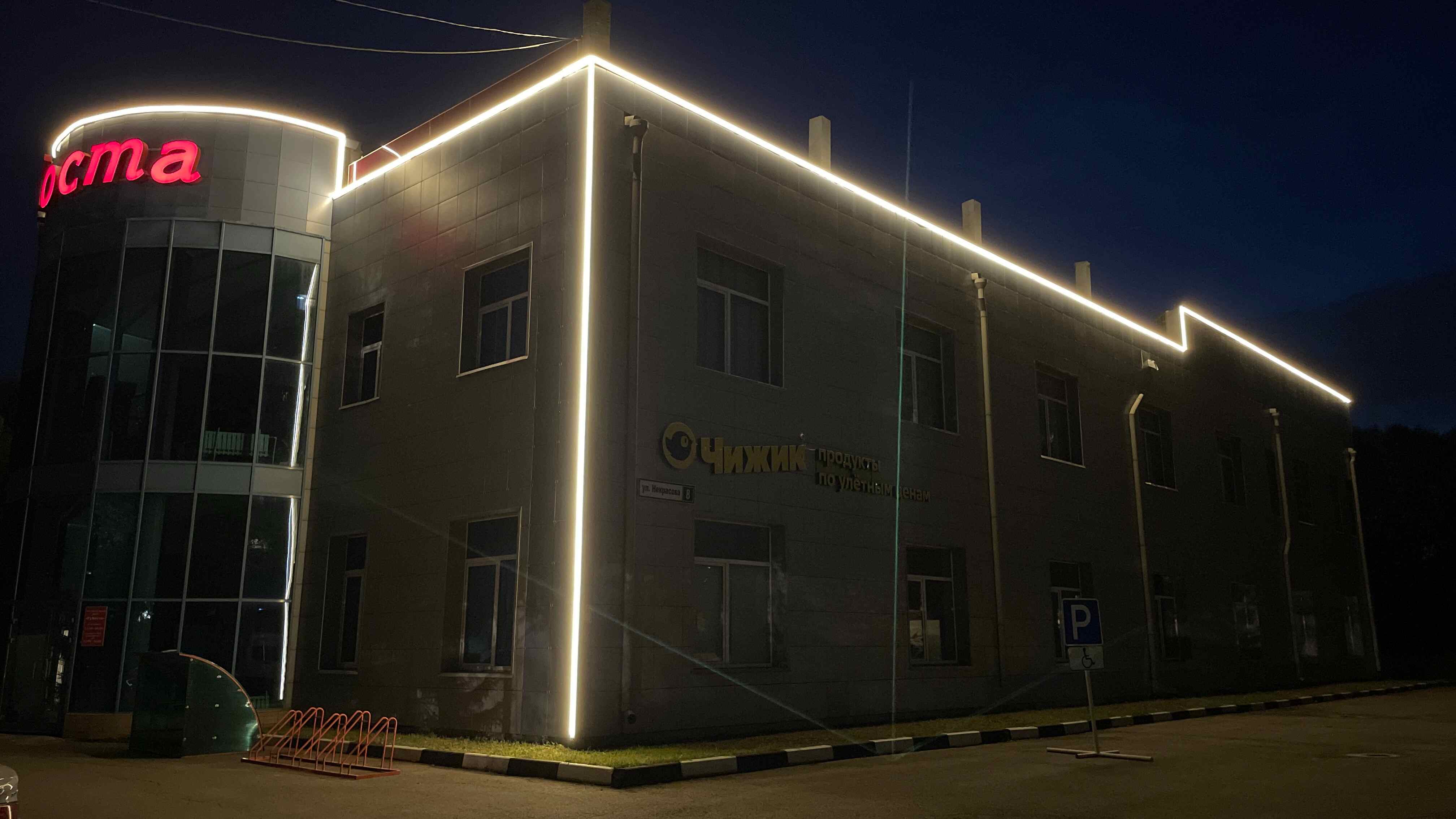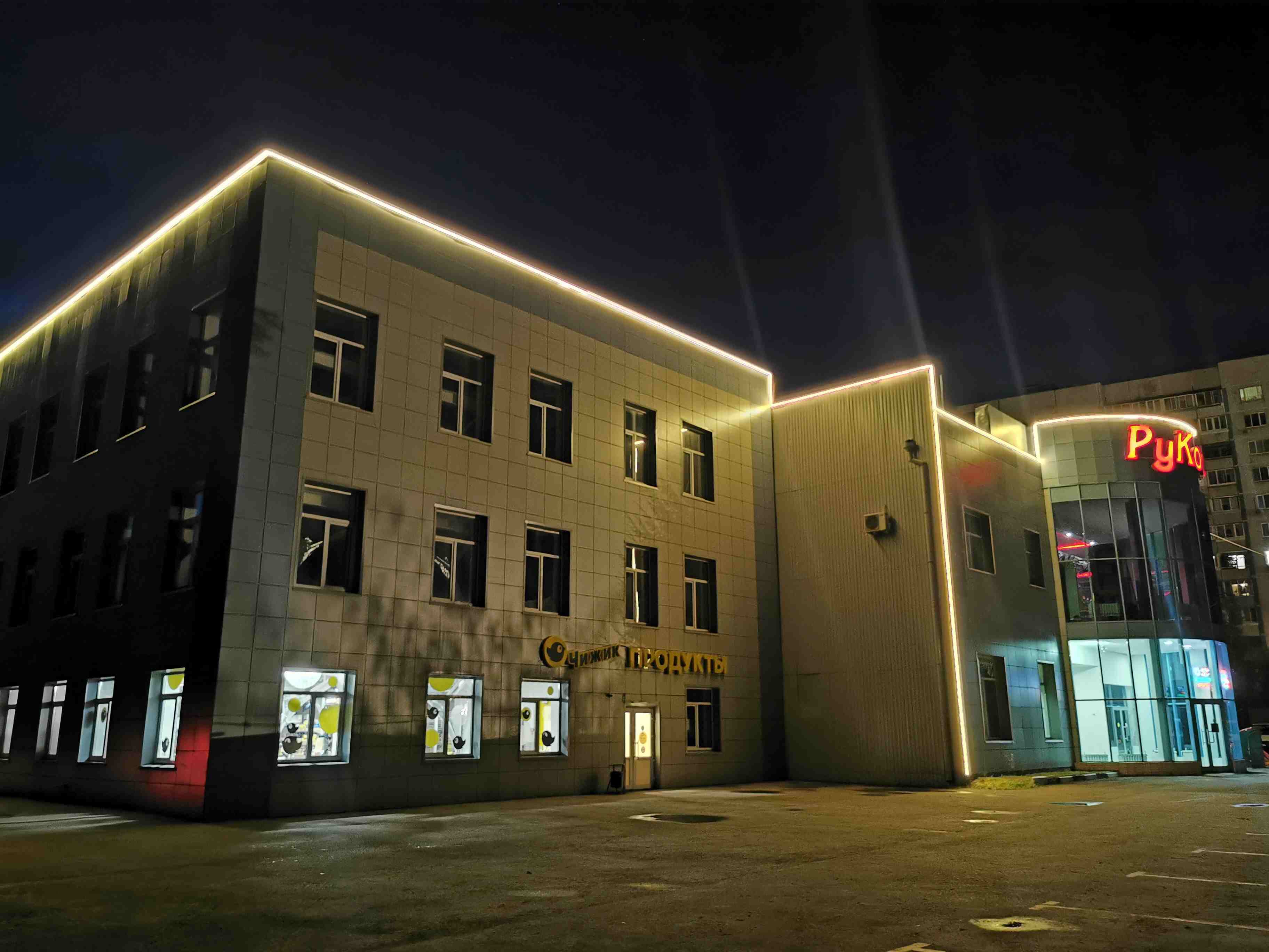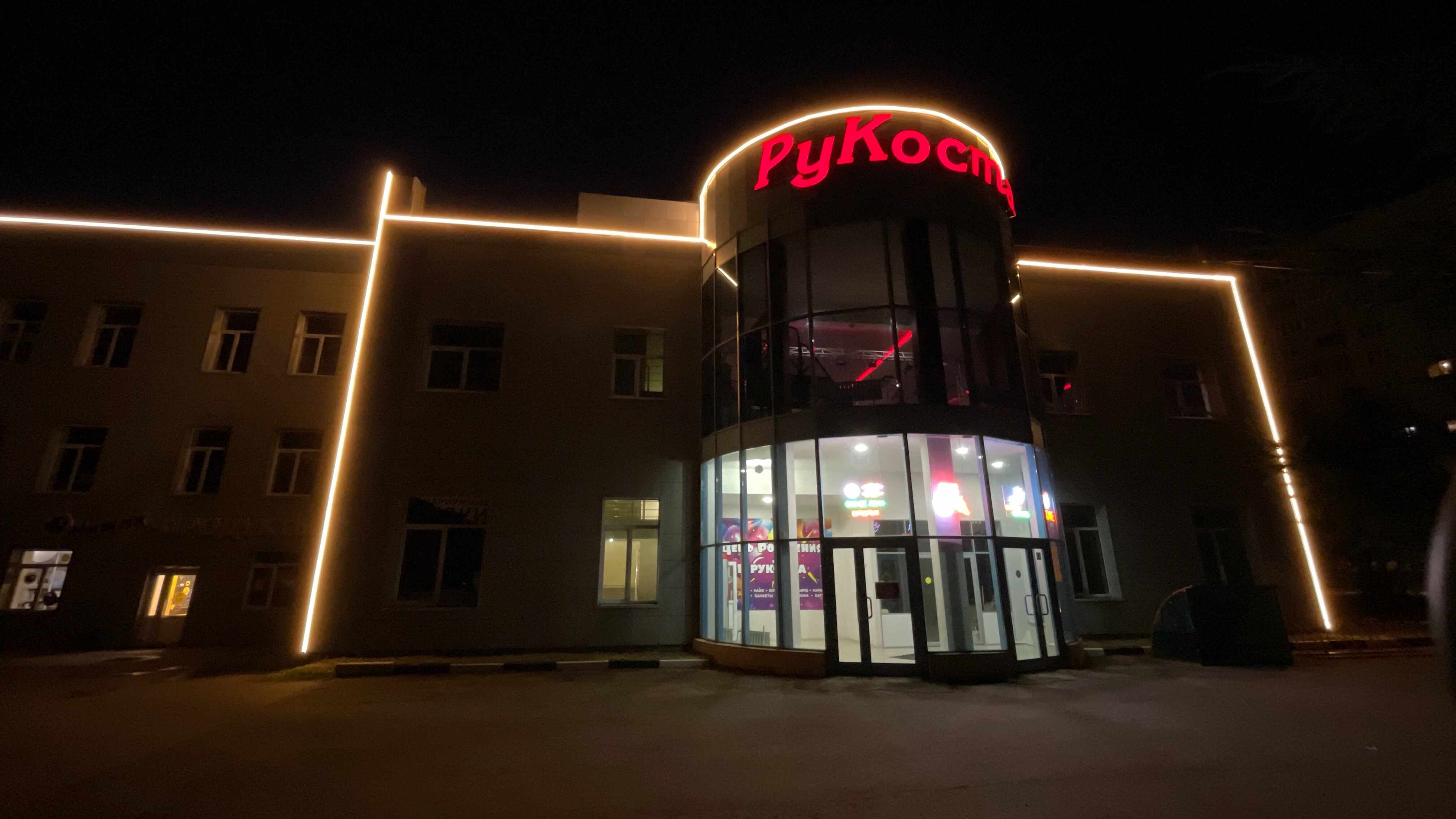 В Лобне к нам обратился владелец торгового центра «Рукоста» с задачей выделить здание на фоне местной застройки и сделать его заметным в тёмное время суток. Требовалось подчеркнуть архитектуру так, чтобы фасад выглядел выразительно, но при этом не перегруженно. Для решения мы выбрали тёплый неон, который аккуратно уложили по контуру фасада. Такое решение позволило создать мягкий световой акцент, который считывается с расстояния и делает здание заметным, сохраняя при этом лаконичность и эстетику.