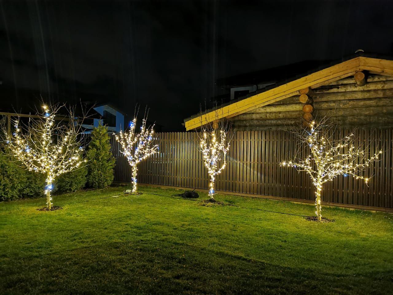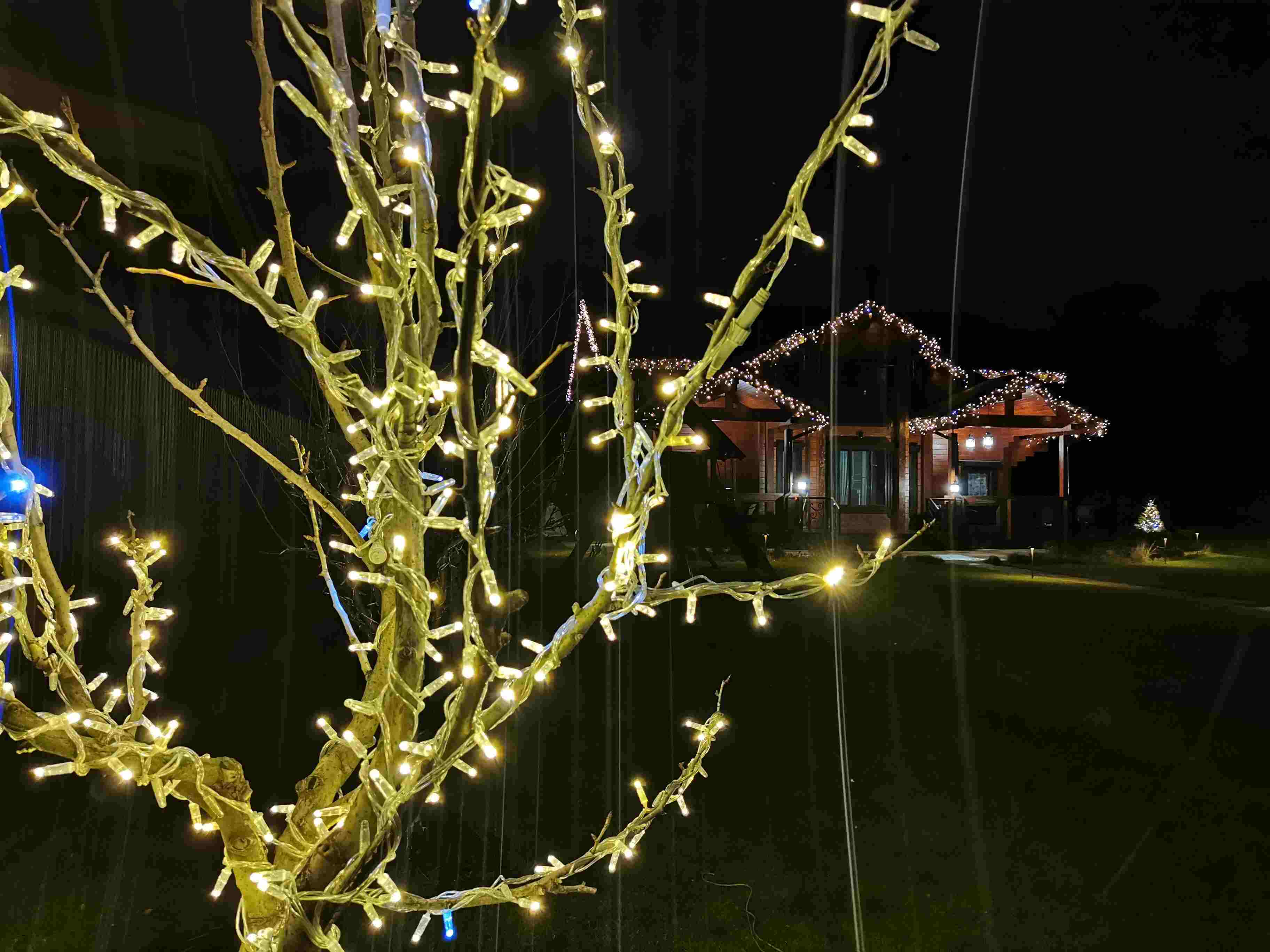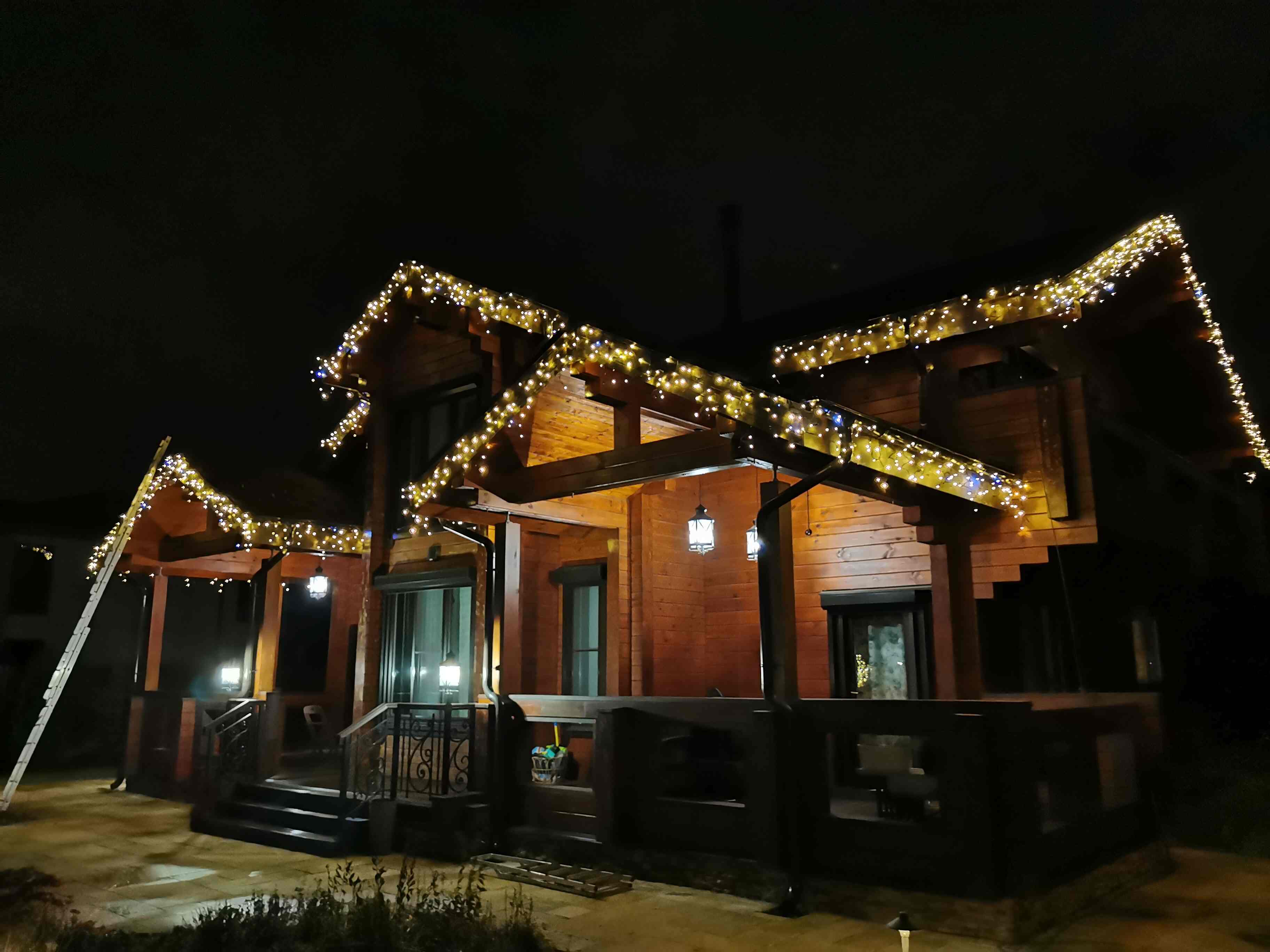 В Мартемьяново мы оформили частный дом и прилегающую территорию, сделав акцент на уют и праздничную атмосферу. На фасад смонтировали гирлянду-бахрому, которая подчёркивает линии здания и добавляет выразительности в вечернее время. Дополнительно украсили ёлку и деревья на участке гирляндой-нитью. Они не только усилили ощущение праздника, но и стали дополнительным источником мягкого освещения на территории.
