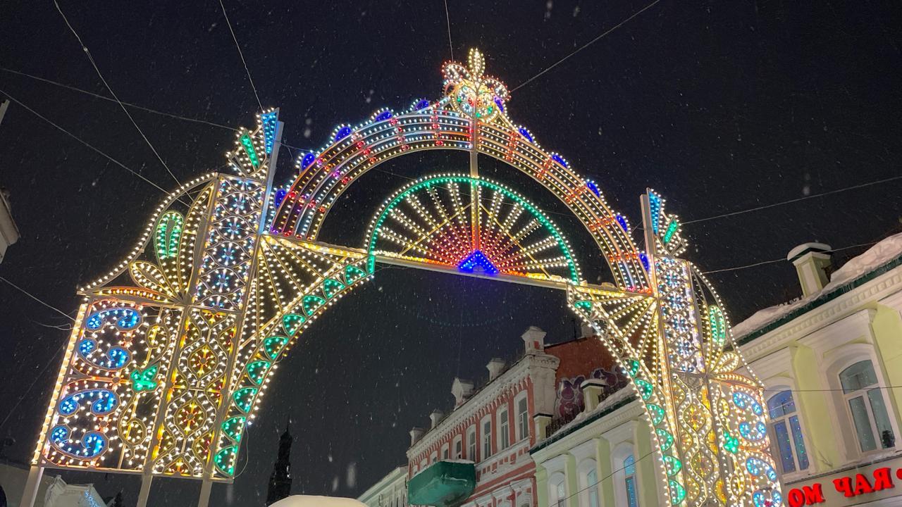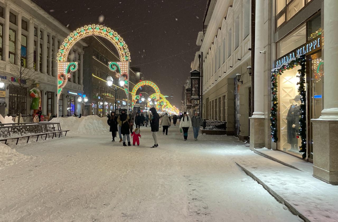 Вечером улица превращается в место притяжения — свет создаёт купол, под которым хочется прогуливаться и фотографироваться. В сочетании с падающим снегом арки выглядят как декорация рождественского фильма — лёгкое сияние, музыка, люди, праздник.