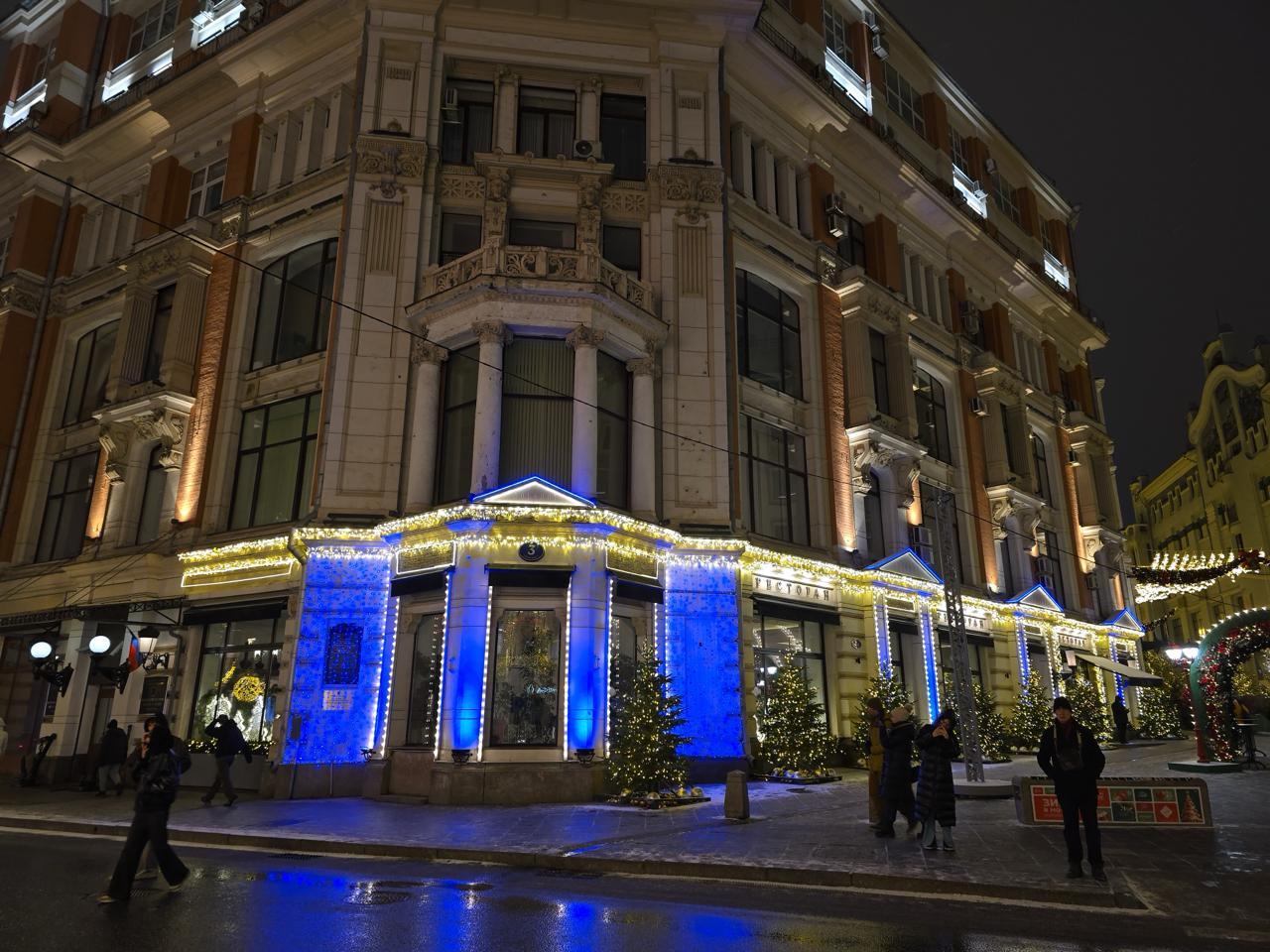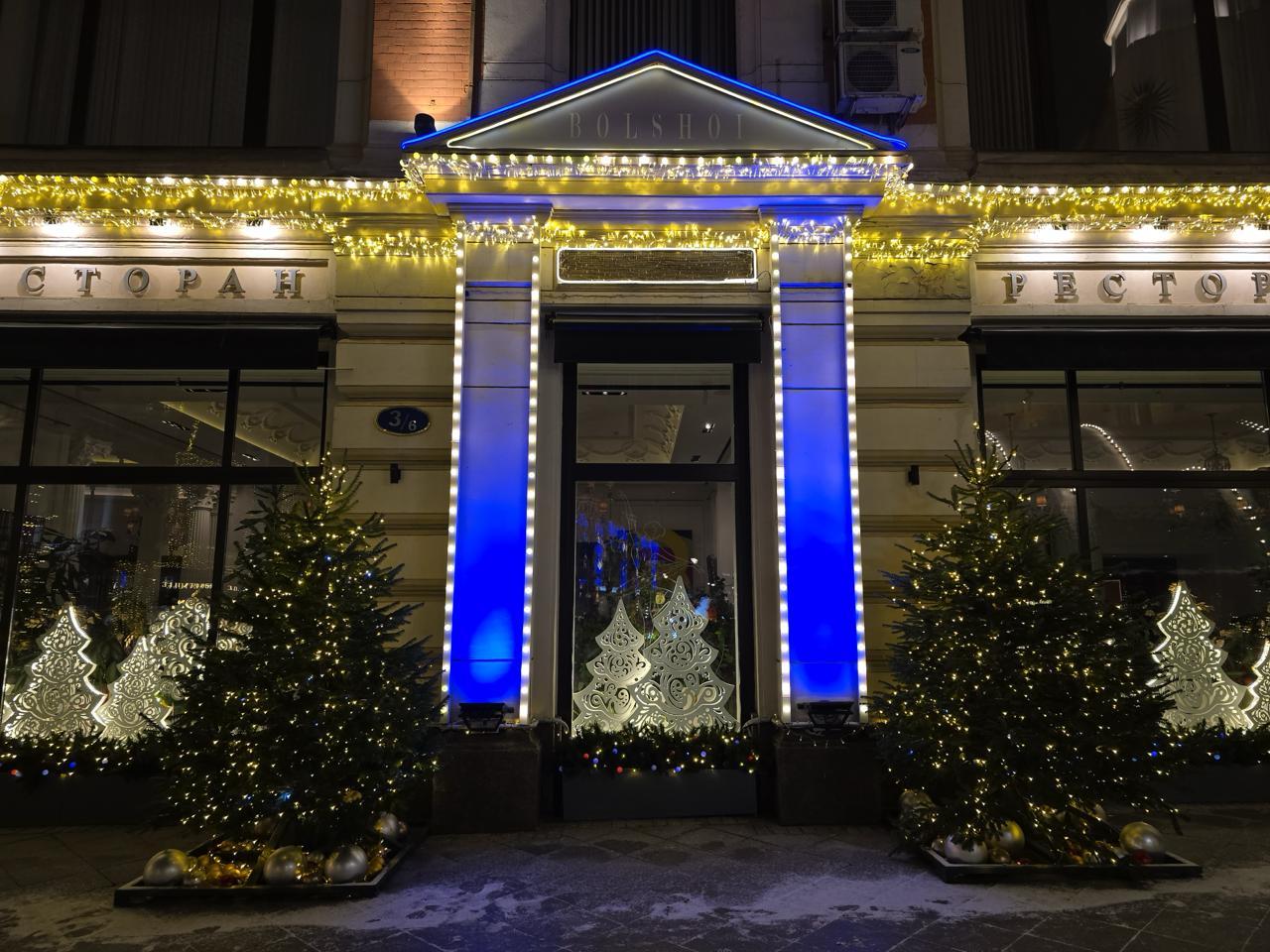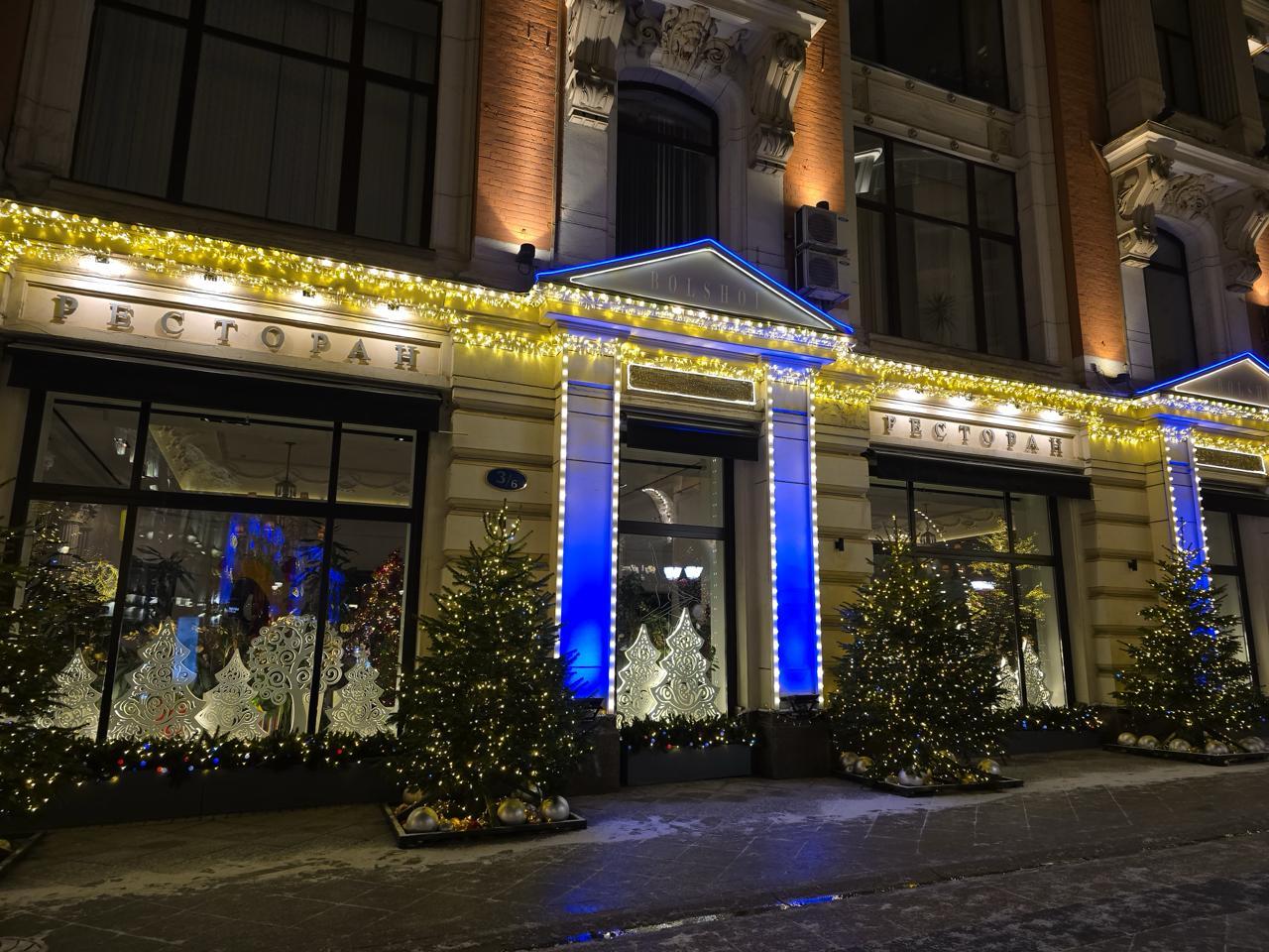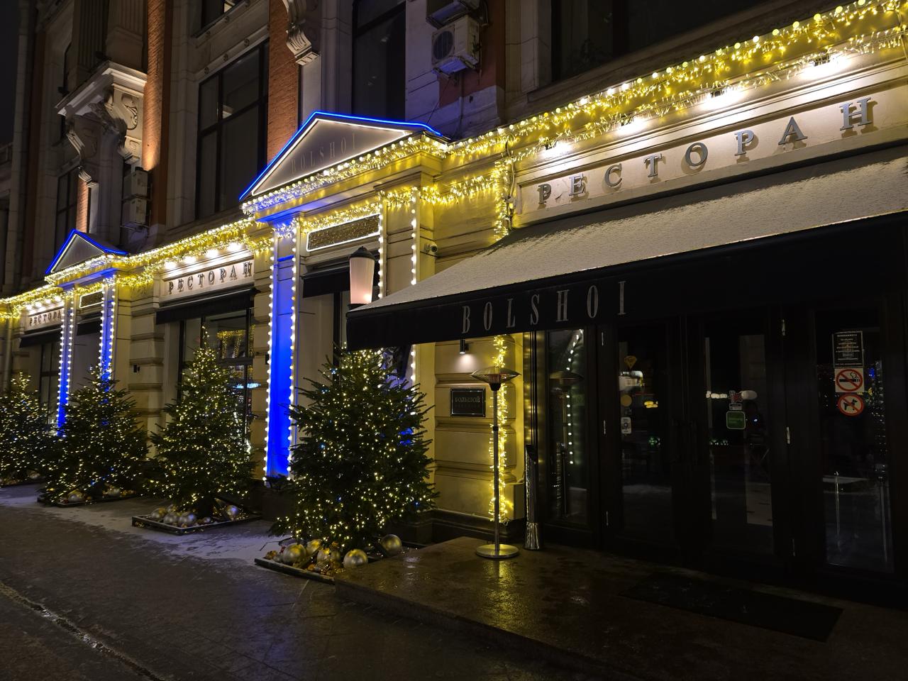 Фасад ресторана «Большой» в Москве украшен комбинацией световых решений. По линиям здания проложен белт-лайт, создающий яркий контур, а по карнизам — тёплая гирлянда-бахрома. Колонны подчеркнуты акцентной подсветкой в синем оттенке, а у входа установлены ели, украшенные гирляндой-нитью. Такое оформление делает фасад выразительным и праздничным.