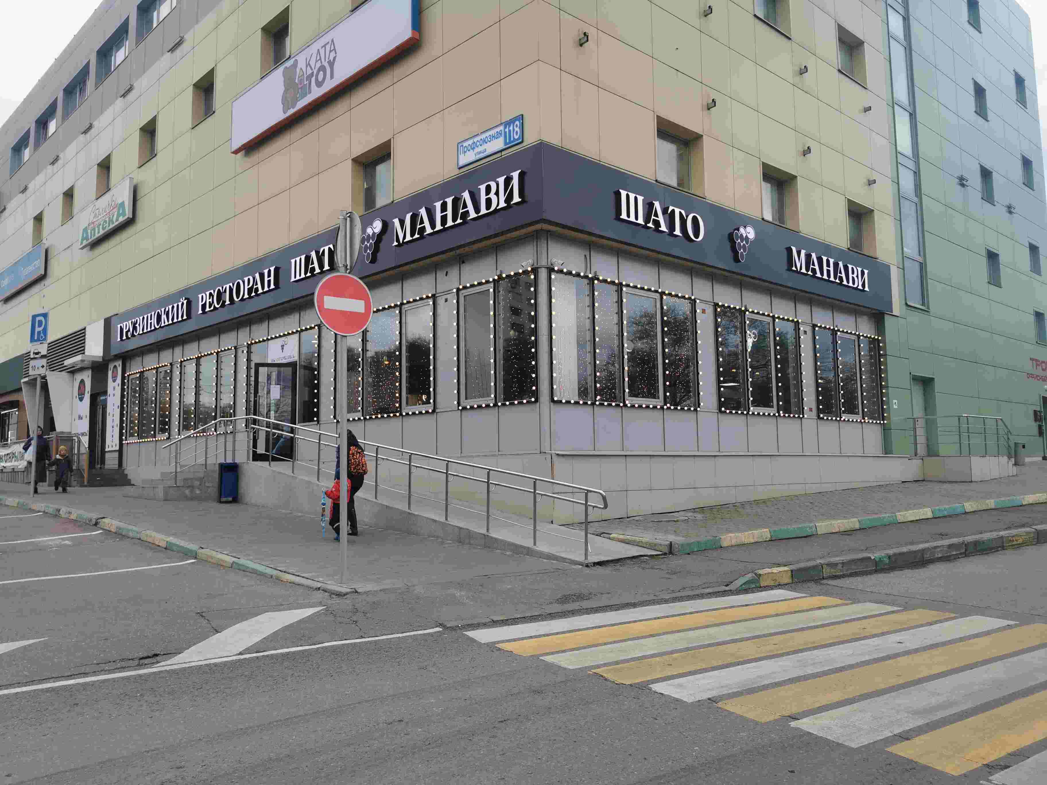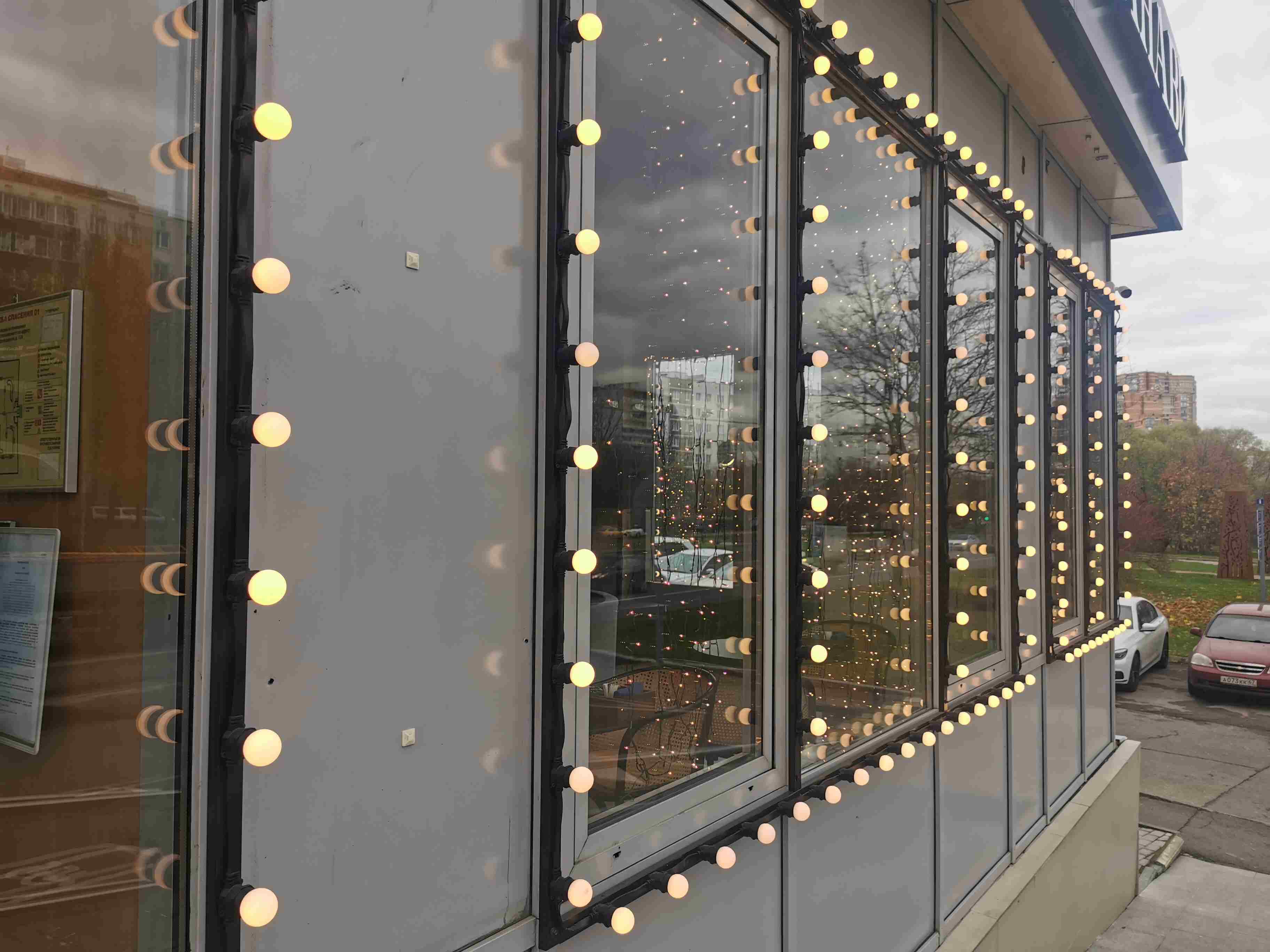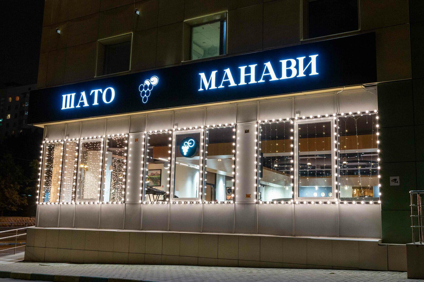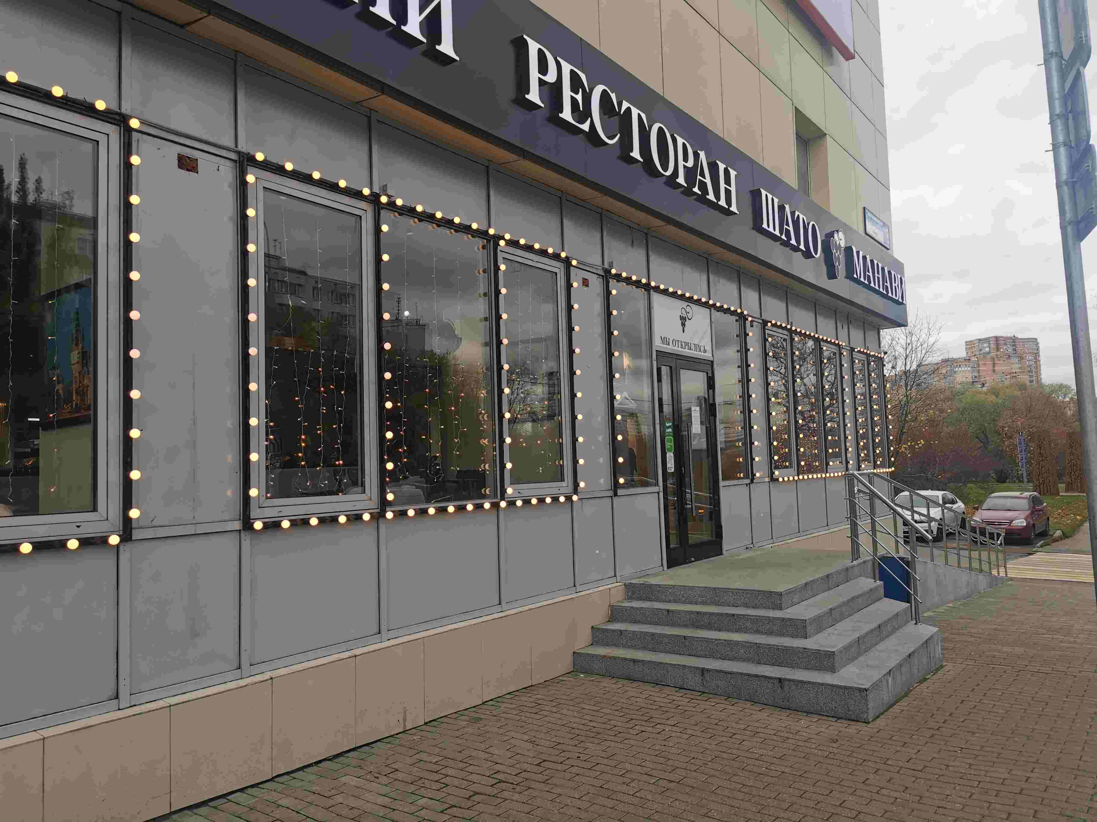 Фасад ресторана грузинской кухни «Шато Манави» оформлен гирляндой белт-лайт. Лампочки тёплого оттенка обрамляют окна по периметру, делая ресторан заметным и привлекательным в вечернее время.