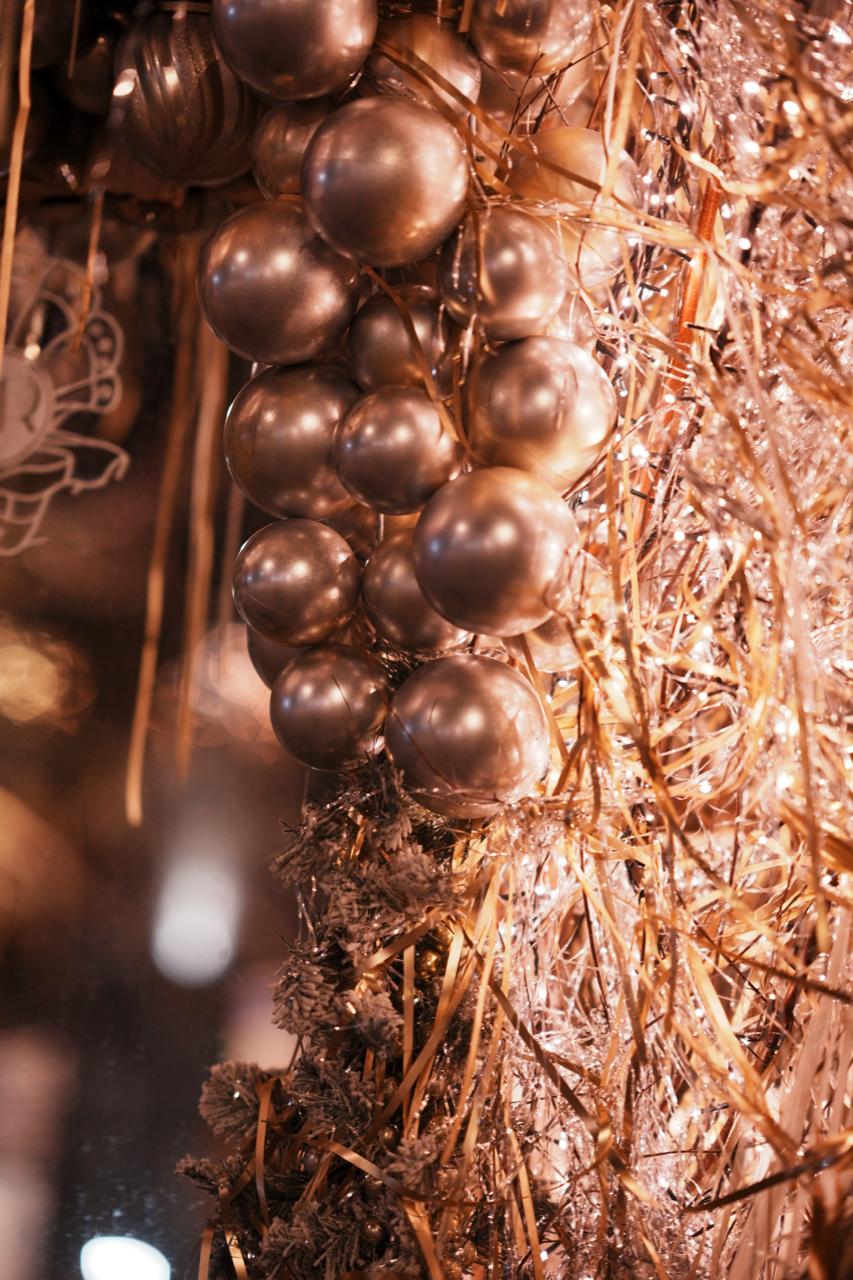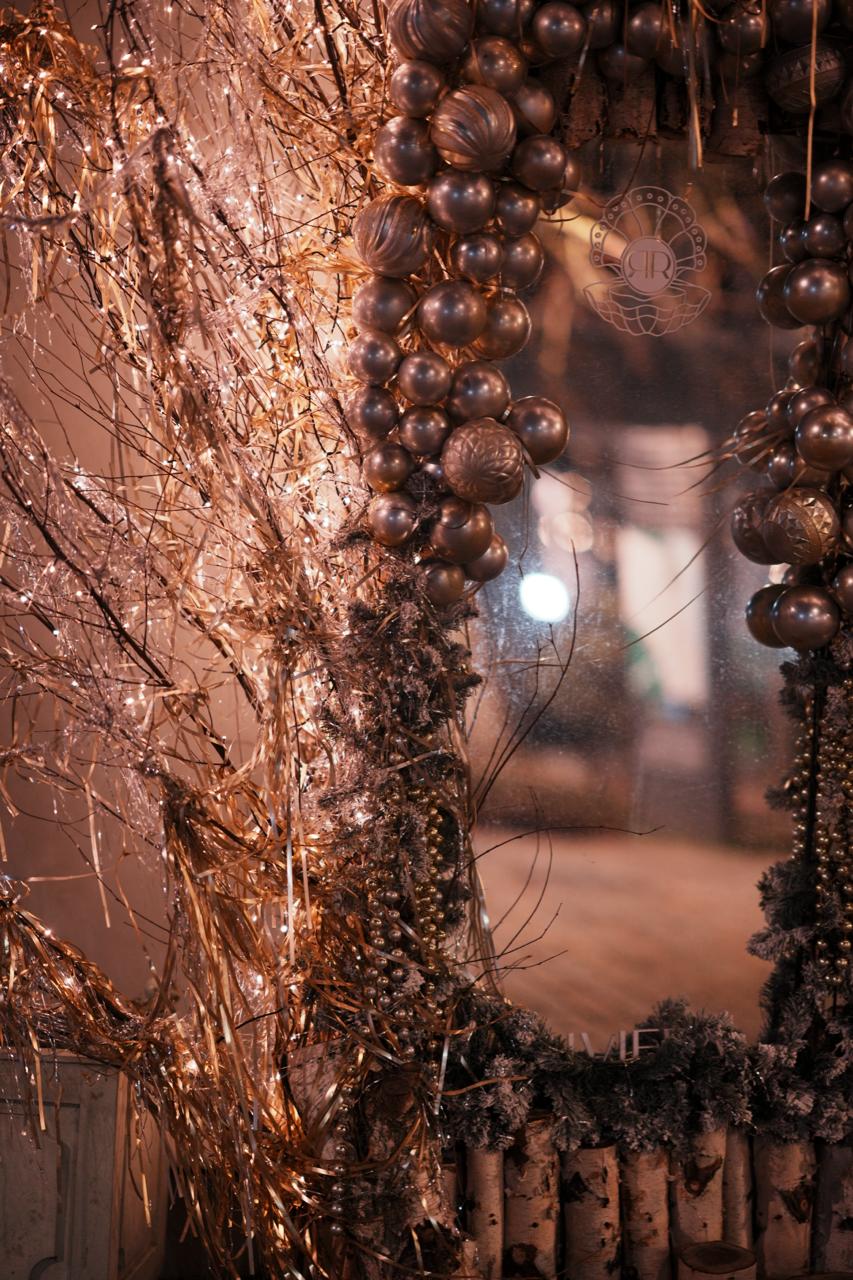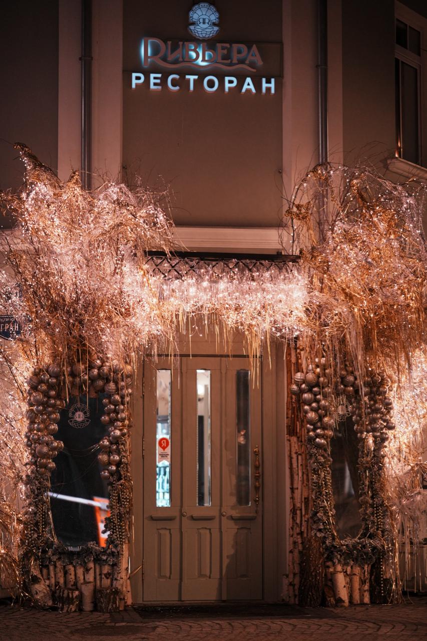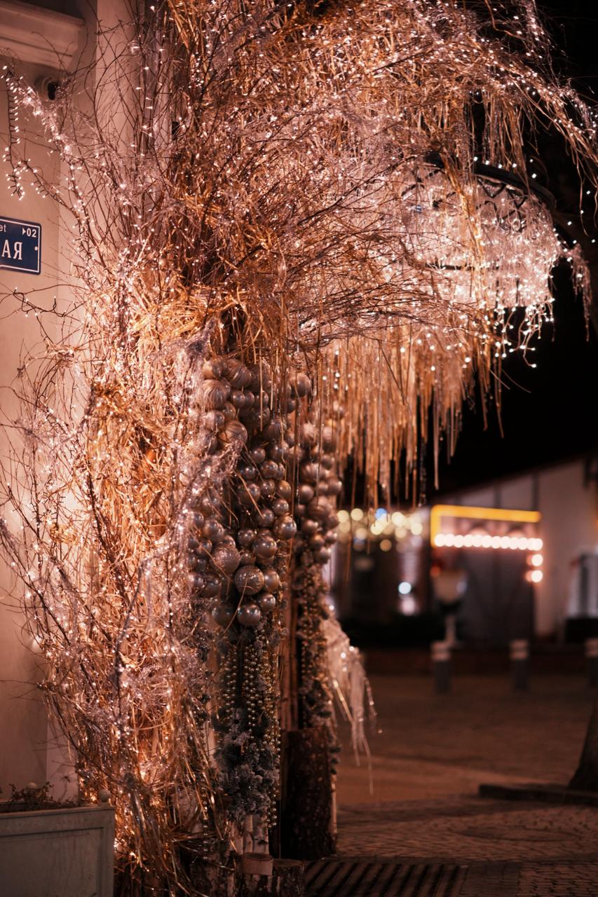 Входная зона ресторана украшена в бронзово-золотой цветовой гамме. Композиция построена на сочетании декоративных ветвей, шаров разных размеров и мягкой светодиодной подсветки. Тёплое сияние гирлянд подчёркивает текстуру материалов и создаёт атмосферу уюта и торжественности.