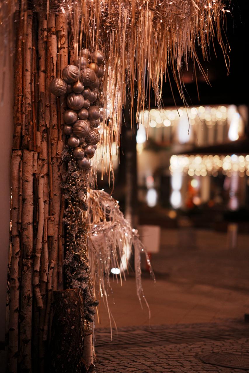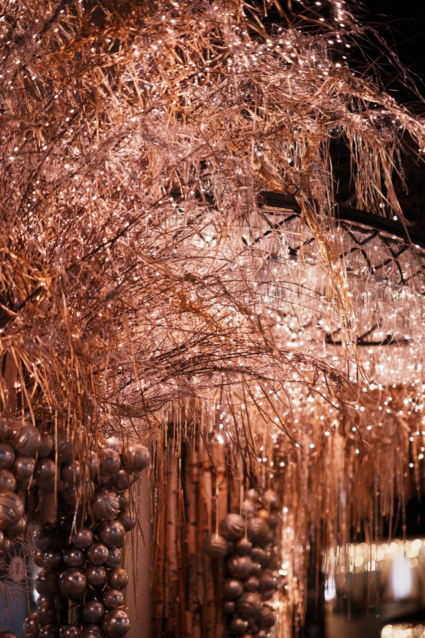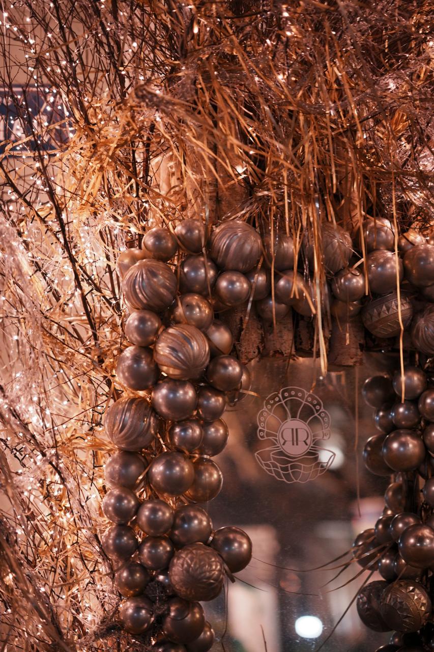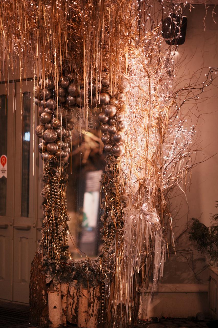 Входная зона ресторана украшена в бронзово-золотой цветовой гамме. Композиция построена на сочетании декоративных ветвей, шаров разных размеров и мягкой светодиодной подсветки. Тёплое сияние гирлянд подчёркивает текстуру материалов и создаёт атмосферу уюта и торжественности.