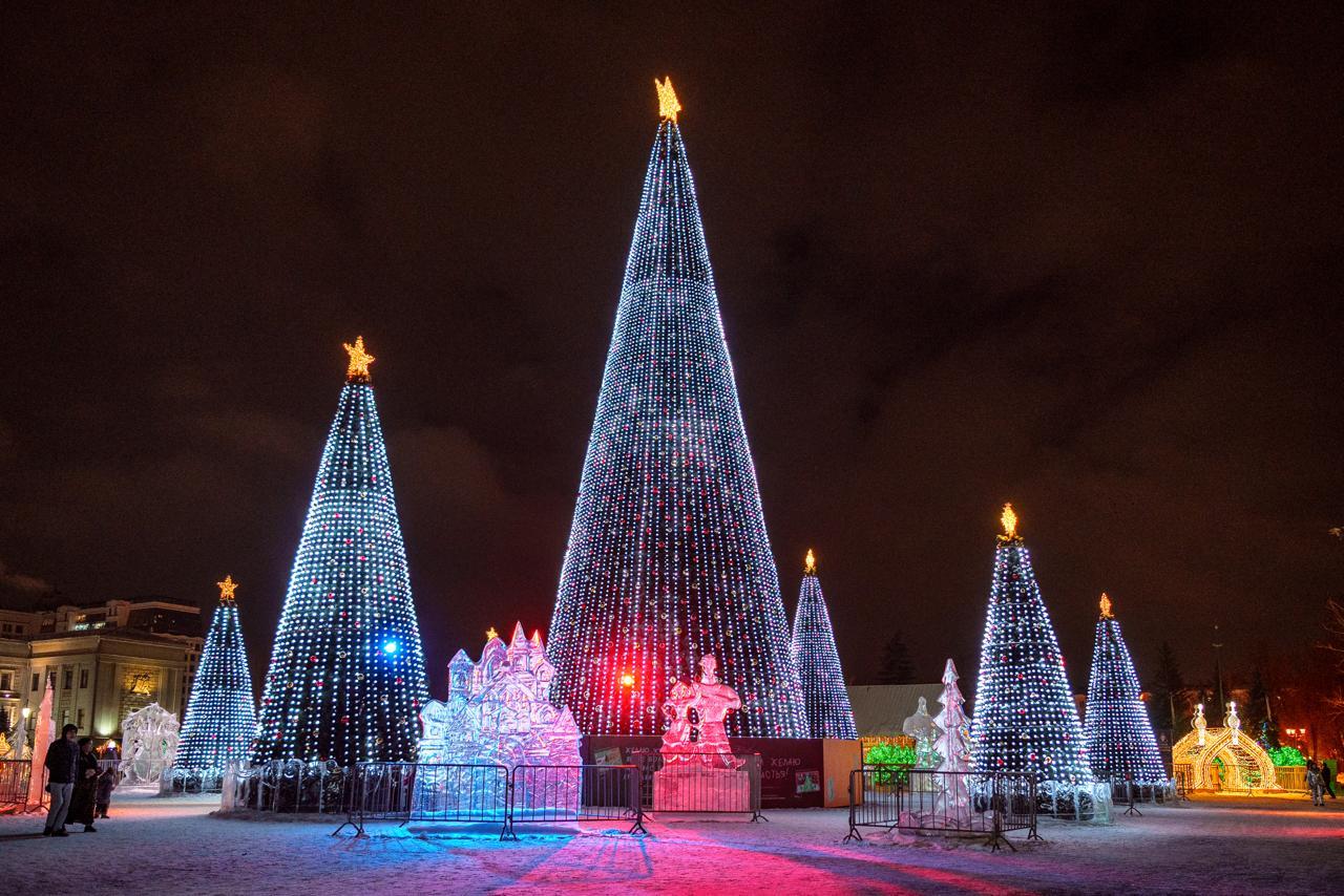 На центральной площади города создана масштабная новогодняя инсталляция. Композиция включает искусственные ели разной высоты, украшенные динамической подсветкой, ледяные скульптуры и световые фигуры. Такое решение объединило архитектурный свет, декоративное искусство и праздничную атмосферу, превратив площадь в место притяжения жителей и туристов.