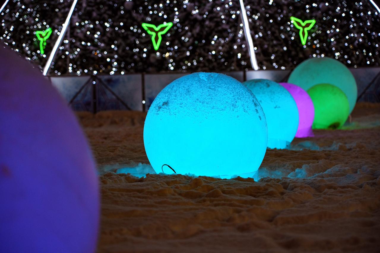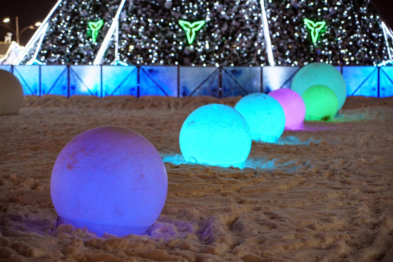 Парк украшен крупными световыми шарами, расположенными вдоль пешеходных дорожек и открытых площадок. Мягкое свечение в голубых, фиолетовых и зелёных тонах создаёт эффект «ожившего снега» и подчёркивает современный стиль зимнего оформления.
