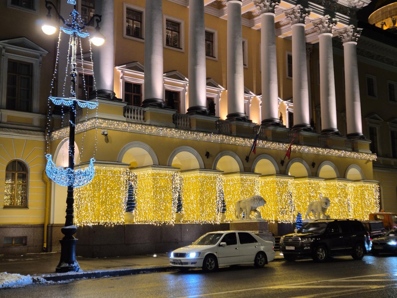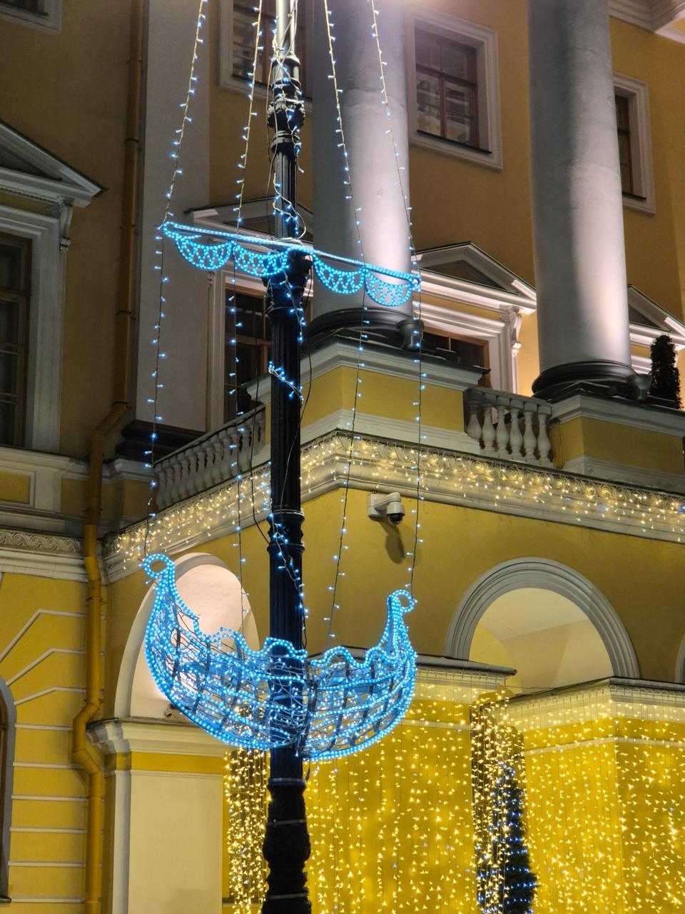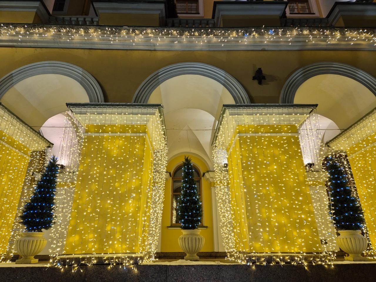 Фасад муниципального здания украшен бахромой тёплого оттенка разной длины, которая подчеркнула величественную архитектуру колонн и карнизов. Дополнительный акцент создала консоль в виде корабля с мачтой голубого цвета, а между колоннами установлены искусственные ёлки, декорированные гирляндой-нитью в холодном голубом свечении. Такое сочетание сделало здание праздничным и выразительным, сохранив при этом элегантность и торжественность.