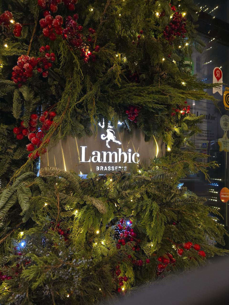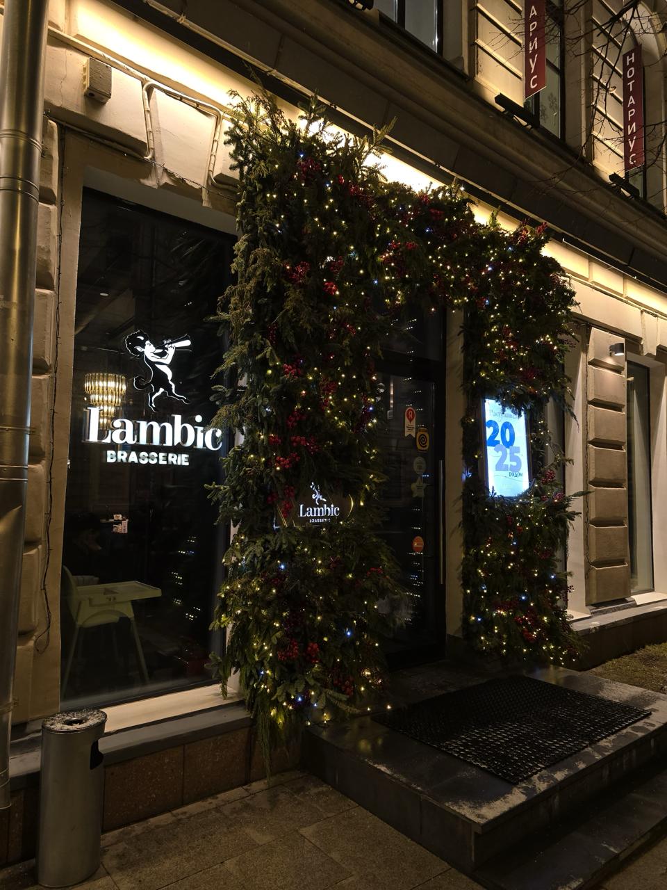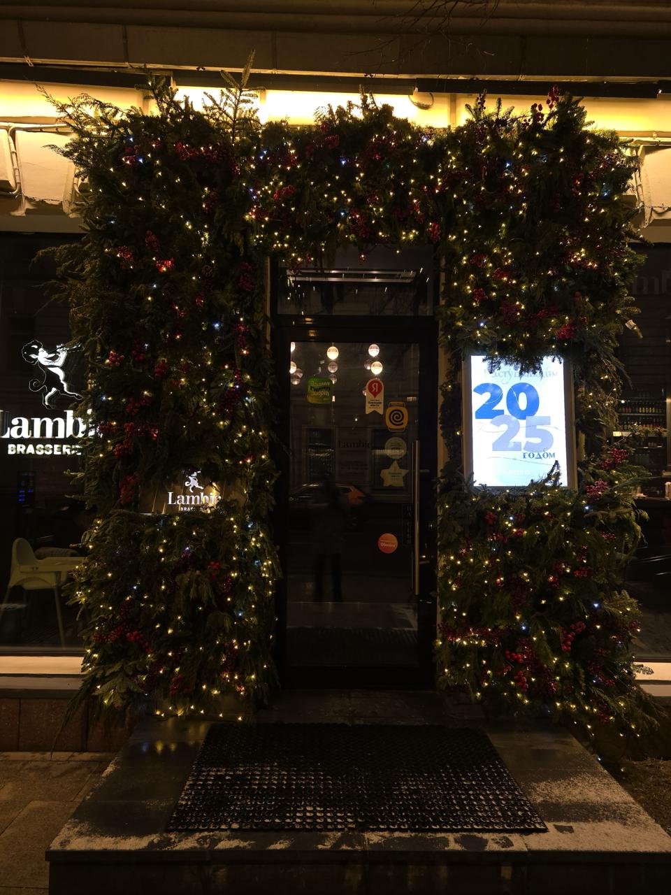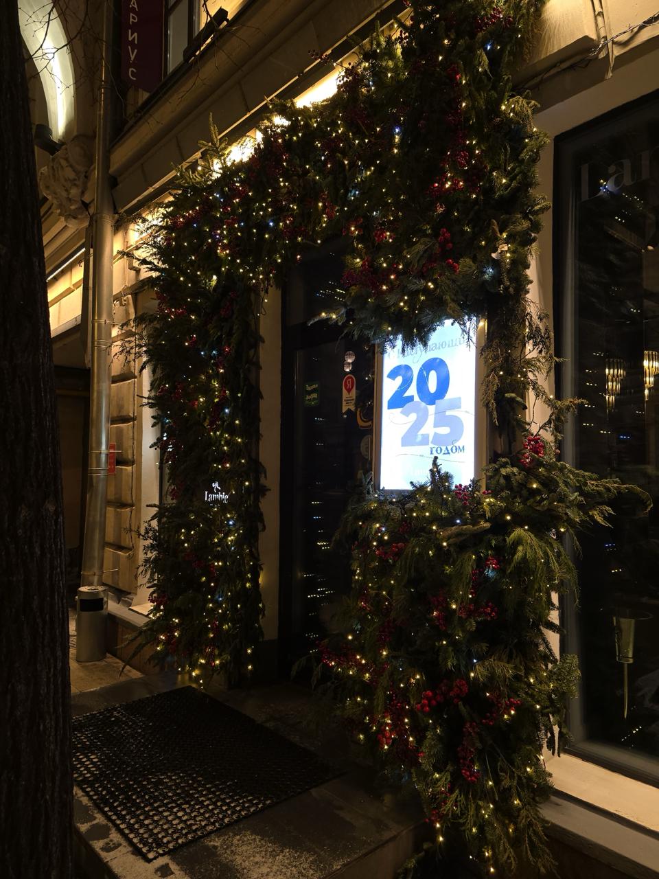 Входная группа ресторана оформлена объёмной хвойной аркой с гирляндой тёплого белого света. В композиции использованы еловые ветви, красные ягоды и мягкое свечение гирлянд. Такое оформление создаёт ощущение тепла и праздника, подчёркивает стиль фасада и приглашает гостей внутрь.