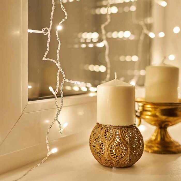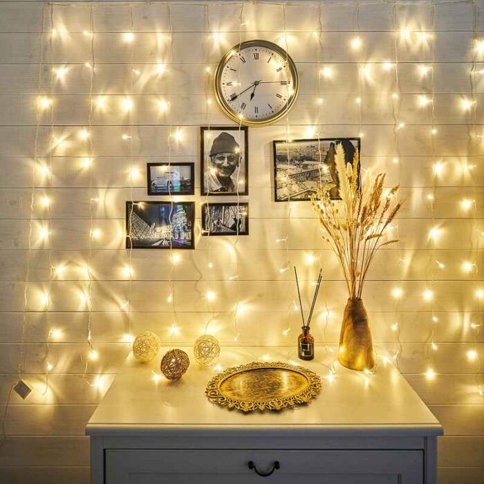 Основой гирлянды служит прозрачный провод из прочного ПВХ, на котором размещены 144 светодиода. Такое исполнение делает конструкцию практически незаметной на фоне стены, окна или елки. Светодиоды распределены равномерно, создавая аккуратное и симметричное полотно света. Размер занавеса — 1.5×1.5 м — позволяет легко адаптировать его для различных зон: оконных проемов, дверных арок, декоративных перегородок или фоновых инсталляций.