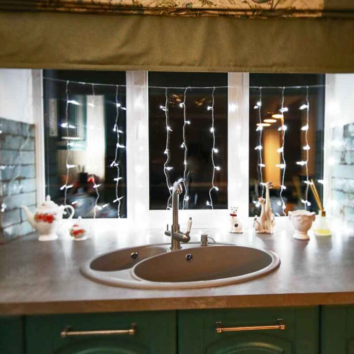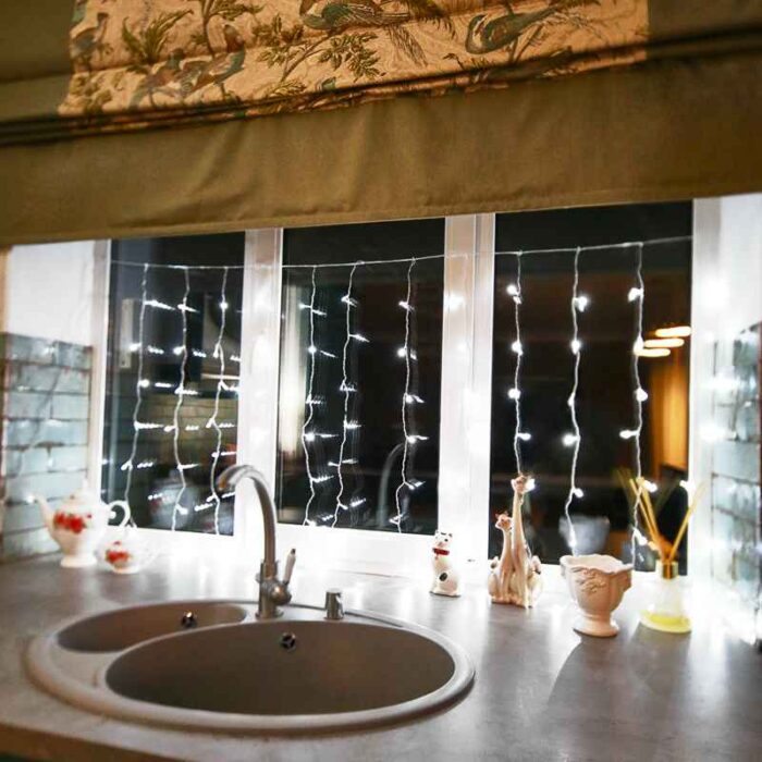 Гирлянда-занавес 1.5×1 м с белым свечением — это стильное решение для оформления интерьера. Она одинаково уместна как для новогоднего декора, так и для других праздников: корпоративных вечеринок, дней города или семейных торжеств.