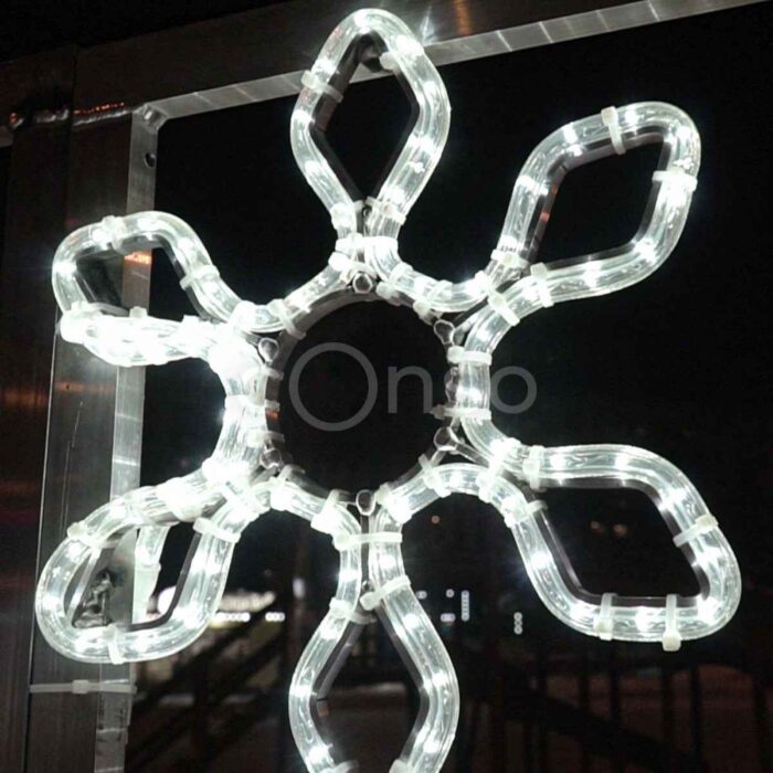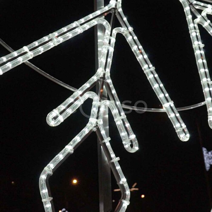 Холодное белое свечение создаёт чистый и праздничный визуальный эффект, подчёркивает грани конструкции и хорошо заметно на расстоянии. Светодиоды соединены в защищённые контуры, подключение полностью герметично и безопасно (степень защиты — IP65).