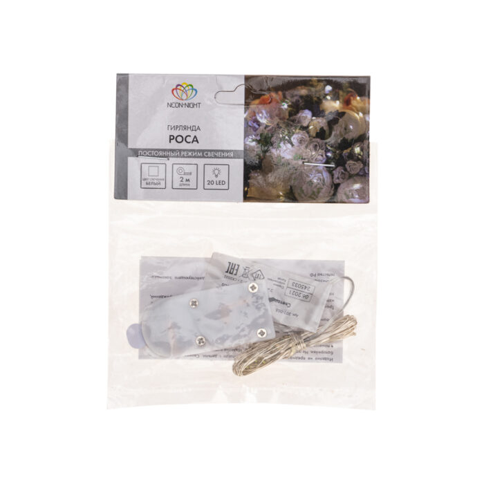 Компактная гирлянда-нить «Роса» длиной 2 м с 20 яркими белыми светодиодами. Постоянное свечение создаёт чистый, аккуратный световой акцент. Питание от батареек даёт свободу размещения без розеток. Серебристый металлический провод тонко вписывается в декор. Подходит для ёлок, интерьерных композиций, фотозон и праздничного оформления в помещении.