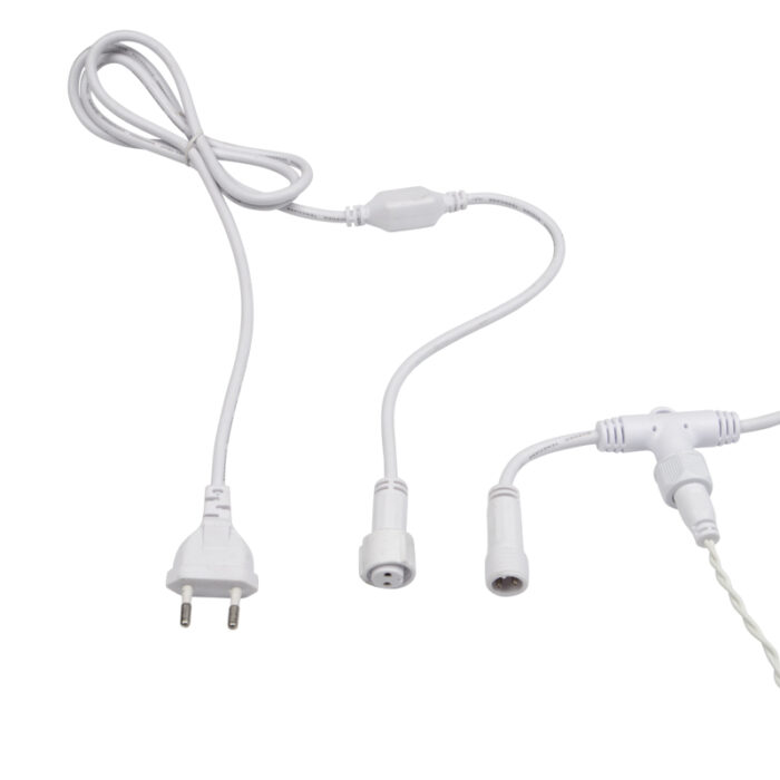 Гирлянда поддерживает соединение до 4 занавесов в одну цепь, что даёт возможность оформлять длинные фасады, протяжённые заборы или масштабные декорации. Подключение приобретается отдельно — вы можете выбрать оптимальный вариант кабеля питания под конкретный проект.