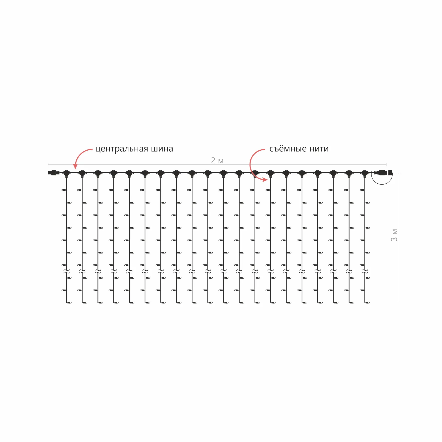 Модель поддерживает соединение до 8 занавесов в одну цепь, что позволяет оформлять масштабные объекты — длинные фасады, заборы, арочные конструкции и городские декорации. Это упрощает монтаж и делает итоговый результат цельным и гармоничным.