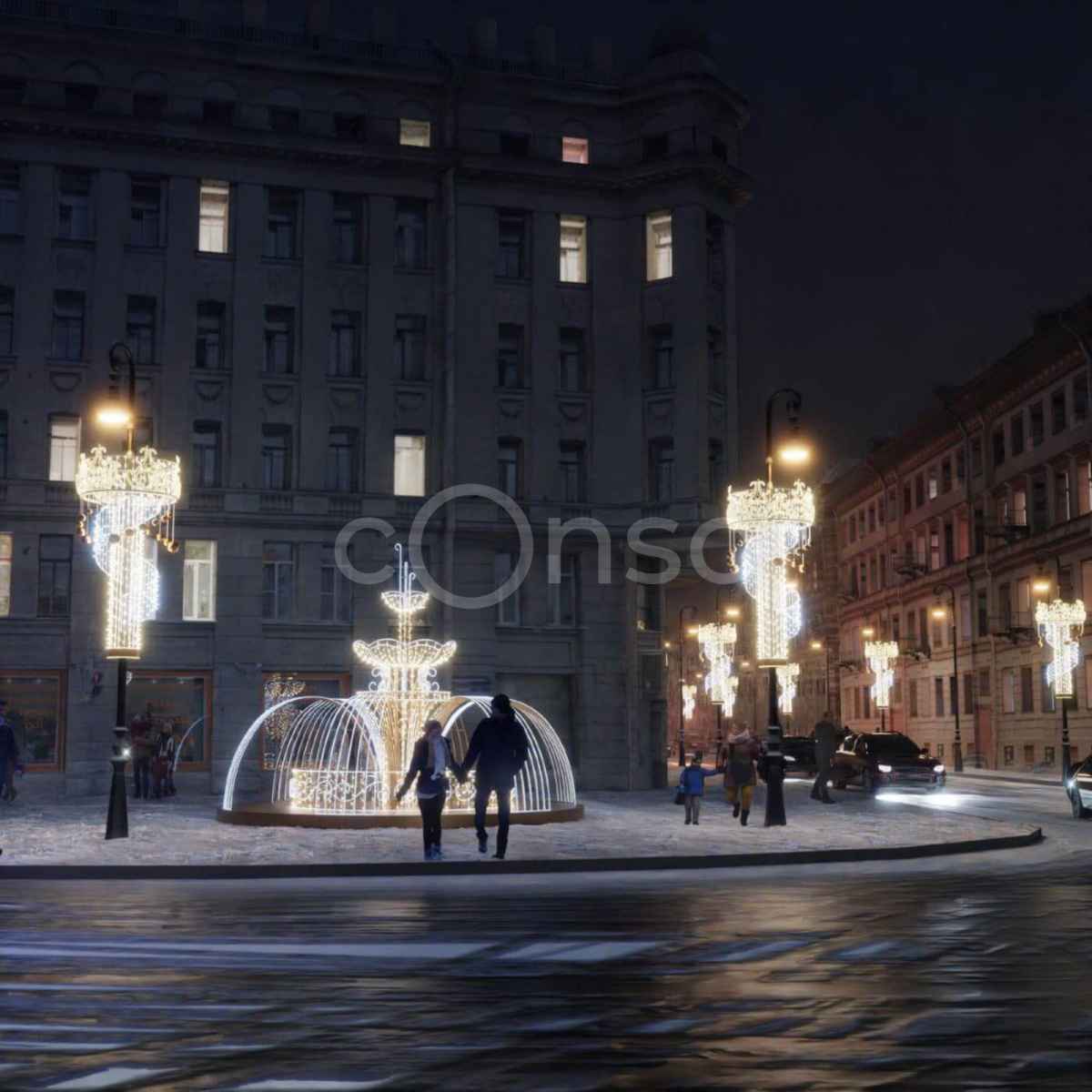 Готовое решение для праздничного оформления города — световой фонтан и 10 уличных консолей. Алюминиевый каркас, холодное и тёплое свечение, надёжная защита от влаги и мороза. Подходит для улиц, площадей, фасадов ТЦ и парков. Комплект изготавливаем под заказ, монтируем и подключаем под ключ в Москве и области.