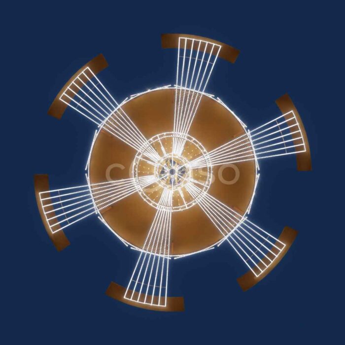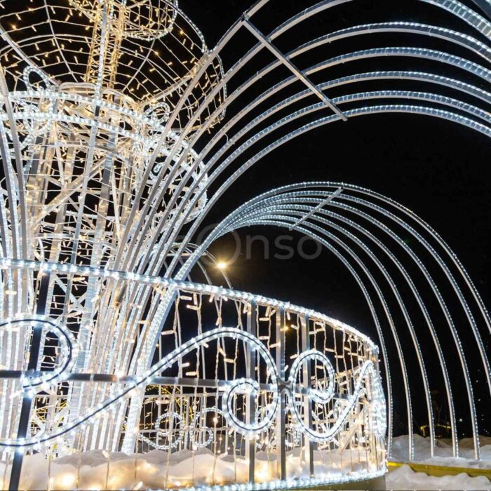 Новогодний светодиодный фонтан — это масштабная уличная световая фигура, созданная для того, чтобы преображать городскую среду, создавать атмосферу праздника и привлекать внимание с первого взгляда. Его форма напоминает настоящий фонтан: мощная струя «света» словно взлетает вверх и распадается золотыми волнами. Мерцающее свечение делает композицию «живой» и динамичной, а визуальный эффект притягивает как детей, так и взрослых.