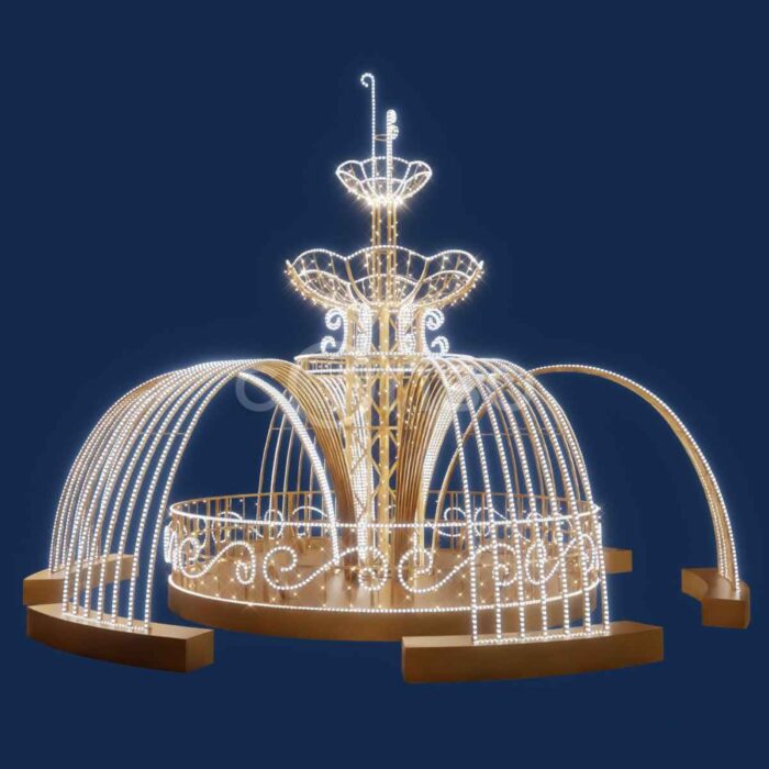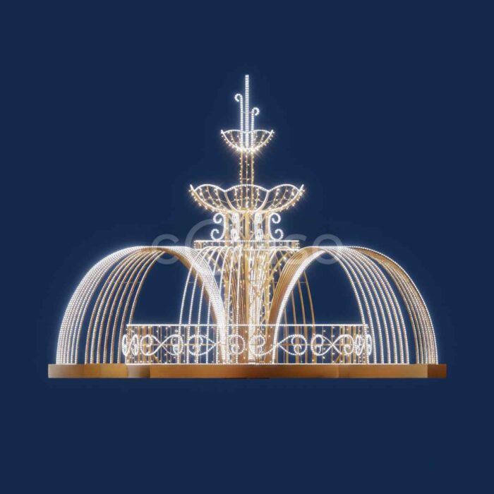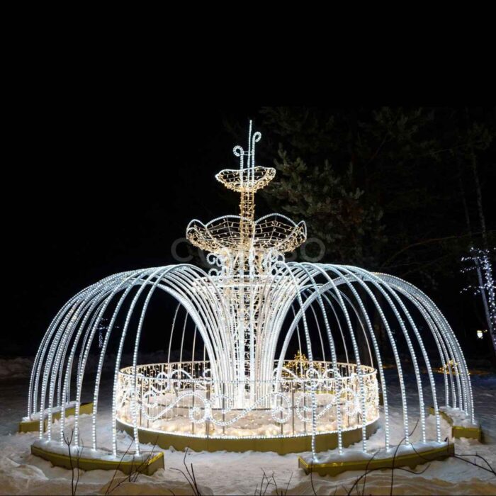 Новогодний световой фонтан — эффектная объёмная фигура для улицы. Размер 6×4,5×6 м, алюминиевый каркас, IP65, мерцающее золотое свечение. Украшает ТЦ, городские площади, входные группы. Безопасная эксплуатация круглый год. Производство и монтаж от JOYLED.
